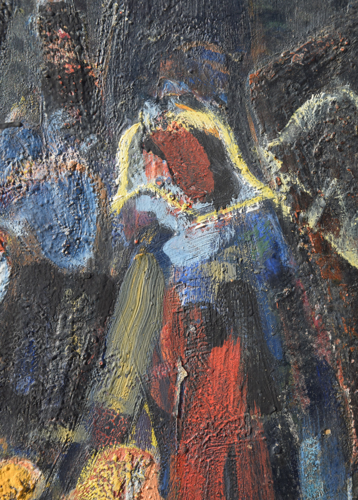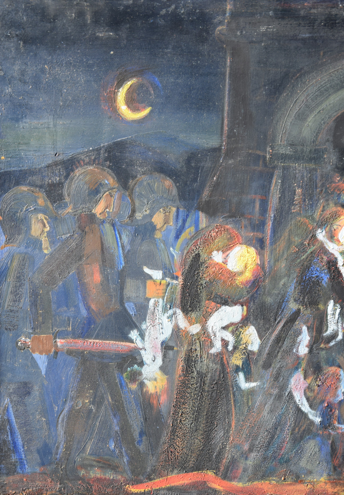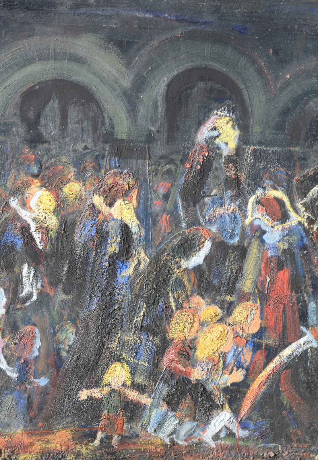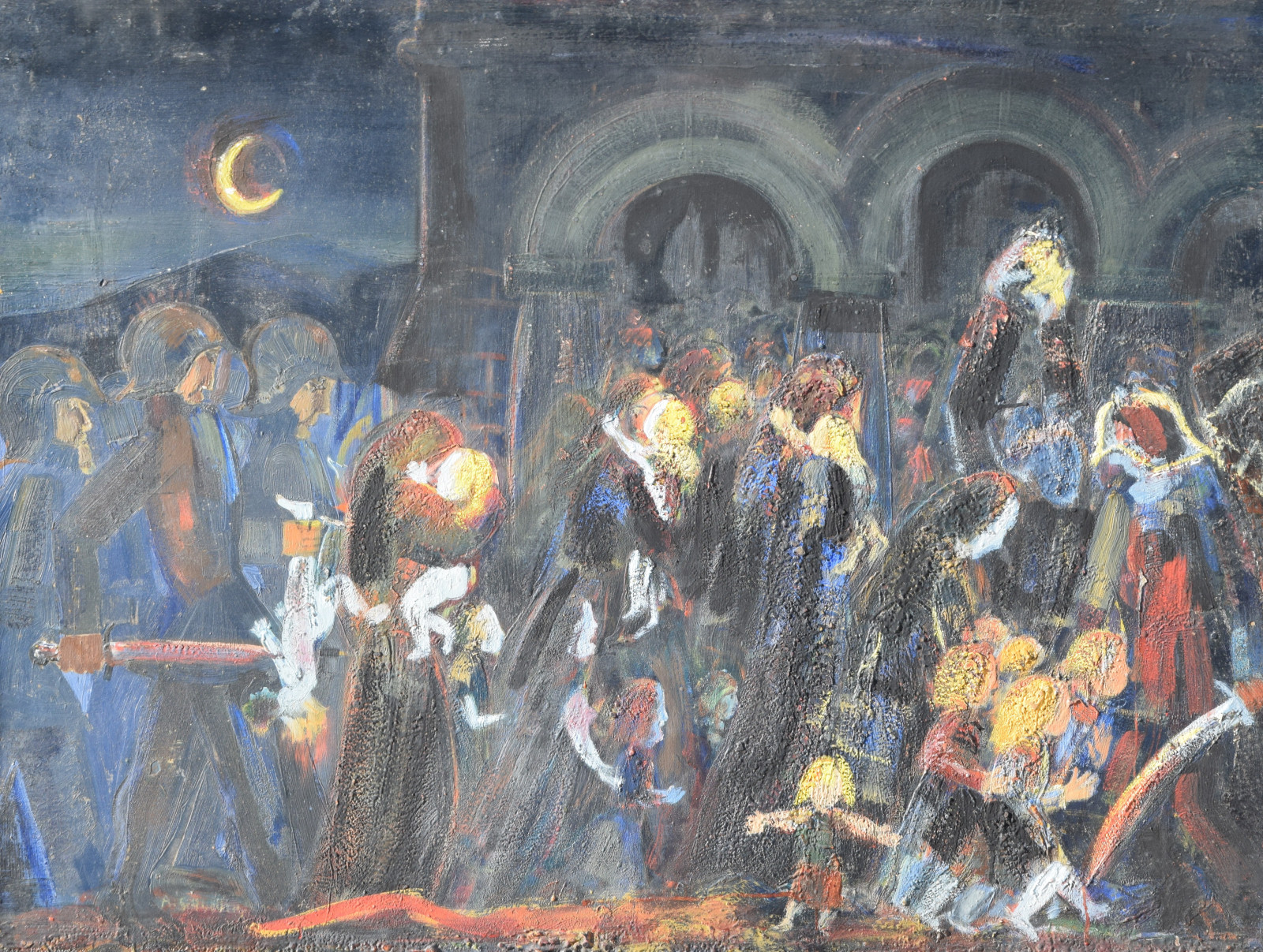Dieses vorliegende, großformatige Gemälde Albert Schnellers datiert auf 1950 und entstand damit in der frühen Nachkriegszeit, in der sich Schneller einer stärker abstrahierten Darstellungsweise zuwandte, ohne aber das Gegenständliche zu verlassen. Dass er dabei auch immer wieder religiöse Themen bearbeitete, zeigt dieses Werk beispielhaft, greift er hier doch das berühmte Thema des “Kindermords” auf eine überaus eigenwillige Weise auf. Der schnelle, breite Strich mag an Skizzen erinnert, doch ist es ohne Zweifel eine ausformulierte, große Komposition.
