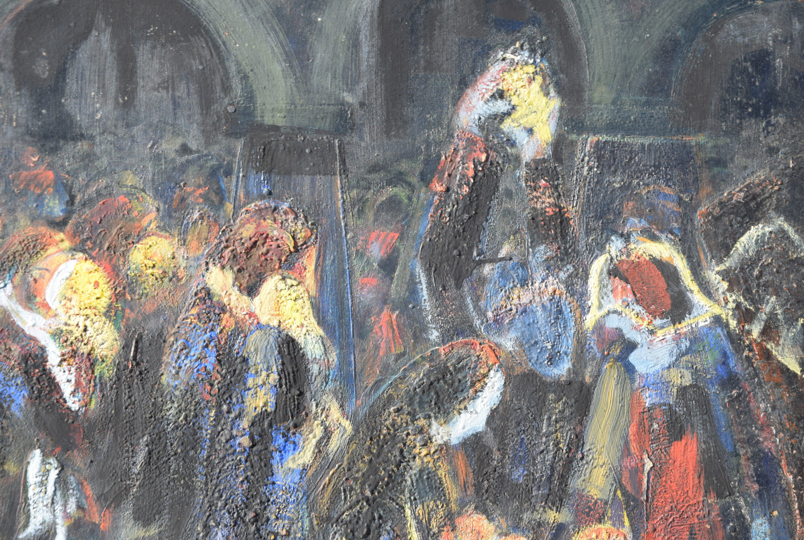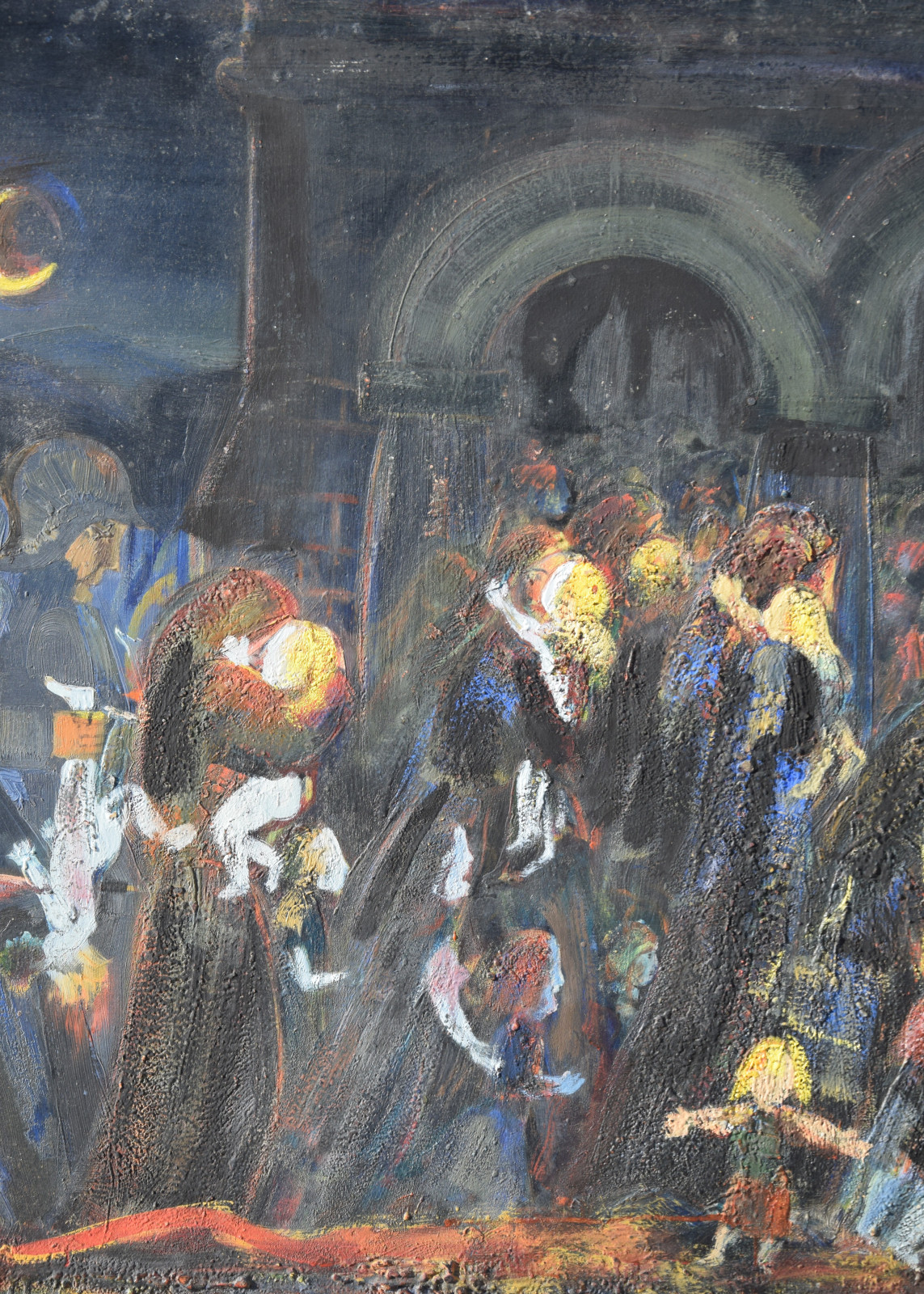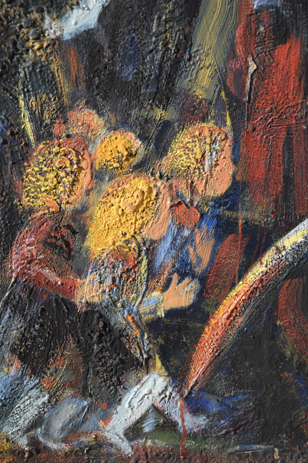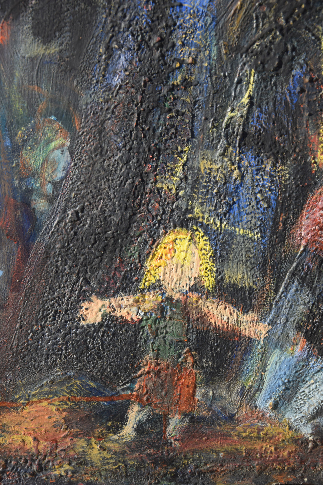 Dieses vorliegende, großformatige Gemälde Albert Schnellers datiert auf 1950 und entstand damit in der frühen Nachkriegszeit, in der sich Schneller einer stärker abstrahierten Darstellungsweise zuwandte, ohne aber das Gegenständliche zu verlassen. Dass er dabei auch immer wieder religiöse Themen bearbeitete, zeigt dieses Werk beispielhaft, greift er hier doch das berühmte Thema des “Kindermords” auf eine überaus eigenwillige Weise auf. Der schnelle, breite Strich mag an Skizzen erinnert, doch ist es ohne Zweifel eine ausformulierte, große Komposition.