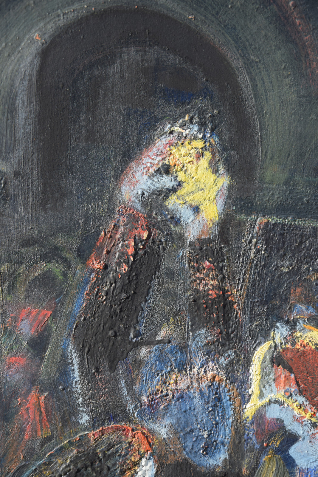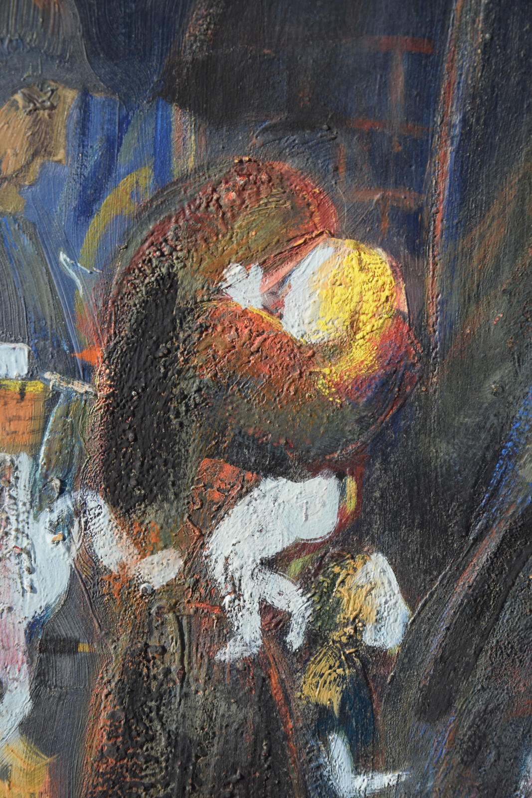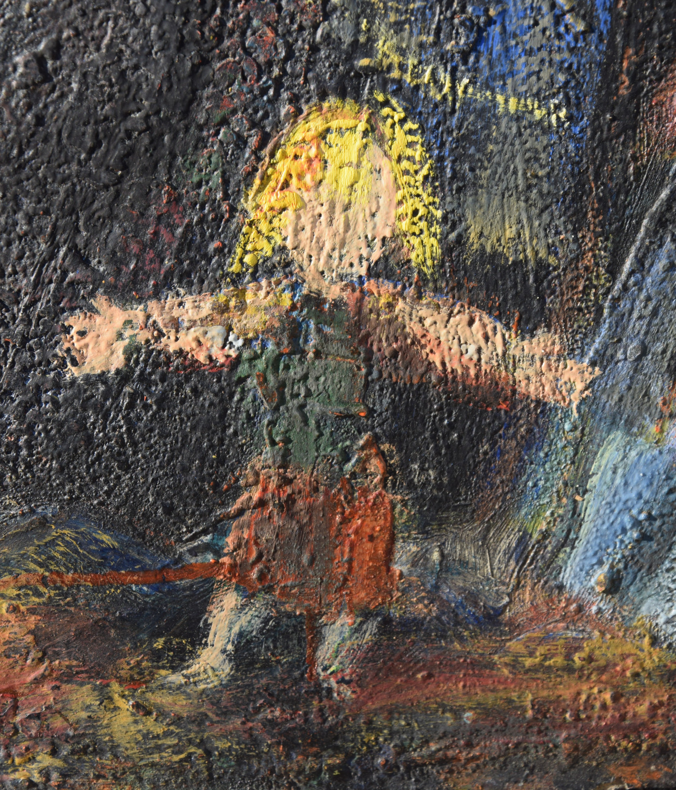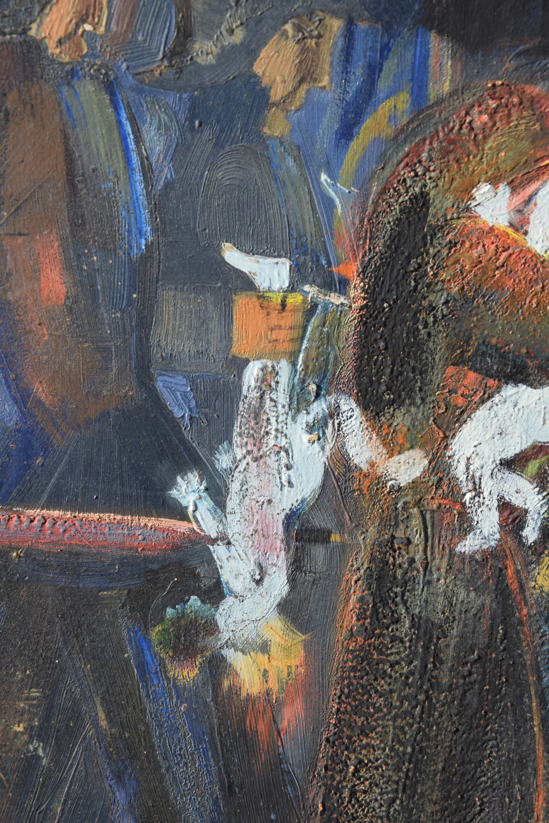 Dieses vorliegende, großformatige Gemälde Albert Schnellers datiert auf 1950 und entstand damit in der frühen Nachkriegszeit, in der sich Schneller einer stärker abstrahierten Darstellungsweise zuwandte, ohne aber das Gegenständliche zu verlassen. Dass er dabei auch immer wieder religiöse Themen bearbeitete, zeigt dieses Werk beispielhaft, greift er hier doch das berühmte Thema des “Kindermords” auf eine überaus eigenwillige Weise auf. Der schnelle, breite Strich mag an Skizzen erinnert, doch ist es ohne Zweifel eine ausformulierte, große Komposition.
