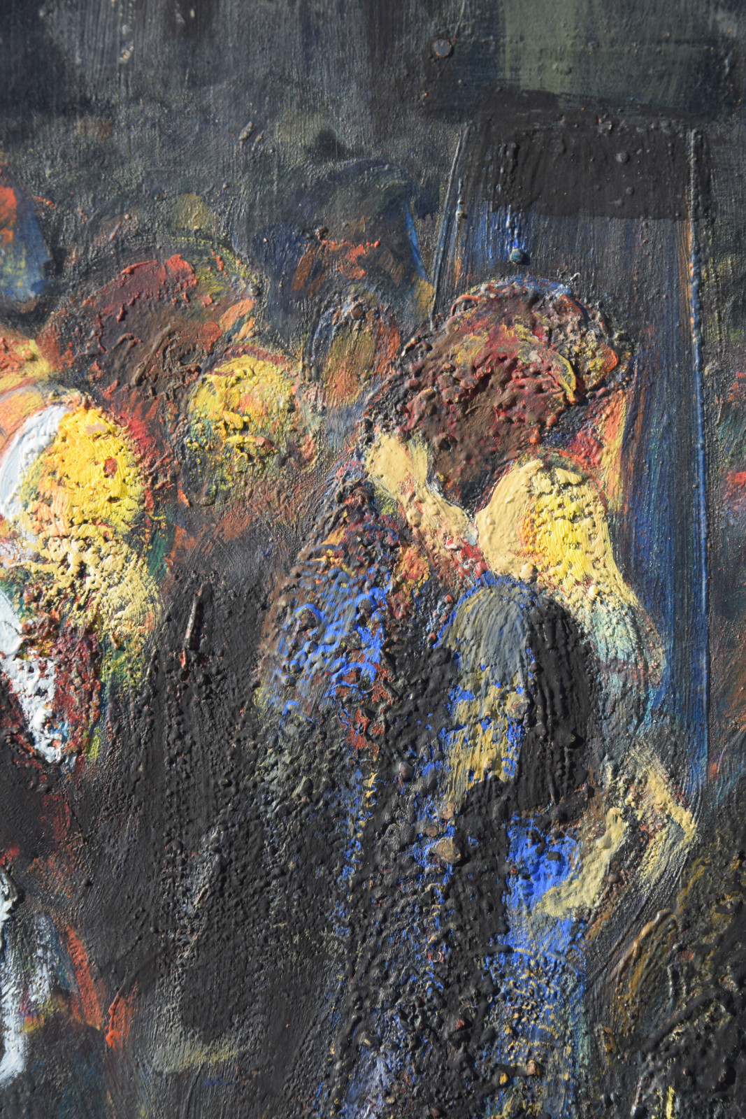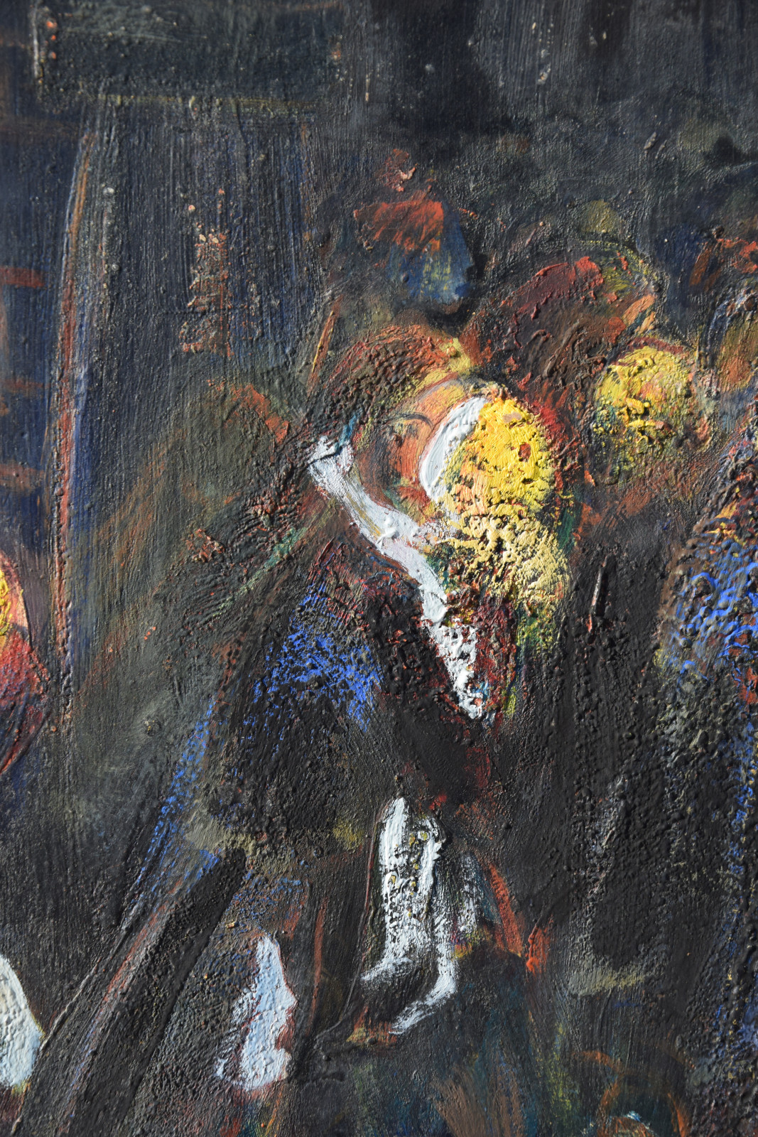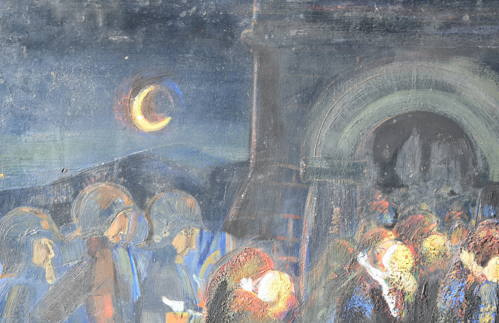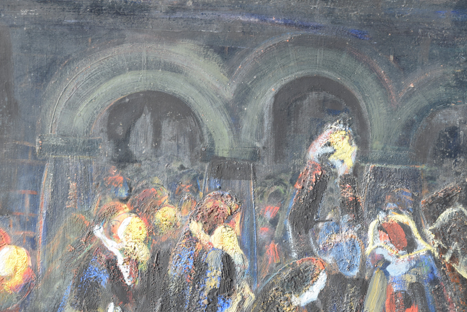 Dieses vorliegende, großformatige Gemälde Albert Schnellers datiert auf 1950 und entstand damit in der frühen Nachkriegszeit, in der sich Schneller einer stärker abstrahierten Darstellungsweise zuwandte, ohne aber das Gegenständliche zu verlassen. Dass er dabei auch immer wieder religiöse Themen bearbeitete, zeigt dieses Werk beispielhaft, greift er hier doch das berühmte Thema des “Kindermords” auf eine überaus eigenwillige Weise auf. Der schnelle, breite Strich mag an Skizzen erinnert, doch ist es ohne Zweifel eine ausformulierte, große Komposition.