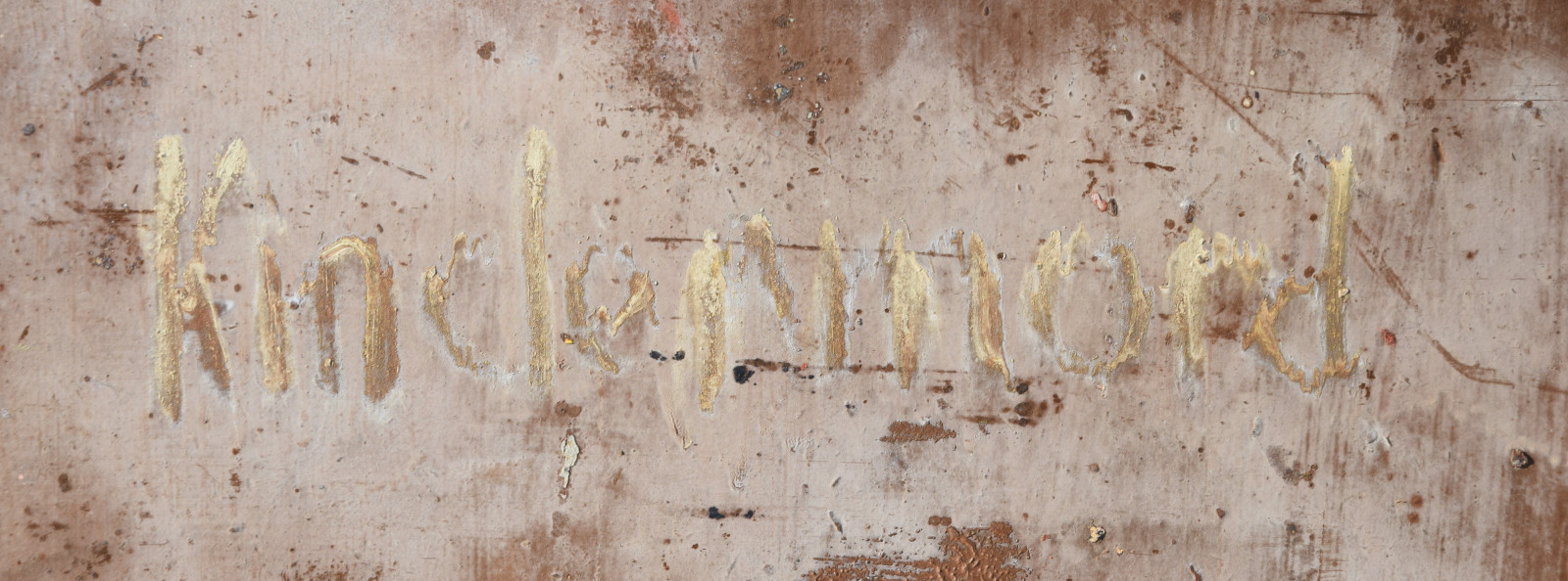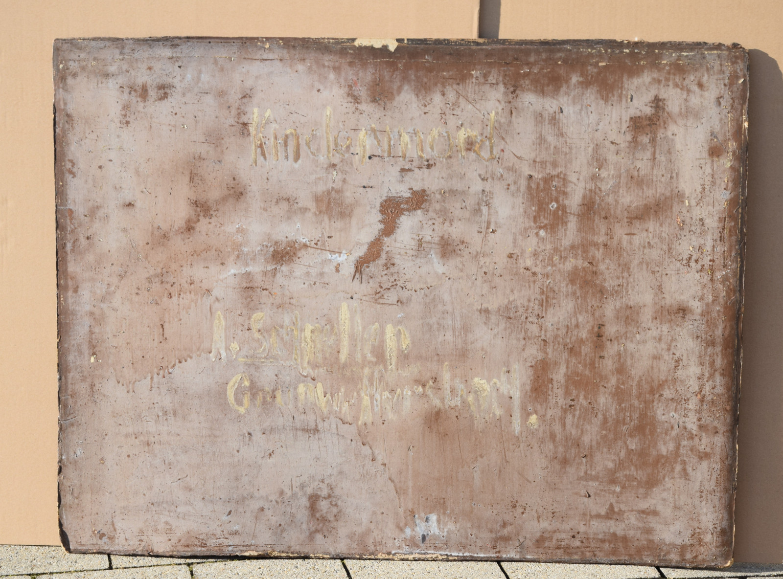 Ecken bestoßen; oberer Rand links stärker bestoßen; insgesamt Platte leicht wellig; in den Ecken und Randbereichen mitunter leichte Verluste der Farbschicht; insgesamt etwas beschmutzt und fleckig; verso (farb-)fleckig und berieben