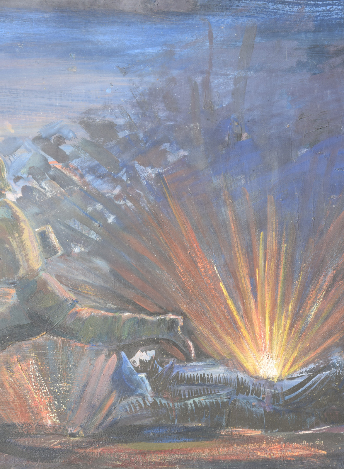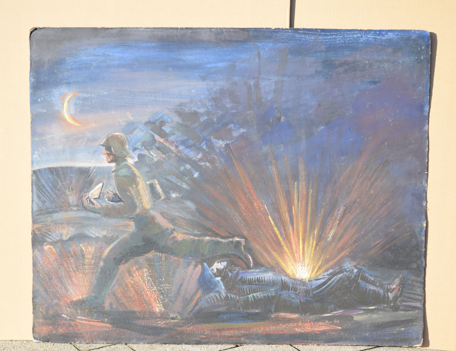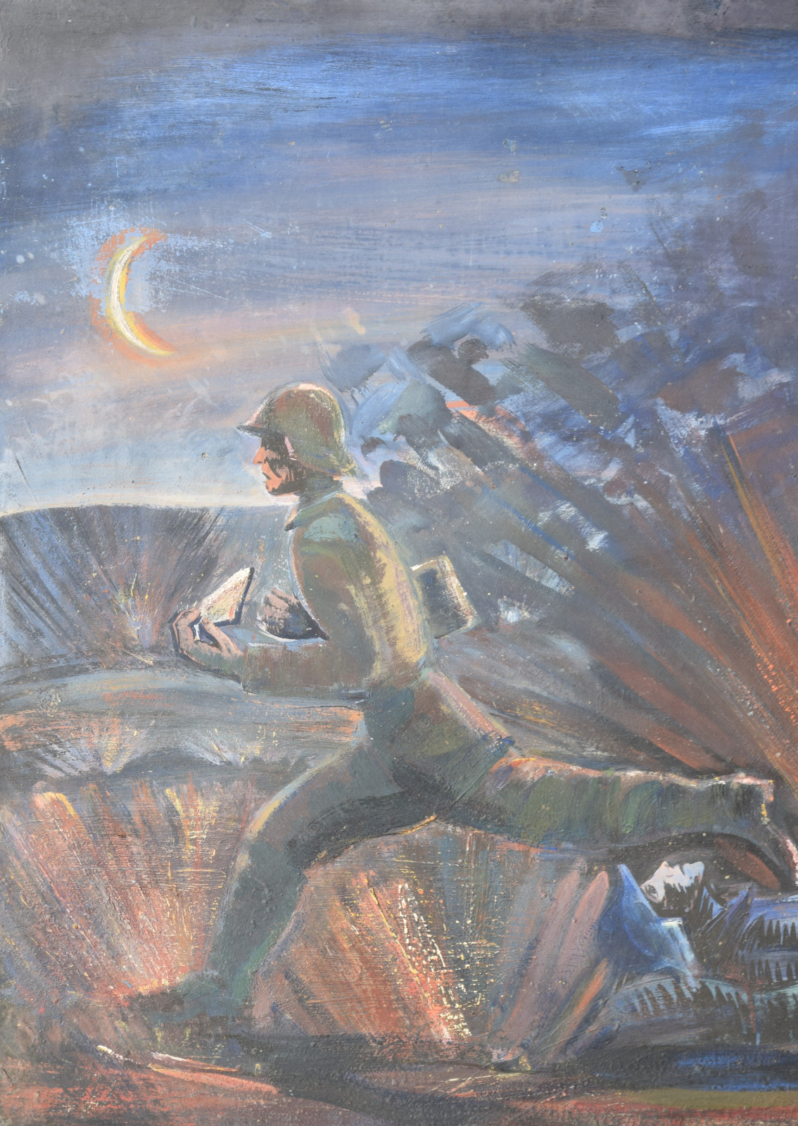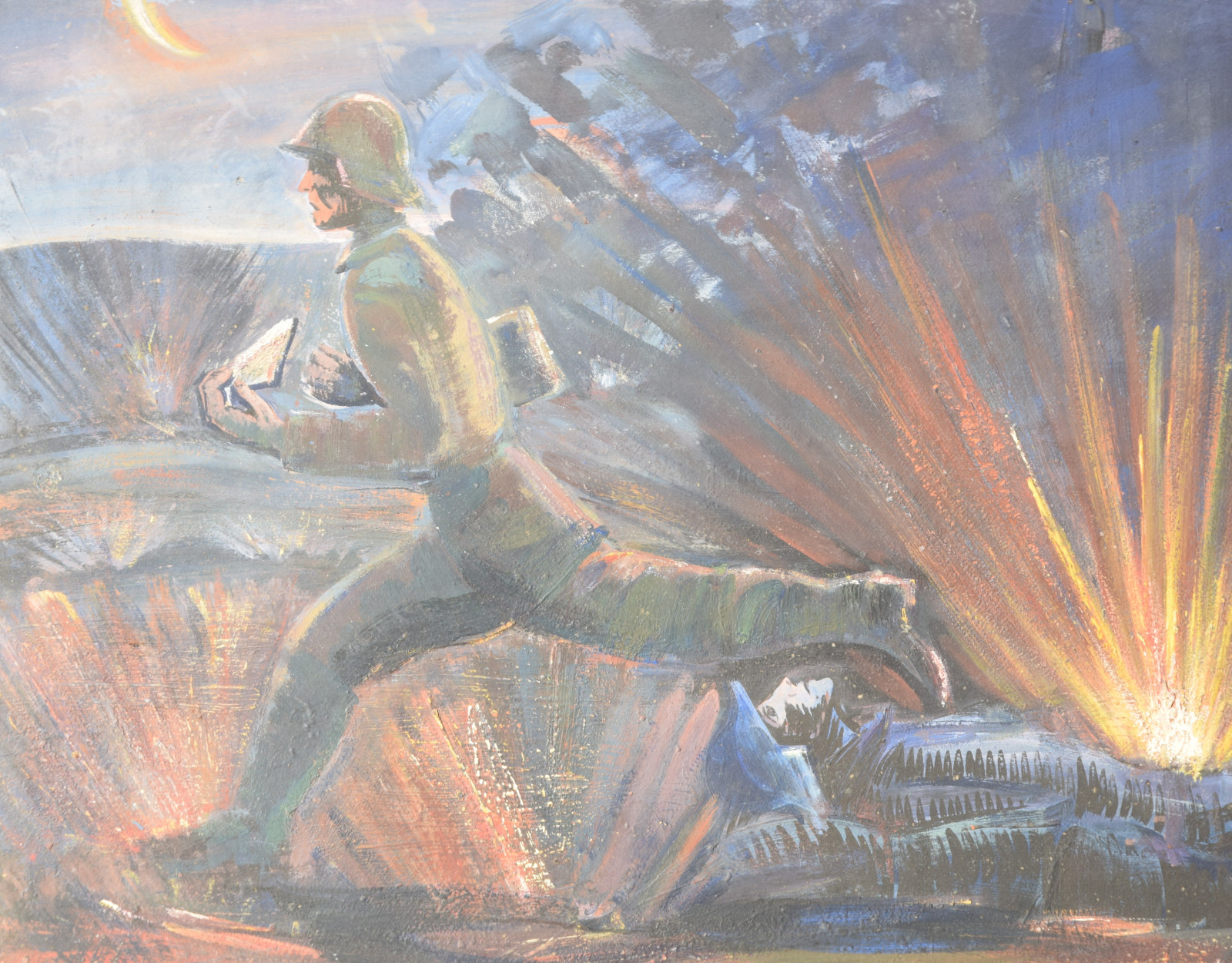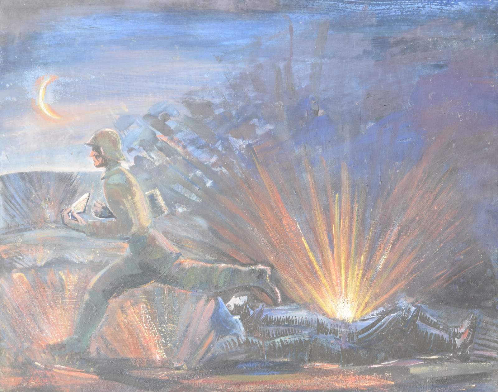 ohne Titel [nächtliche Kriegsszene mit rennendem Soldaten (Meldegänger), Geschosseinschlag und einem am Boden liegenden Kameraden]