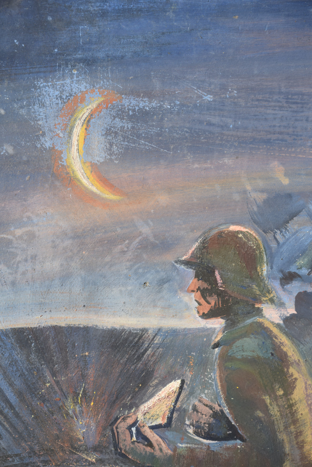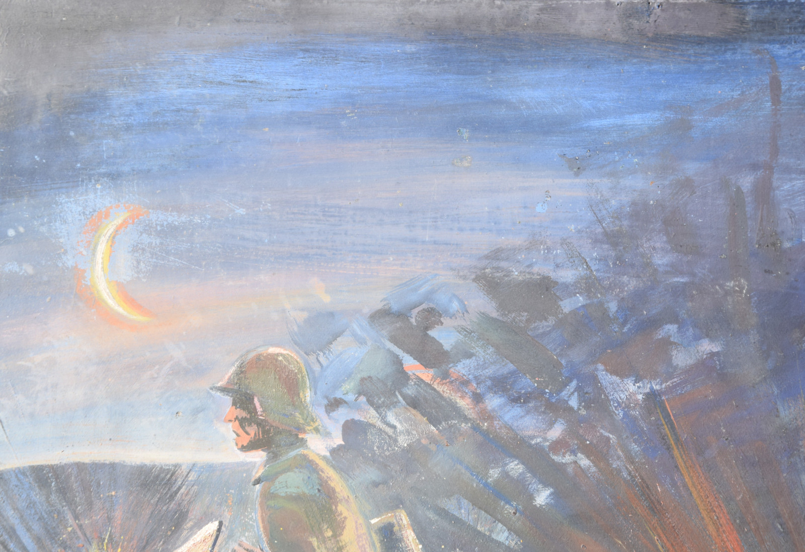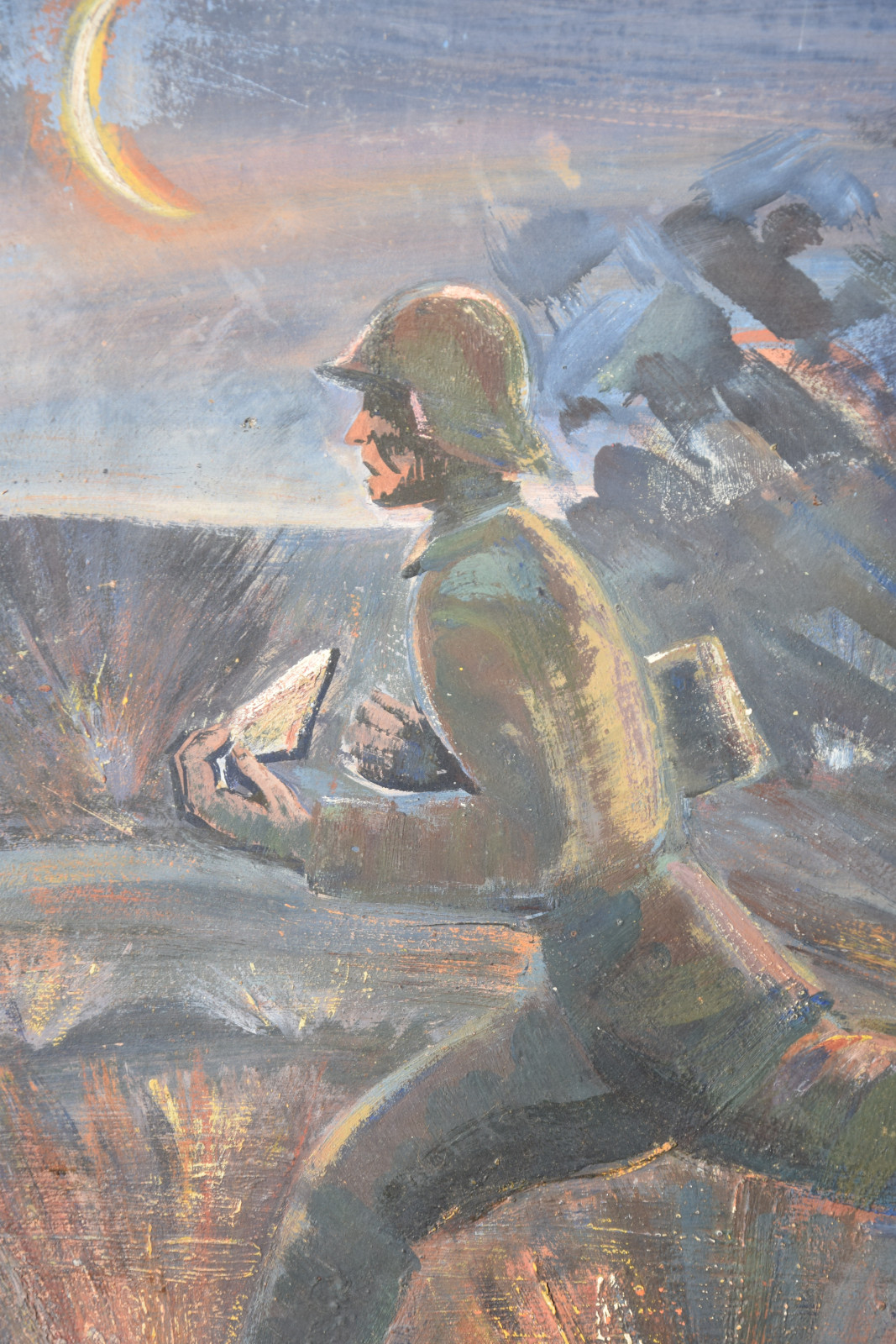 Schneller zeigt hier eine Soldatenszene, die so gar nichts mit der Heroisierung der Armee gemein hat. Es ist dunkle Nacht, links am Himmel hängt ein Sichelmond und von rechts nahen dunkle Gewitter-, besser: Kriegswolken. Im Vordergrund rennt ein Soldat über die Bildfläche, wobei die Armhaltung sofort augenfällig ist, da doch beide Arme nach vorne gerichtet sind. Im linken Arm hält er einen Brief bzw. einen Zettel, was ihn zweifelsohne als Meldegänger ausweist. Bereits hinter ihm liegt einer seiner Kameraden am Boden. Das kühle Blau-Schwarz und das fahle Gesicht zeigen bereits den Tod an und weitere Geschosse schlagen in unmittelbarer Nähe ein.