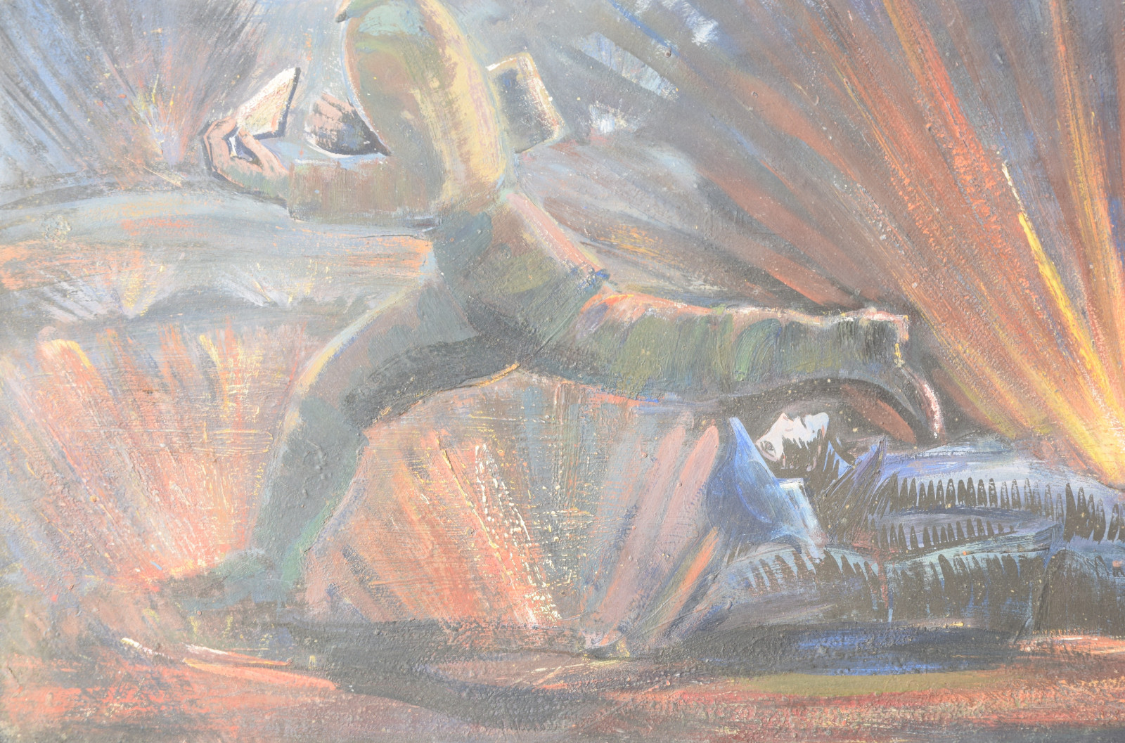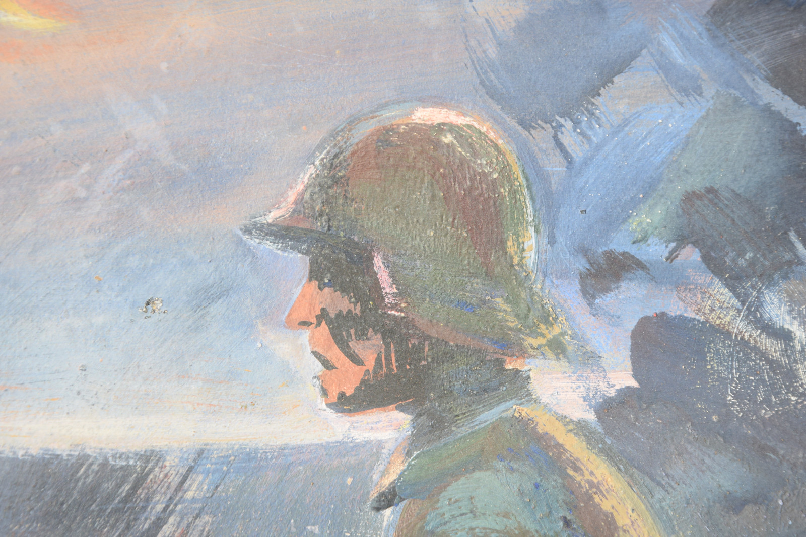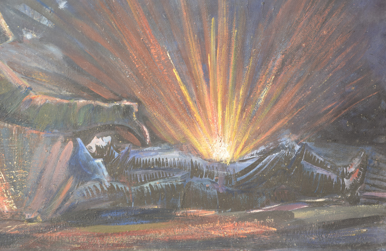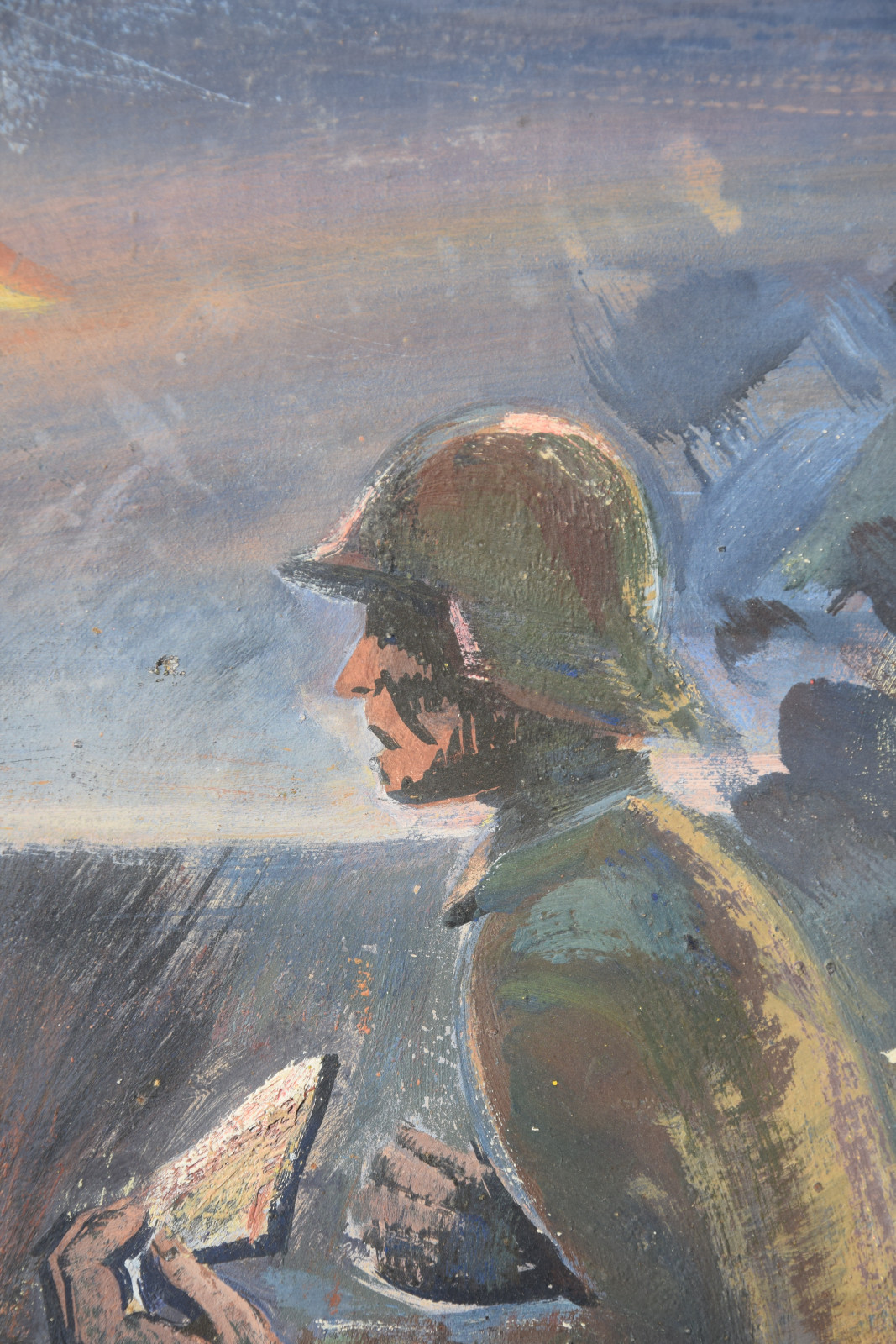 Schneller zeigt hier eine Soldatenszene, die so gar nichts mit der Heroisierung der Armee gemein hat. Es ist dunkle Nacht, links am Himmel hängt ein Sichelmond und von rechts nahen dunkle Gewitter-, besser: Kriegswolken. Im Vordergrund rennt ein Soldat über die Bildfläche, wobei die Armhaltung sofort augenfällig ist, da doch beide Arme nach vorne gerichtet sind. Im linken Arm hält er einen Brief bzw. einen Zettel, was ihn zweifelsohne als Meldegänger ausweist. Bereits hinter ihm liegt einer seiner Kameraden am Boden. Das kühle Blau-Schwarz und das fahle Gesicht zeigen bereits den Tod an und weitere Geschosse schlagen in unmittelbarer Nähe ein.