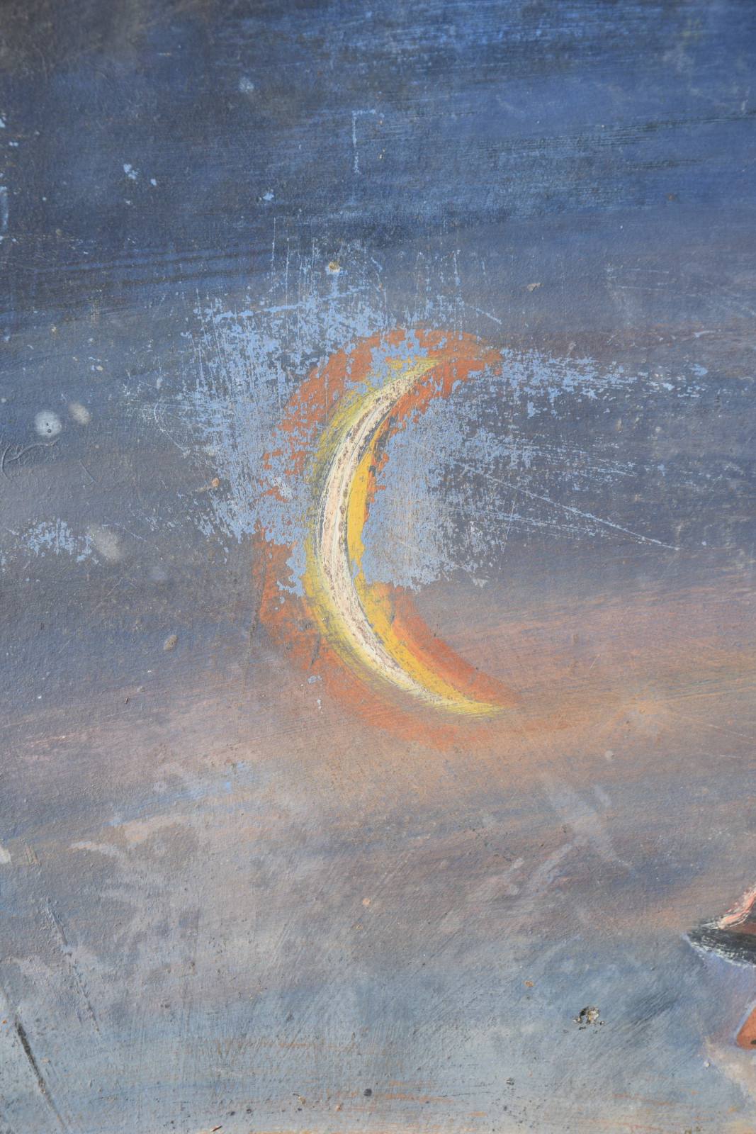 Ecken bestoßen; insgesamt Platte leicht wellig; in den Ecken und Randbereichen mitunter leichte Verluste der Farbschicht; insgesamt etwas beschmutzt und fleckig; am oberen Rand mittig drei Löchlein; verso (farb-)fleckig und berieben