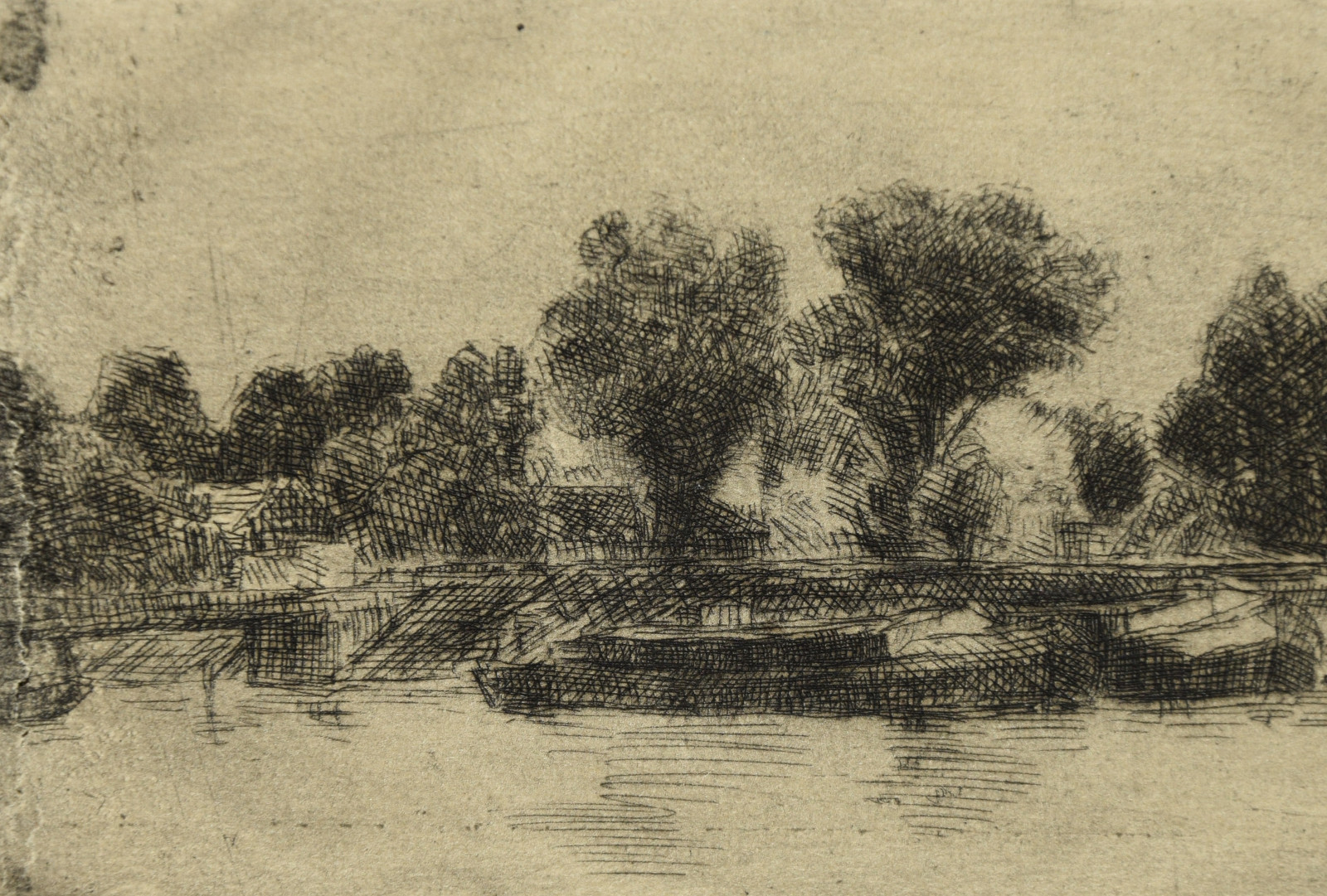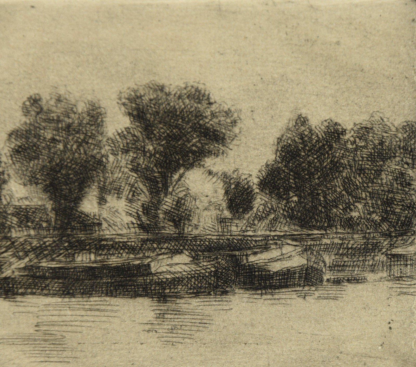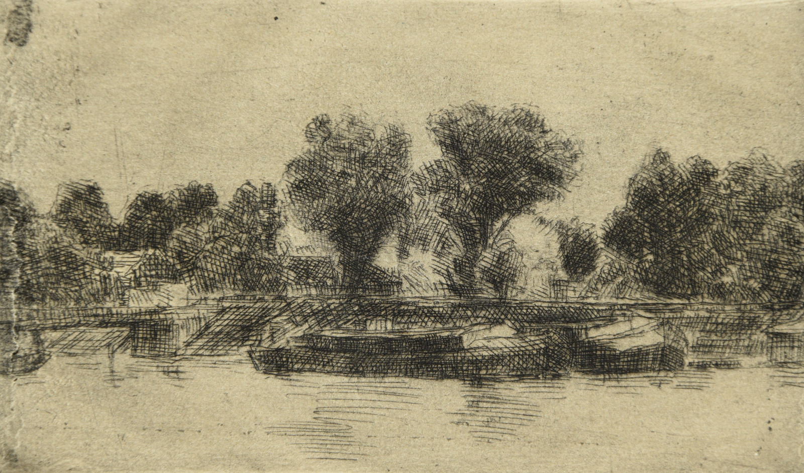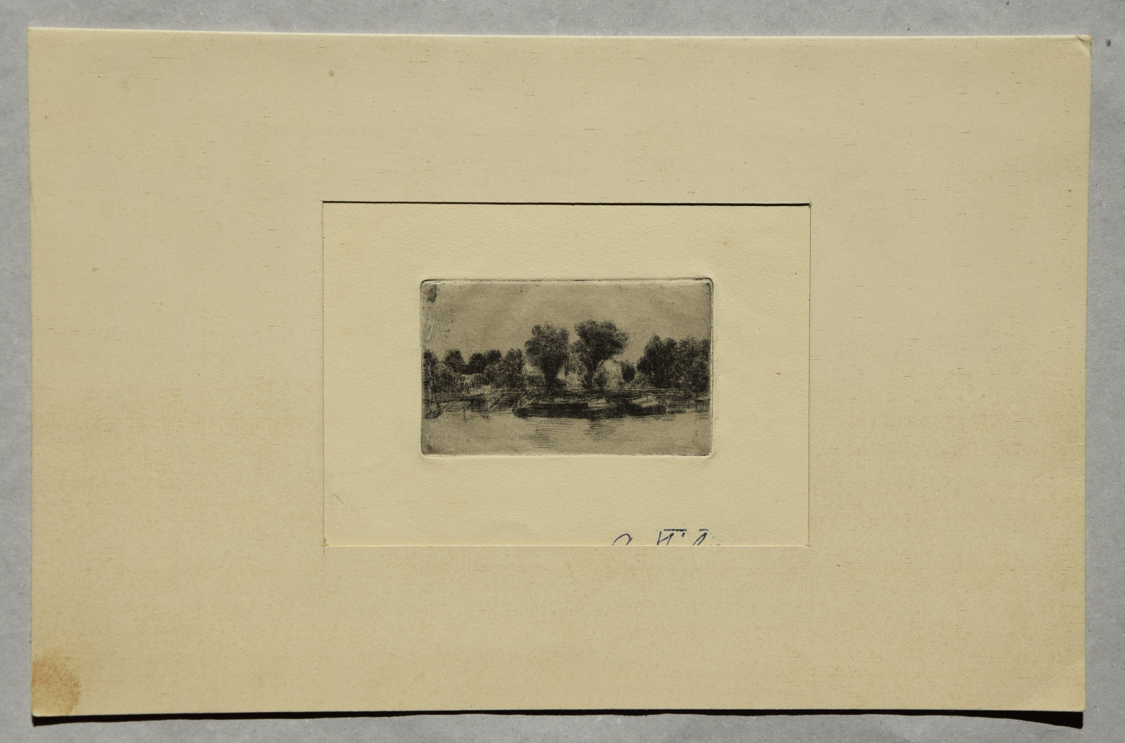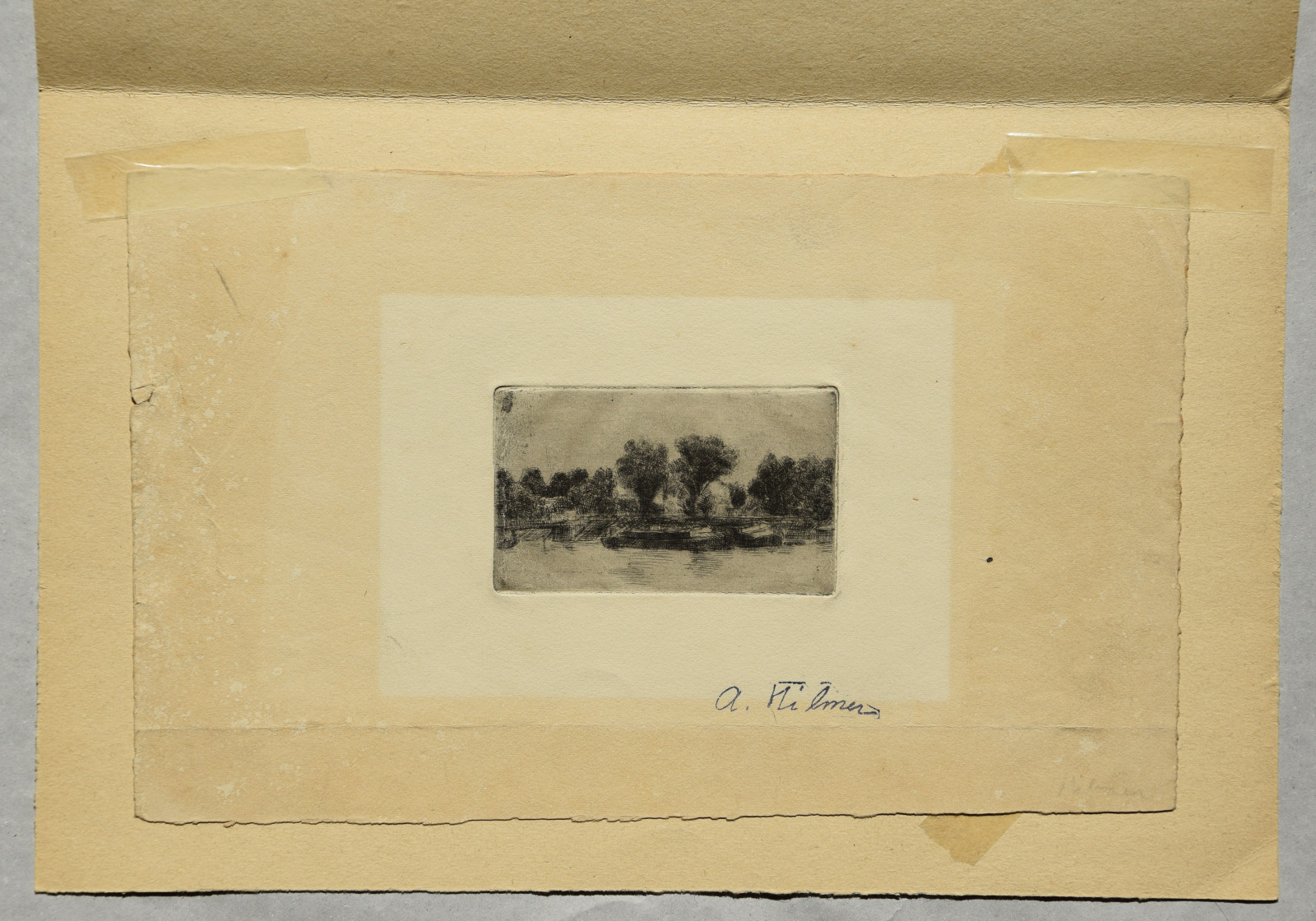 ohne Titel [dunkle Flusslandschaft (Alster, Elbe?), links eine Brücke, mittig ein angelegtes Boot und am Ufer Bäume und Baumgruppen]