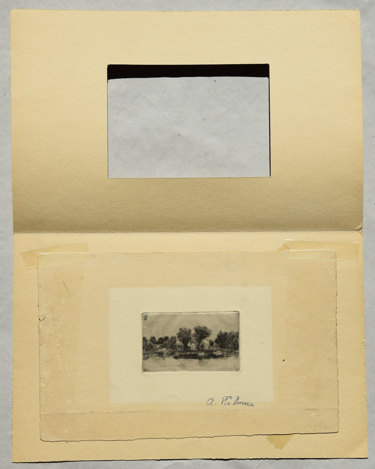Kaltnadelradierung auf leichtem Karton, an den oberen beiden Ecken durch Klebestreifen in Passepartout gesetzt