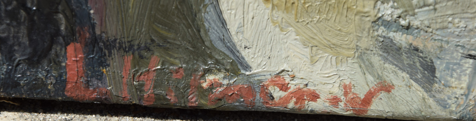 Leinwand doubliert; Ränder der Leinwand rahmungsbedingt leicht berieben (unter Rahmung nicht sichtbar); in der unteren Bildhälfte Craquelé- und mitunter Rissbildung (Farbschichten jedoch alle fest und keine Schollenbildungen); partiell sehr leicht fleckig; Leinwand verso etwas fleckig