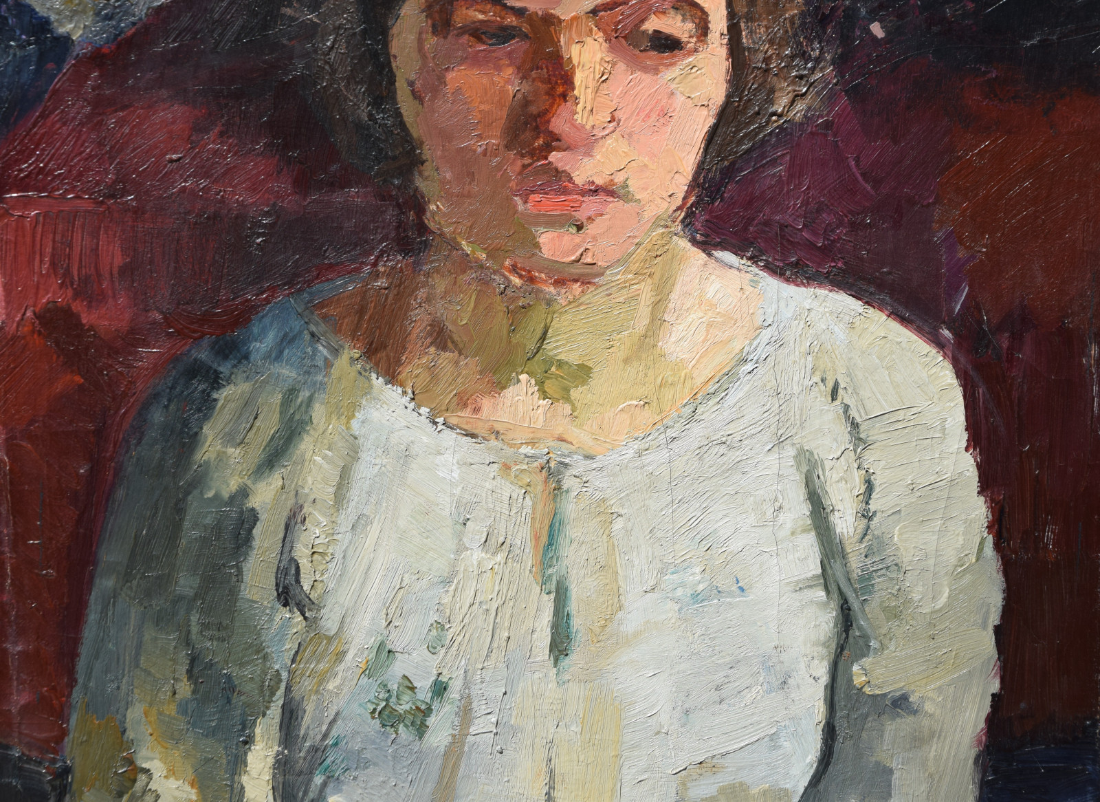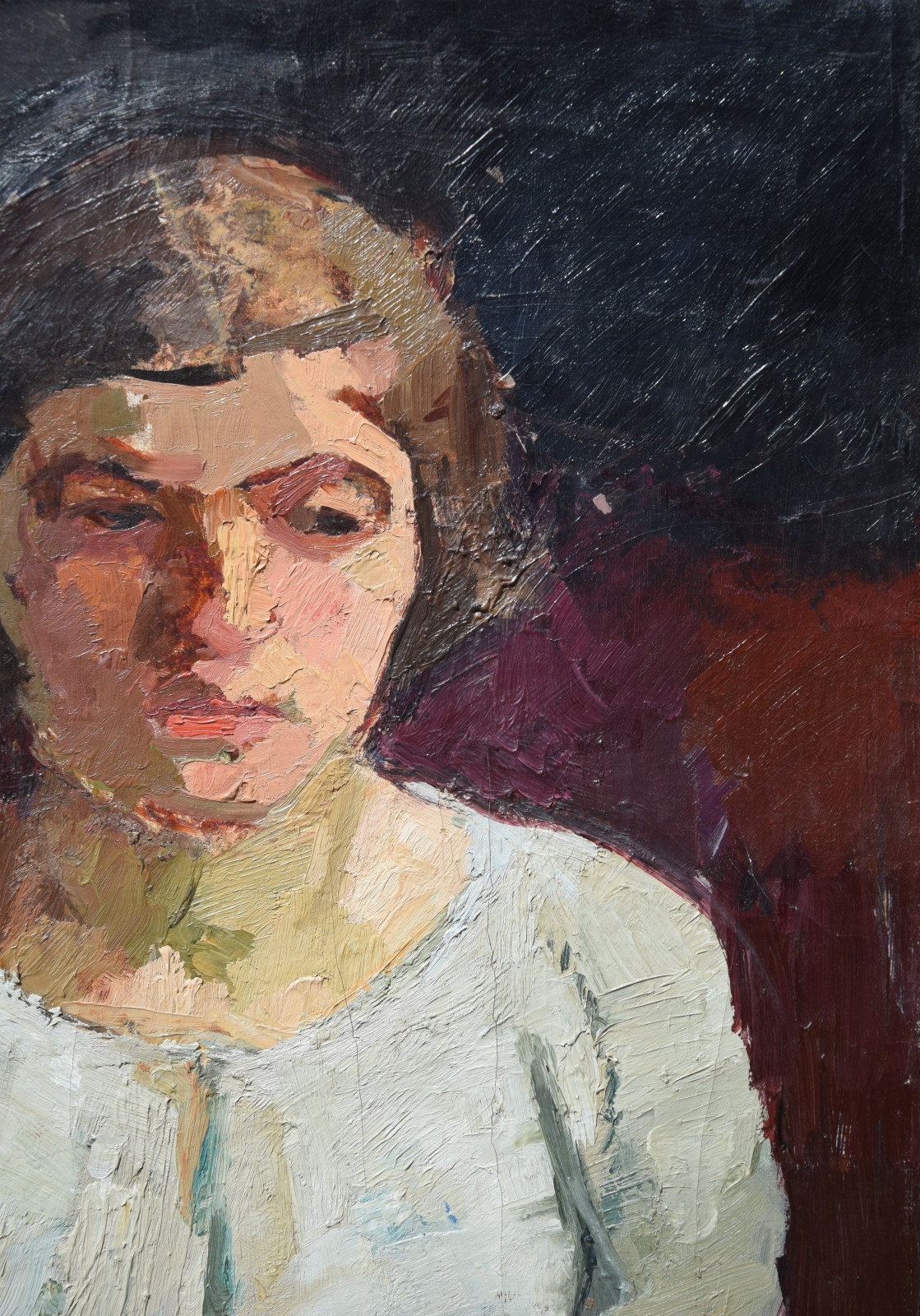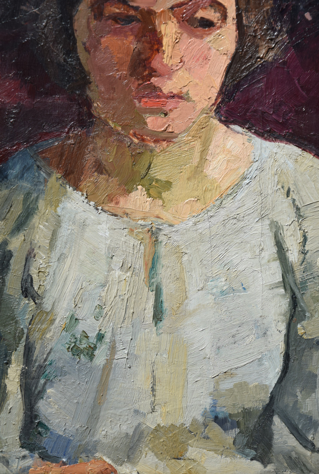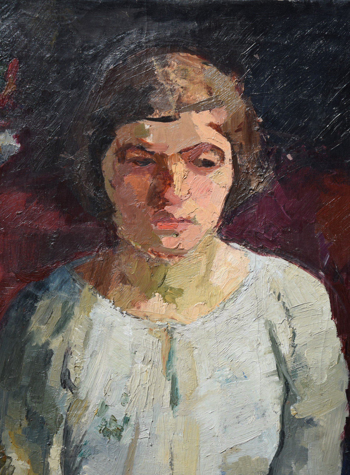 In vornehmlich breiten Pinselstrichen und einem mitunter leicht pastosen Farbauftrag entsteht ein ganz eigentümliches, herbes, aber auch gefühlvolles Bildnis. Während das junge Alter und das helle Kleid eher eine Zartheit vermuten lassen, so sieht Charlotte Hilmer hier vielmehr Ernst und Persönlichkeit. Dementsprechend wirkt der Mund beinahe bewusst verschlossen, ohne jegliches Lächeln. Und es ist gerade das Gesicht, welches einen deutlich hohen Abstraktionsgrad aufweist – die einzelnen Farbflächen überlagern sich mitunter, wirken impulsiv gesetzt. Einzig die markant dunklen Augen und der schmale rote Mund bilden Orientierungspunkte innerhalb dieses tiefgründig traurigen, früh gealterten Gesichtes.