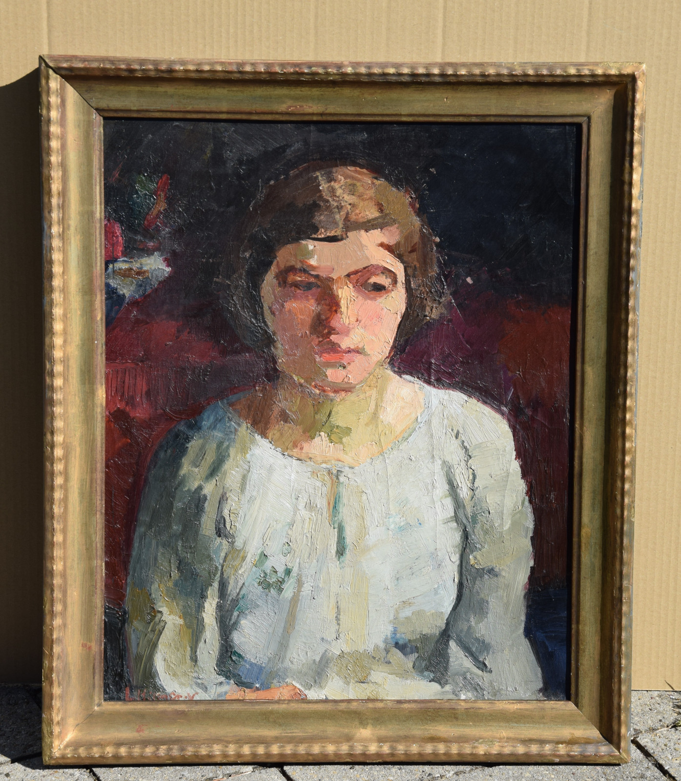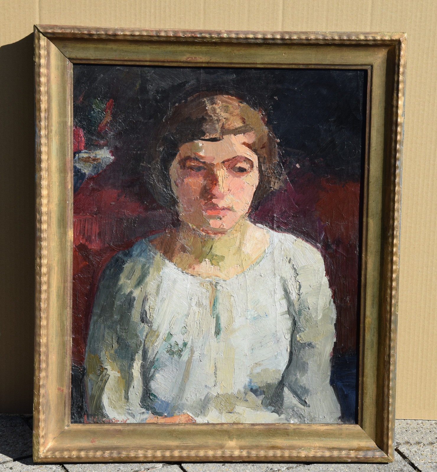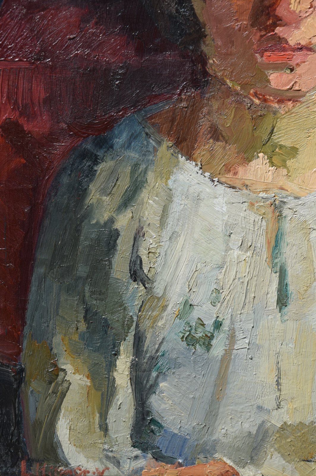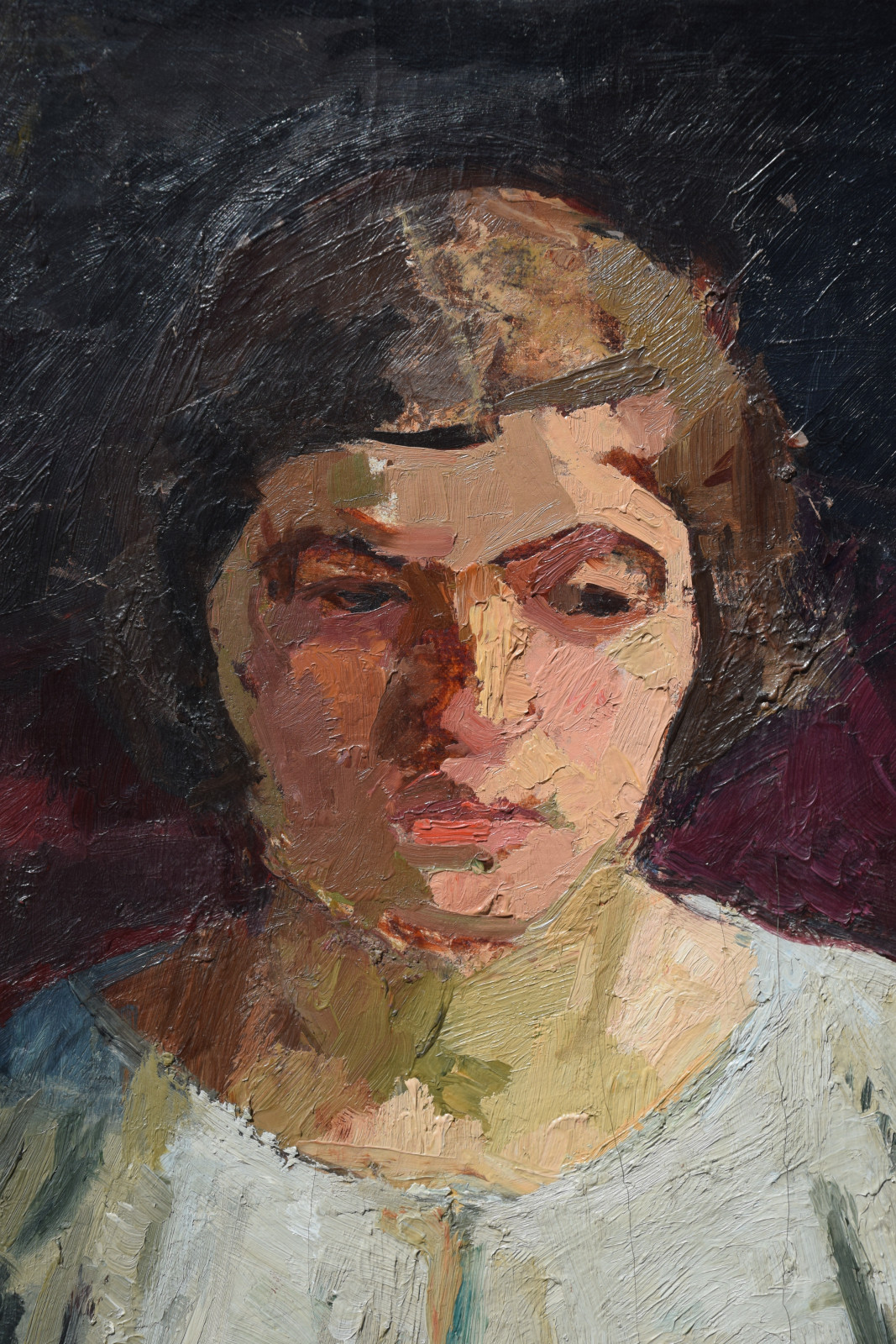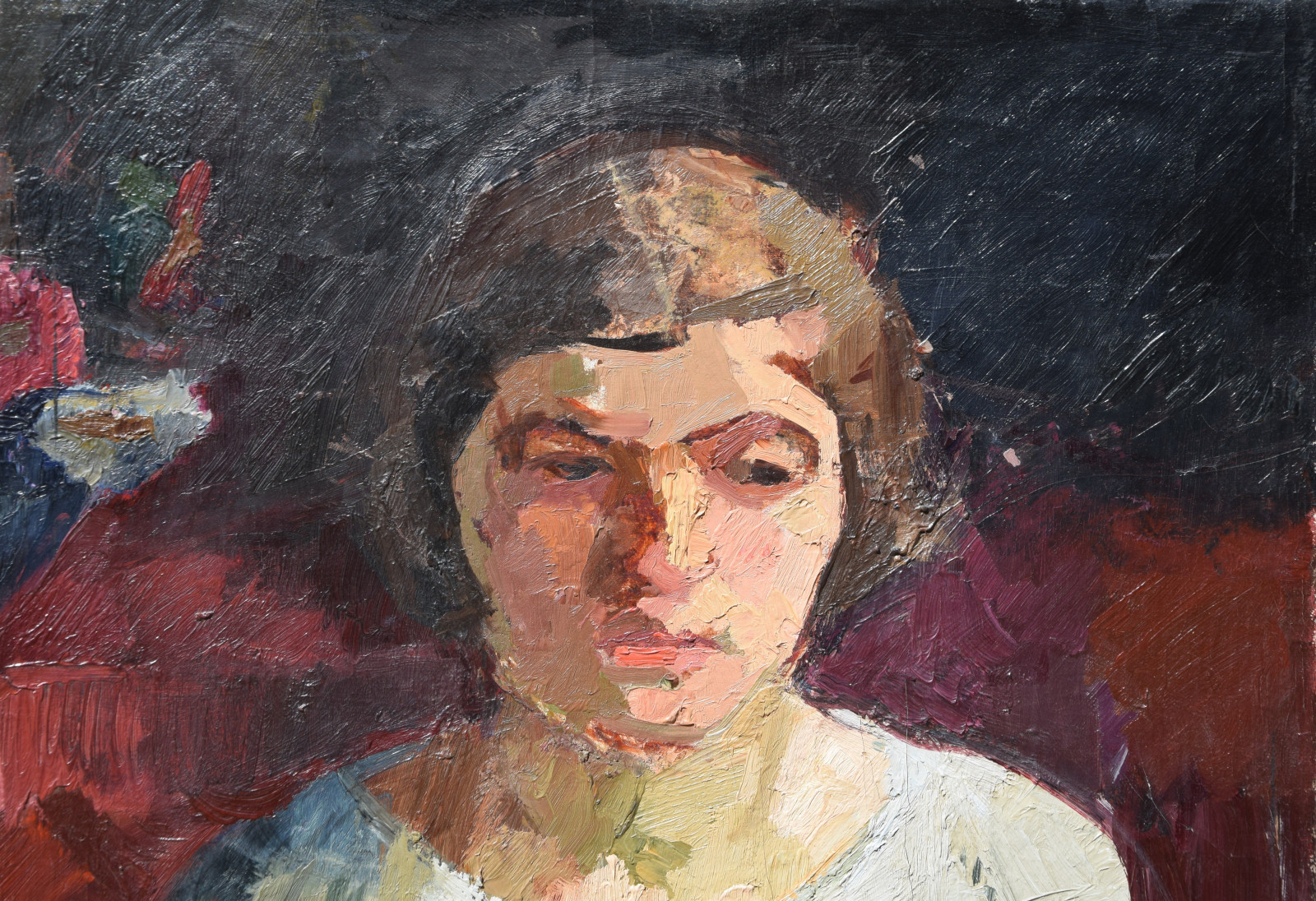 In vornehmlich breiten Pinselstrichen und einem mitunter leicht pastosen Farbauftrag entsteht ein ganz eigentümliches, herbes, aber auch gefühlvolles Bildnis. Während das junge Alter und das helle Kleid eher eine Zartheit vermuten lassen, so sieht Charlotte Hilmer hier vielmehr Ernst und Persönlichkeit. Dementsprechend wirkt der Mund beinahe bewusst verschlossen, ohne jegliches Lächeln. Und es ist gerade das Gesicht, welches einen deutlich hohen Abstraktionsgrad aufweist – die einzelnen Farbflächen überlagern sich mitunter, wirken impulsiv gesetzt. Einzig die markant dunklen Augen und der schmale rote Mund bilden Orientierungspunkte innerhalb dieses tiefgründig traurigen, früh gealterten Gesichtes.