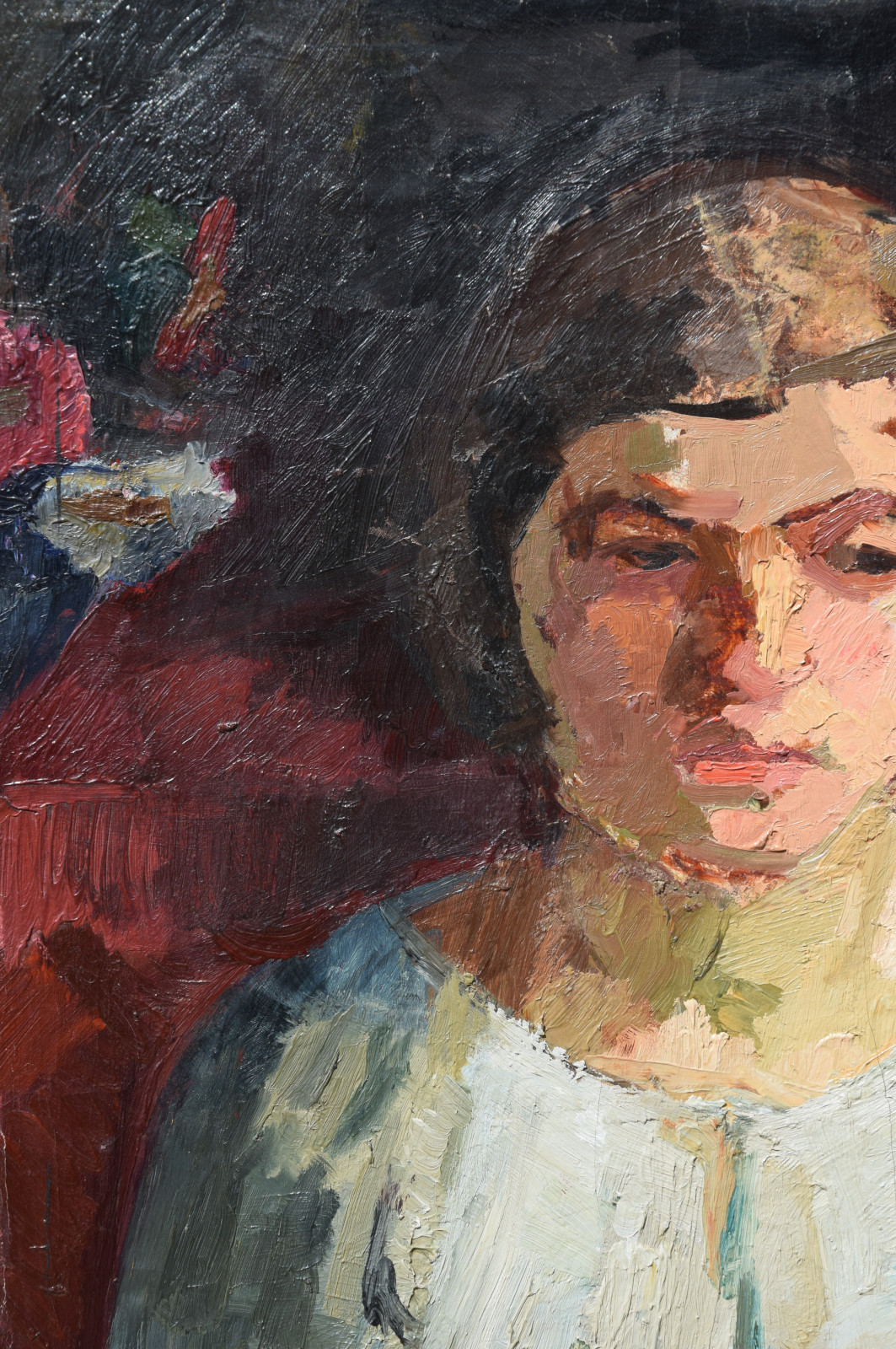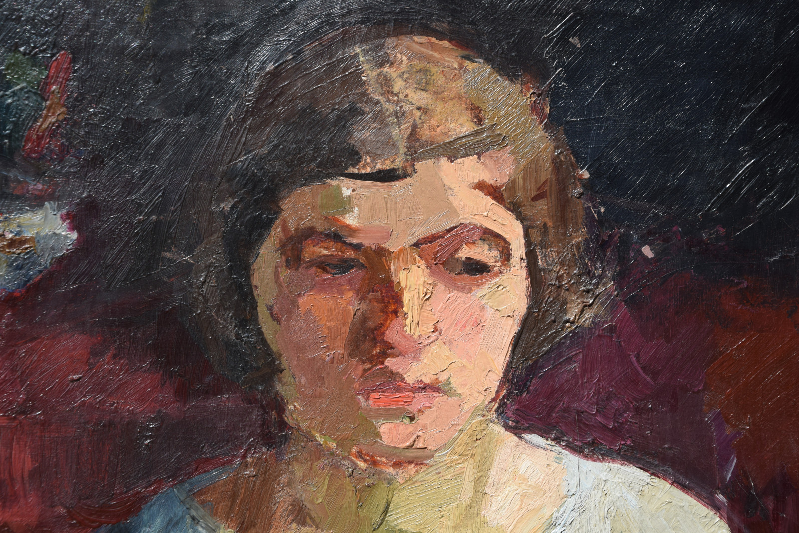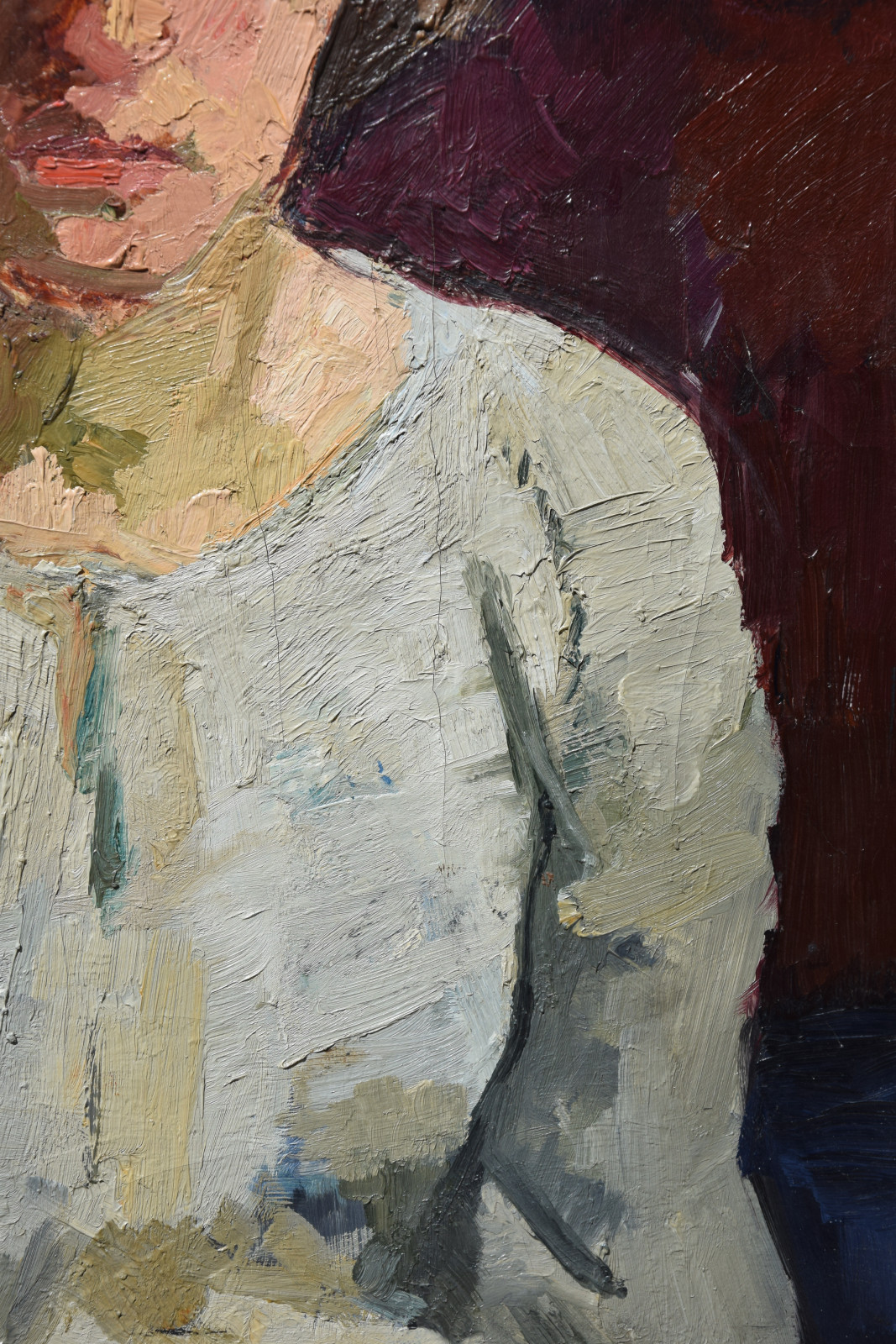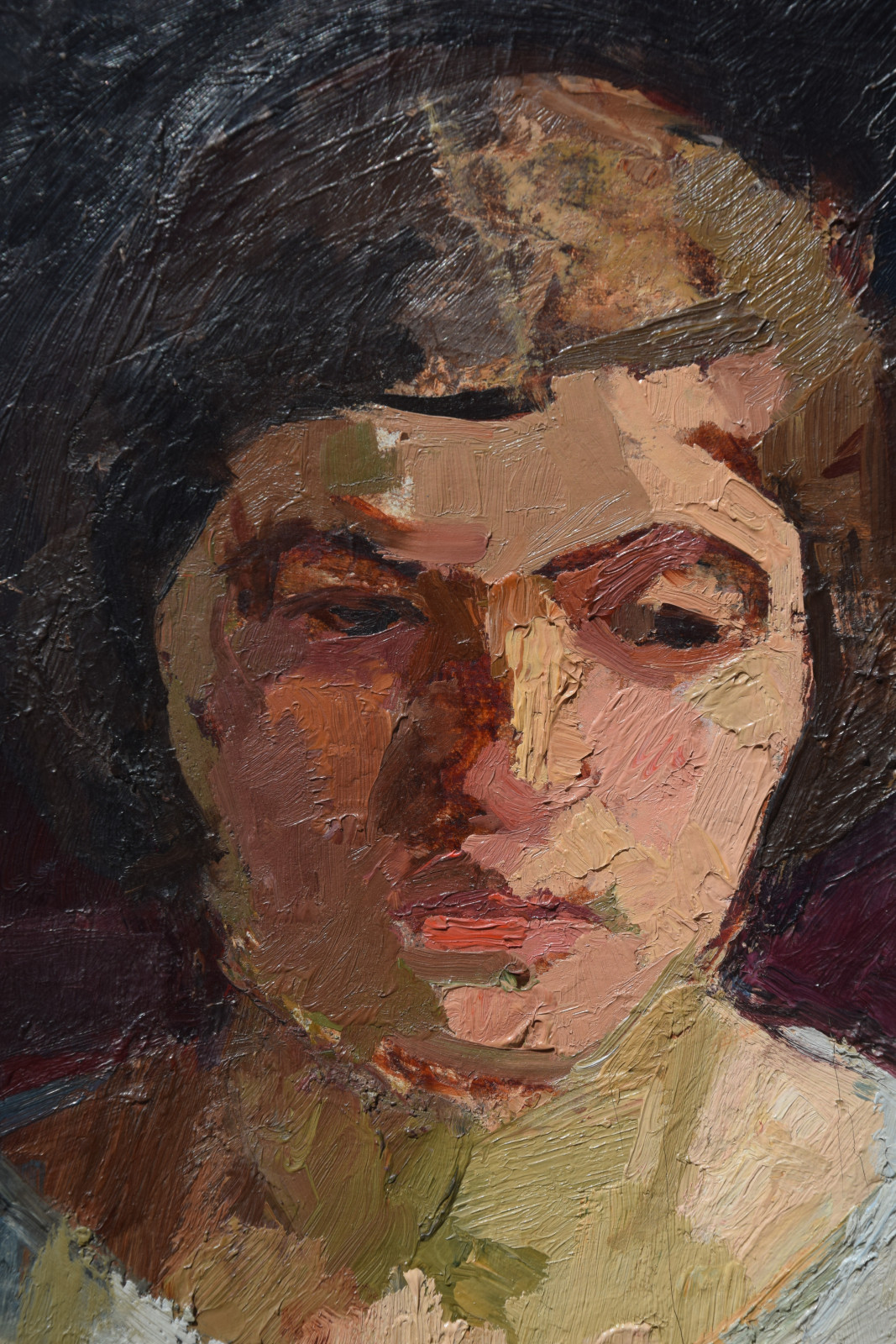 In vornehmlich breiten Pinselstrichen und einem mitunter leicht pastosen Farbauftrag entsteht ein ganz eigentümliches, herbes, aber auch gefühlvolles Bildnis. Während das junge Alter und das helle Kleid eher eine Zartheit vermuten lassen, so sieht Charlotte Hilmer hier vielmehr Ernst und Persönlichkeit. Dementsprechend wirkt der Mund beinahe bewusst verschlossen, ohne jegliches Lächeln. Und es ist gerade das Gesicht, welches einen deutlich hohen Abstraktionsgrad aufweist – die einzelnen Farbflächen überlagern sich mitunter, wirken impulsiv gesetzt. Einzig die markant dunklen Augen und der schmale rote Mund bilden Orientierungspunkte innerhalb dieses tiefgründig traurigen, früh gealterten Gesichtes.