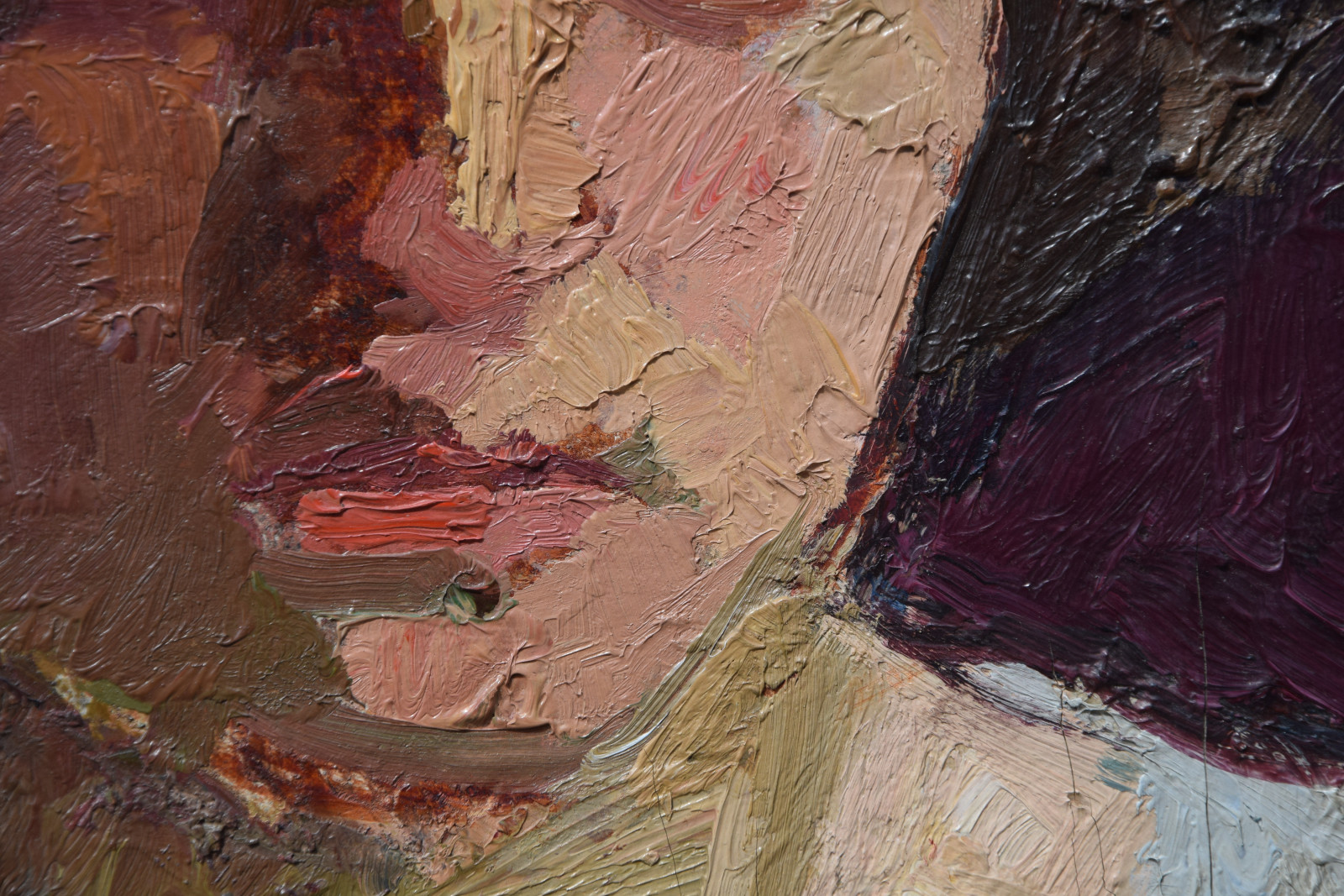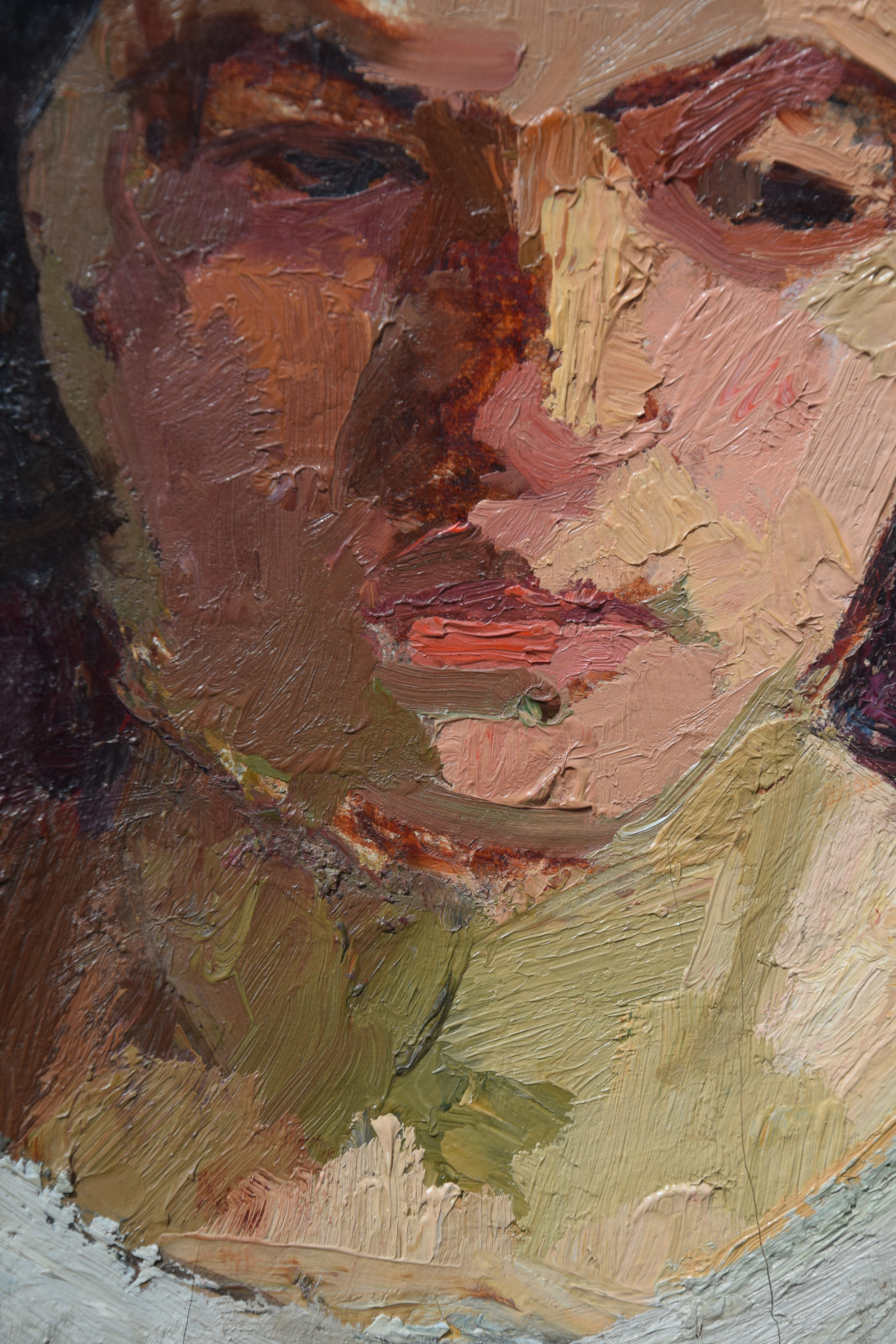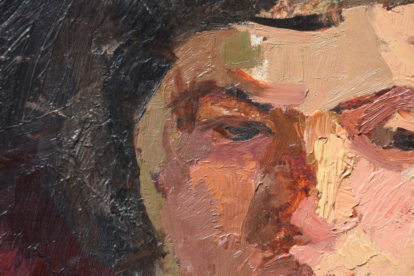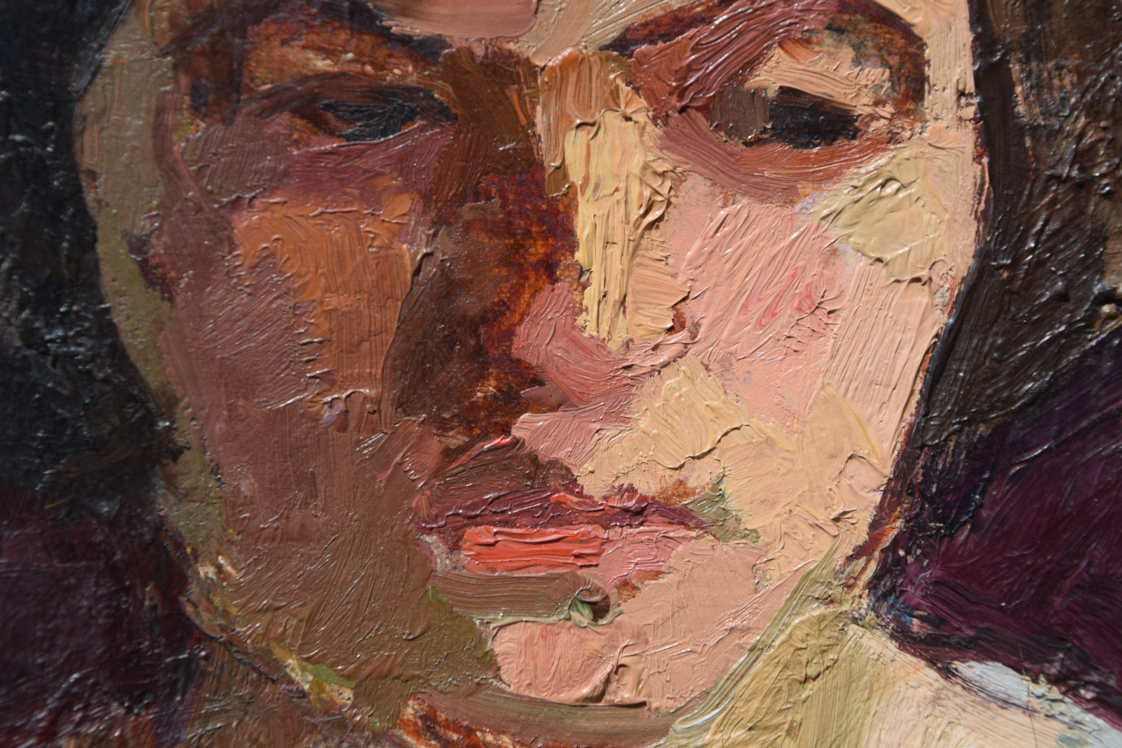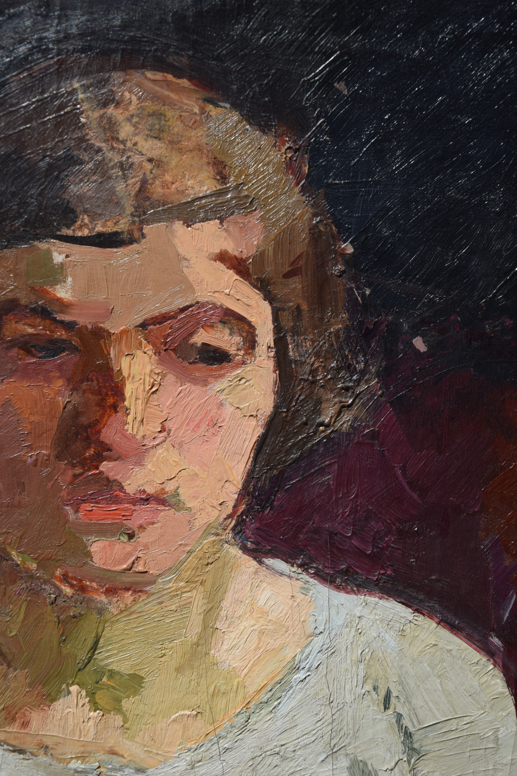 In vornehmlich breiten Pinselstrichen und einem mitunter leicht pastosen Farbauftrag entsteht ein ganz eigentümliches, herbes, aber auch gefühlvolles Bildnis. Während das junge Alter und das helle Kleid eher eine Zartheit vermuten lassen, so sieht Charlotte Hilmer hier vielmehr Ernst und Persönlichkeit. Dementsprechend wirkt der Mund beinahe bewusst verschlossen, ohne jegliches Lächeln. Und es ist gerade das Gesicht, welches einen deutlich hohen Abstraktionsgrad aufweist – die einzelnen Farbflächen überlagern sich mitunter, wirken impulsiv gesetzt. Einzig die markant dunklen Augen und der schmale rote Mund bilden Orientierungspunkte innerhalb dieses tiefgründig traurigen, früh gealterten Gesichtes.