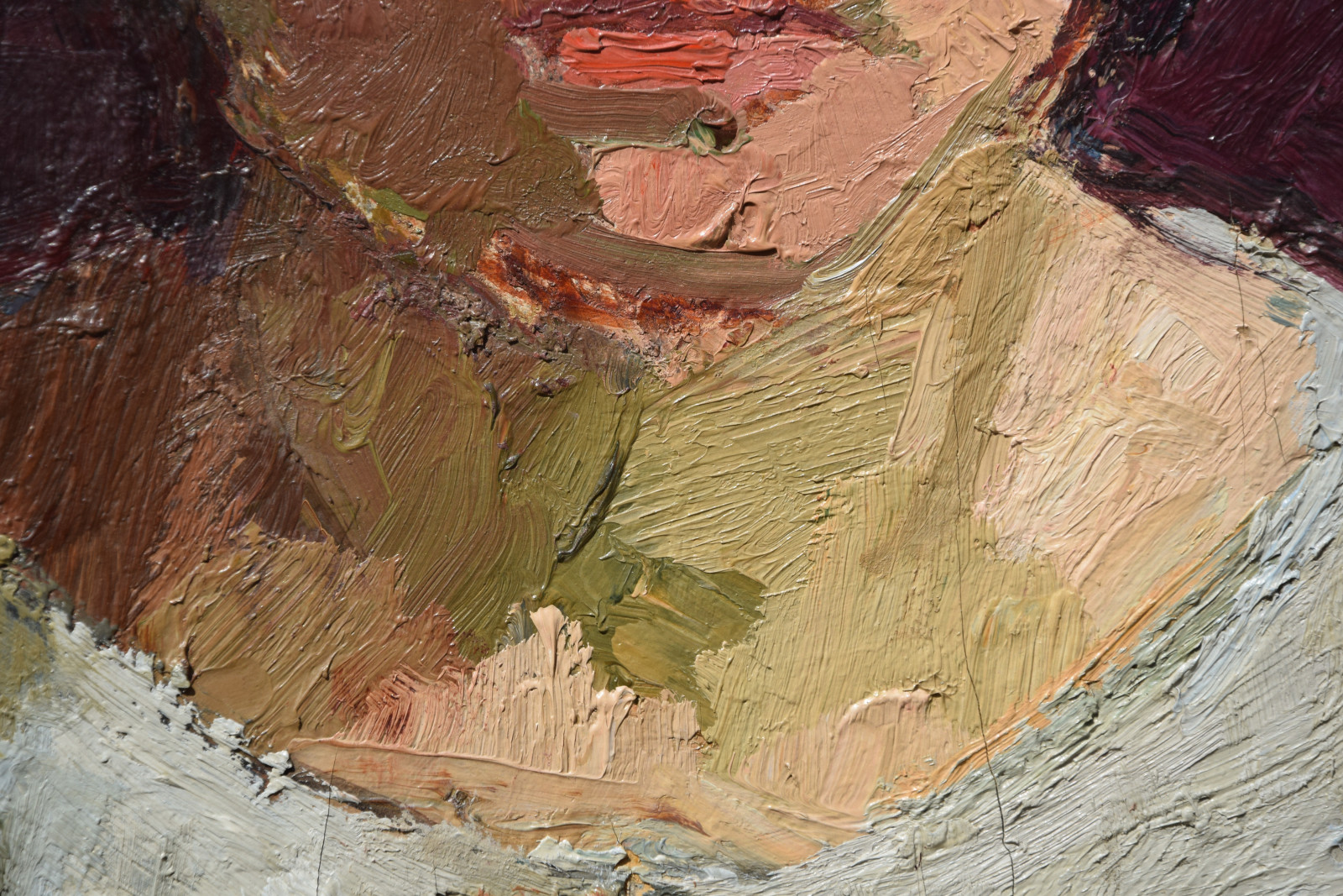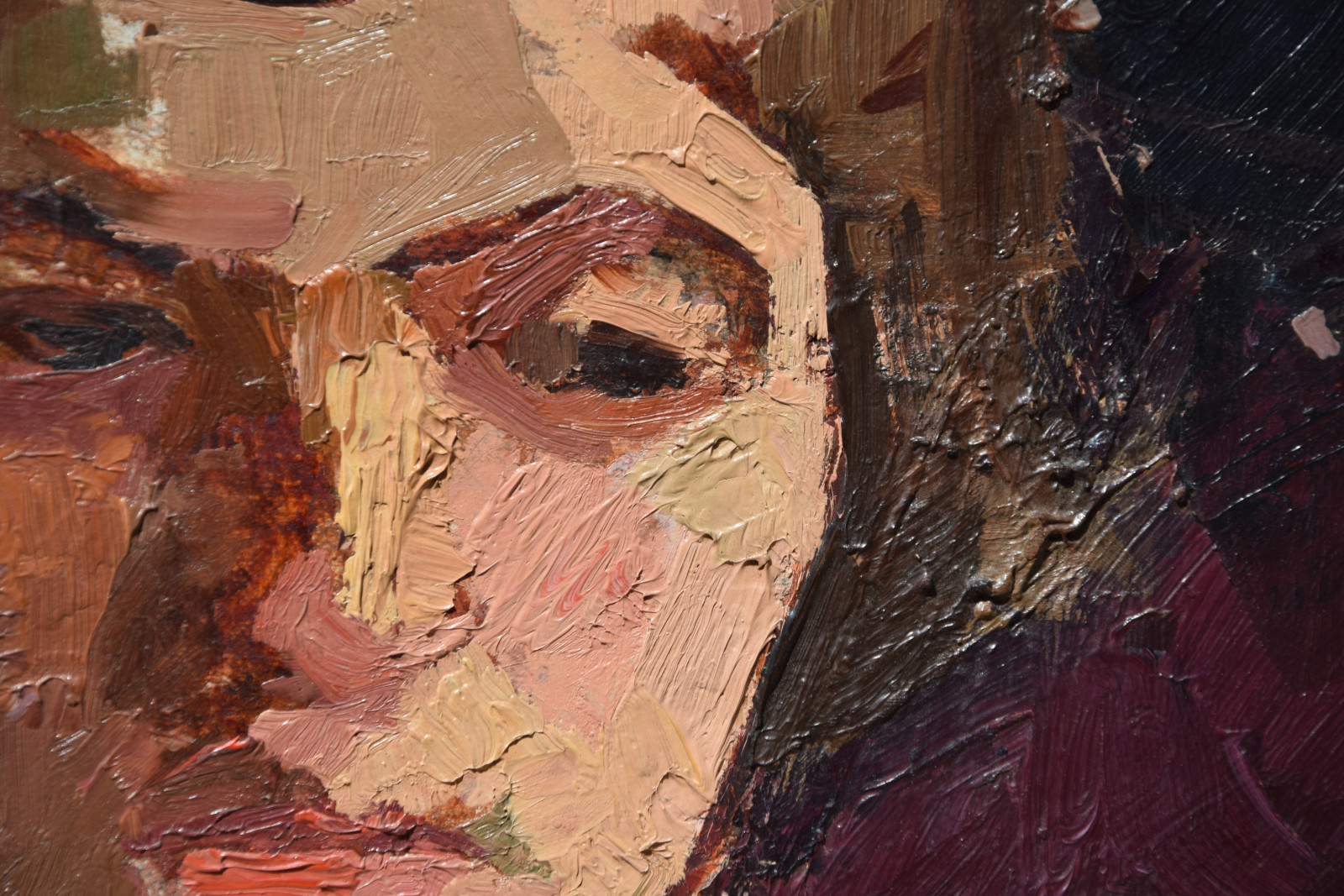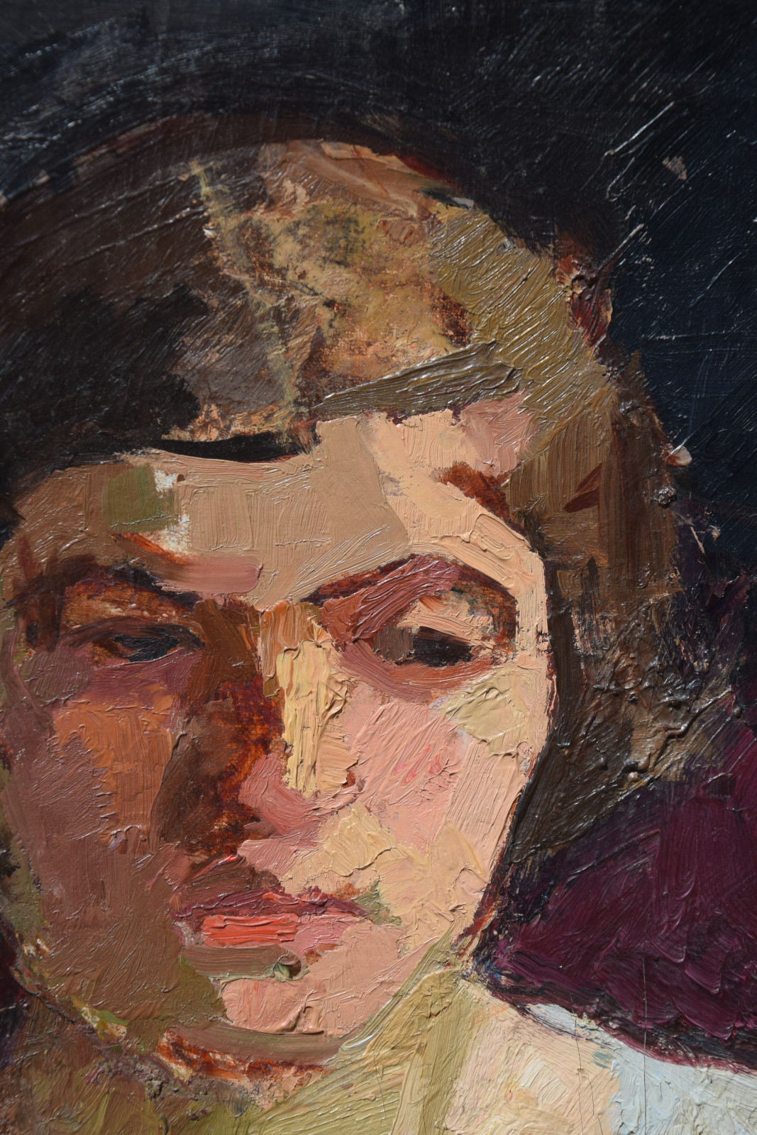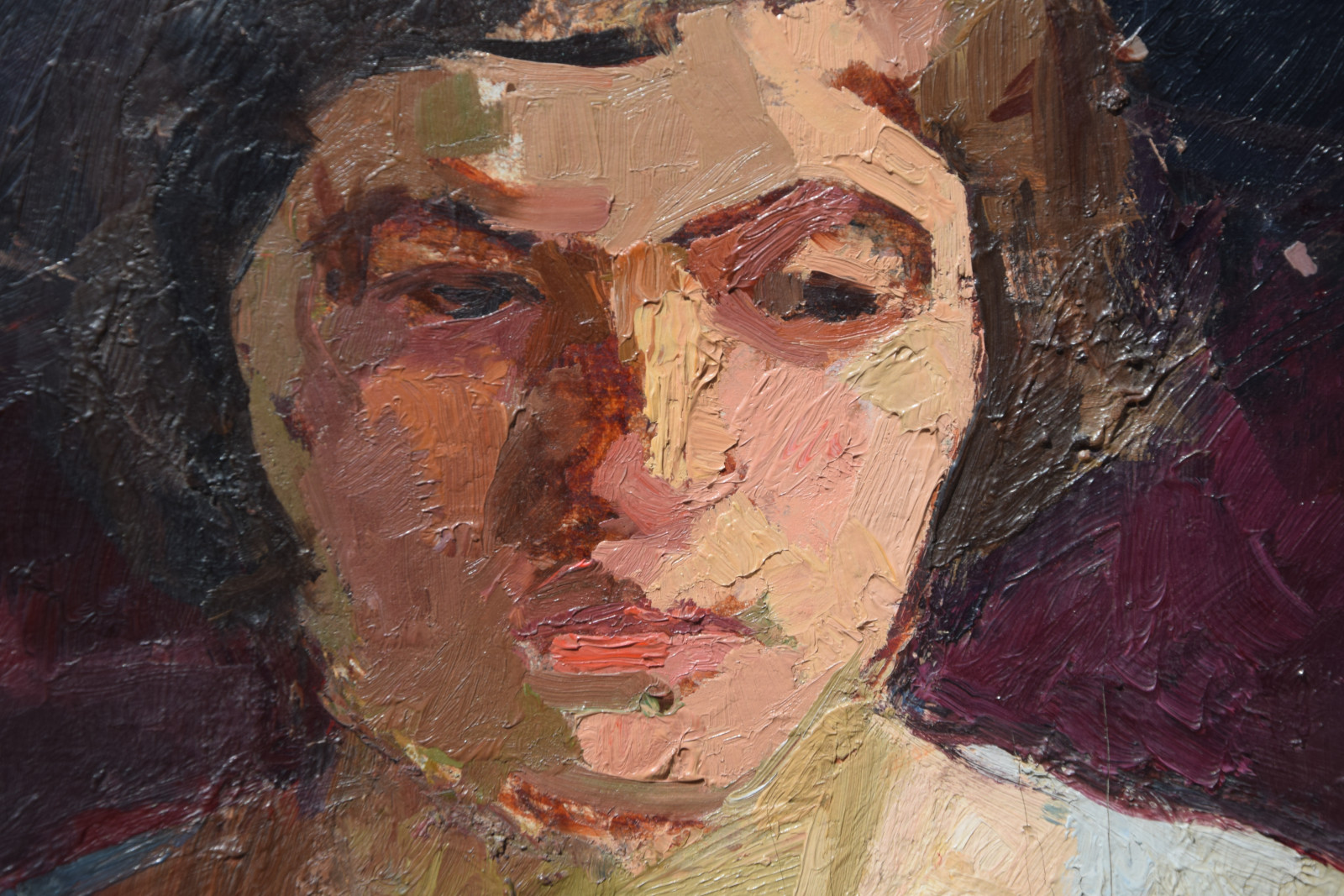 In vornehmlich breiten Pinselstrichen und einem mitunter leicht pastosen Farbauftrag entsteht ein ganz eigentümliches, herbes, aber auch gefühlvolles Bildnis. Während das junge Alter und das helle Kleid eher eine Zartheit vermuten lassen, so sieht Charlotte Hilmer hier vielmehr Ernst und Persönlichkeit. Dementsprechend wirkt der Mund beinahe bewusst verschlossen, ohne jegliches Lächeln. Und es ist gerade das Gesicht, welches einen deutlich hohen Abstraktionsgrad aufweist – die einzelnen Farbflächen überlagern sich mitunter, wirken impulsiv gesetzt. Einzig die markant dunklen Augen und der schmale rote Mund bilden Orientierungspunkte innerhalb dieses tiefgründig traurigen, früh gealterten Gesichtes.