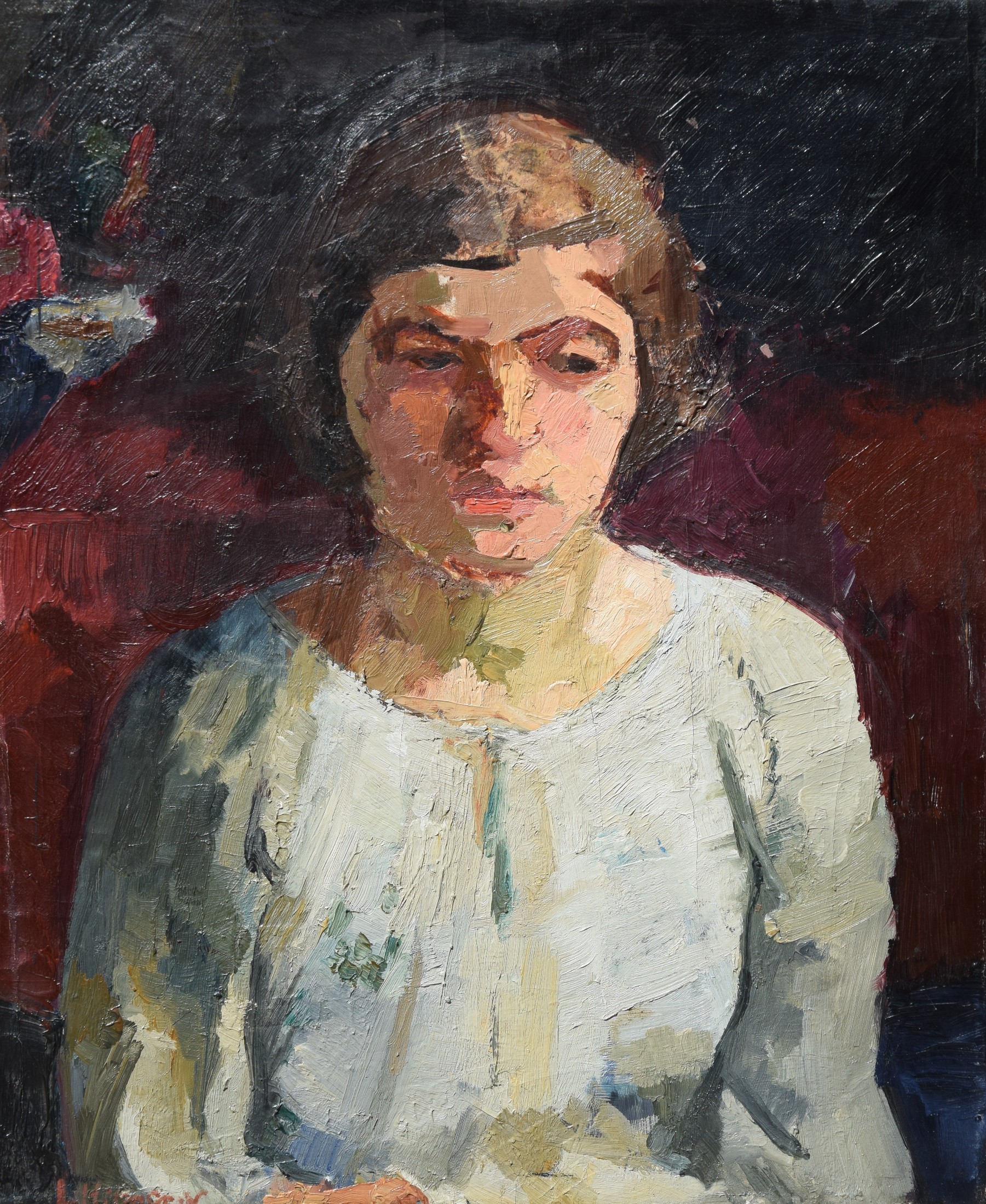 In vornehmlich breiten Pinselstrichen und einem mitunter leicht pastosen Farbauftrag entsteht ein ganz eigentümliches, herbes, aber auch gefühlvolles Bildnis. Während das junge Alter und das helle Kleid eher eine Zartheit vermuten lassen, so sieht Charlotte Hilmer hier vielmehr Ernst und Persönlichkeit. Dementsprechend wirkt der Mund beinahe bewusst verschlossen, ohne jegliches Lächeln. Und es ist gerade das Gesicht, welches einen deutlich hohen Abstraktionsgrad aufweist – die einzelnen Farbflächen überlagern sich mitunter, wirken impulsiv gesetzt. Einzig die markant dunklen Augen und der schmale rote Mund bilden Orientierungspunkte innerhalb dieses tiefgründig traurigen, früh gealterten Gesichtes.