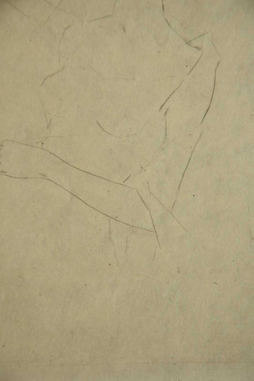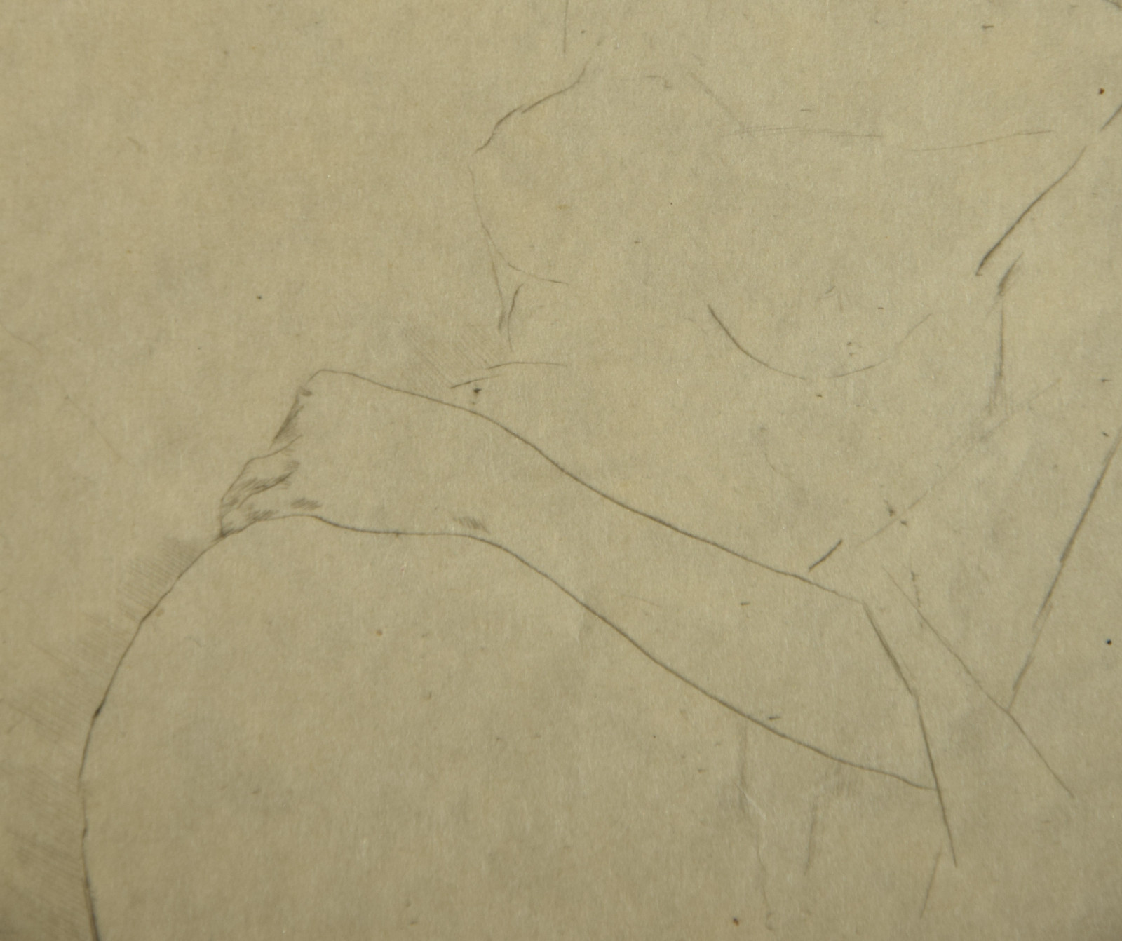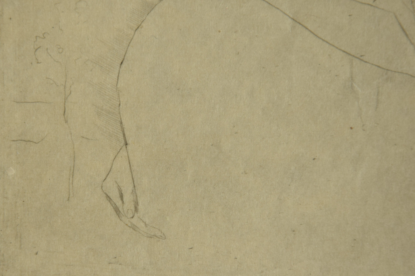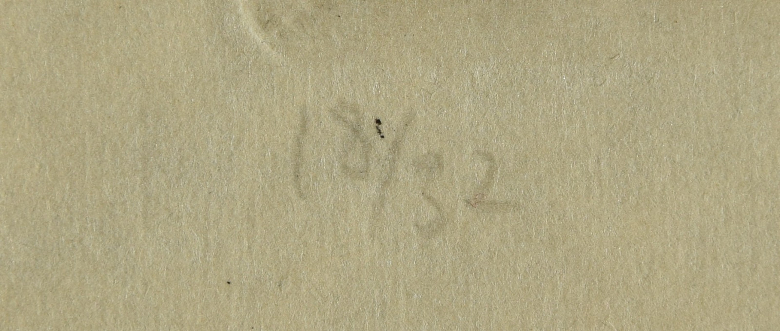 die beiden linken Ecken und die Ecke oben rechts mit Knickspuren; leichte Druckstellen im Blatt; am linken Rand oben kleiner dunkler Fleck; verso unten mittig kleiner dunkler Fleck
