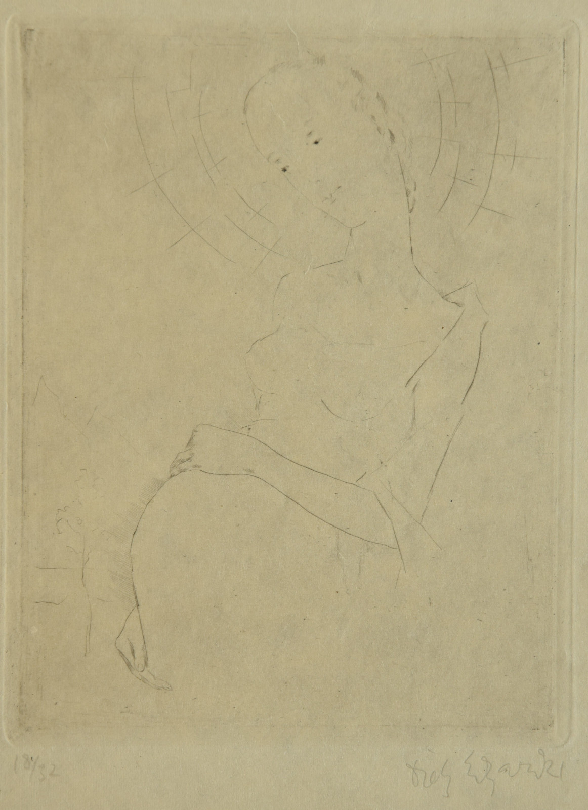 „E.[dzard] beginnt in der Zeit des 1.WK und danach mit düster gestimmten relig. Motiven (Ausstattung einer Kriegergedächtnis-Kap. in Mlawa/Ostpreußen, 1915; Madonna, 1916; Beweinung, Kniender Mensch, 1919) und Rad. in einer zurückgenommenen, durchsichtigen Linienführung (Zyklus Ave Maria nach Thomas von Kempen, 1920; Alte Marienlieder; Ill. zu Ein schwaches Herz von F.M. Dostojewski, beide M. 1923; Die rote Blume von Garschin sowie Wij von Gogol, beide M. 1924; Der Abendpfeifer von R.H. Bartsch, L. 1925).” [1]