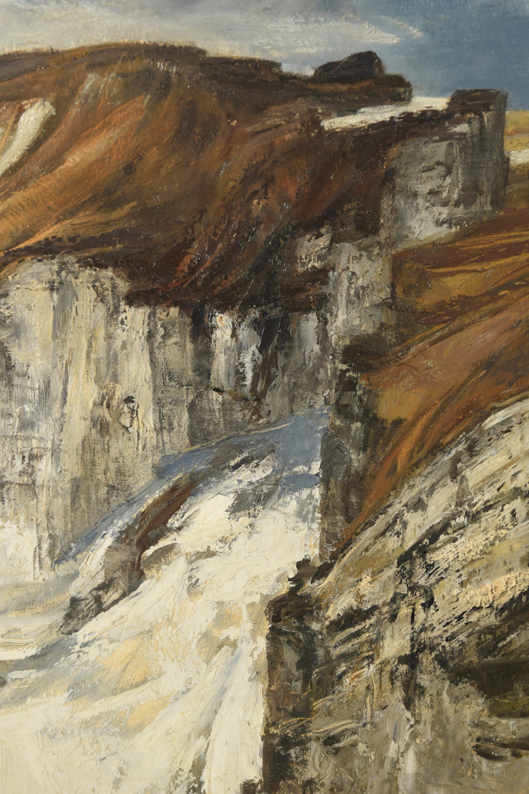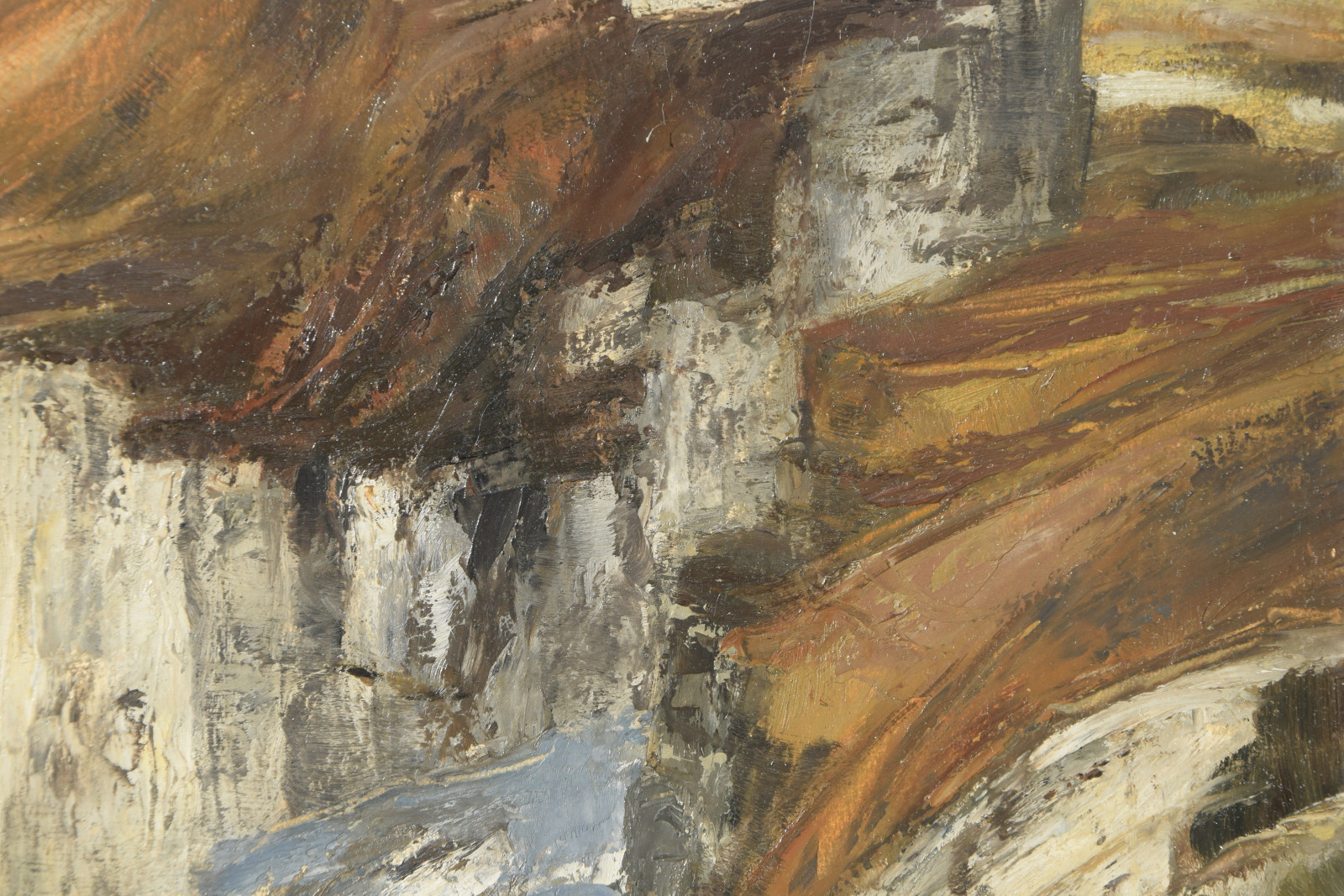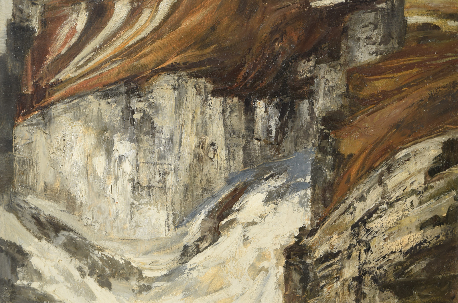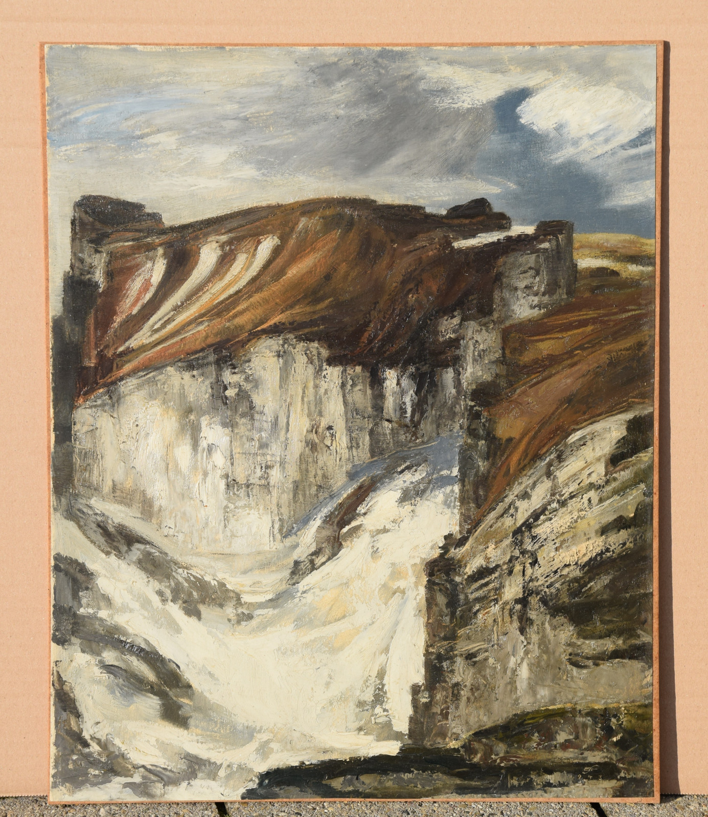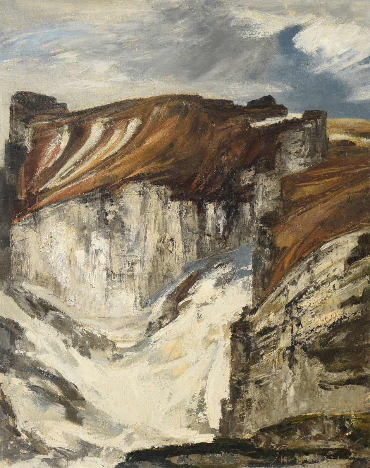 Ganz erstaunlich ist bei dieser Gebirgslandschaft der hohe Abstraktionsgrad mit der der Künstler das Motiv wiedergibt. Unter dem bläulichem Himmel zeigt sich eine Landschaft, die den Betrachter zu einer gewissen Ruhe und Konzentration zwingt. In breiten aufgetragenen Strichen formt sich so ein Bild mit Hügeln und aufragenden grauen Felsen. In der Bildmitte liegt eine Schlucht durch die ein in zartem Blau ausgeführtes Gewässer fließt.