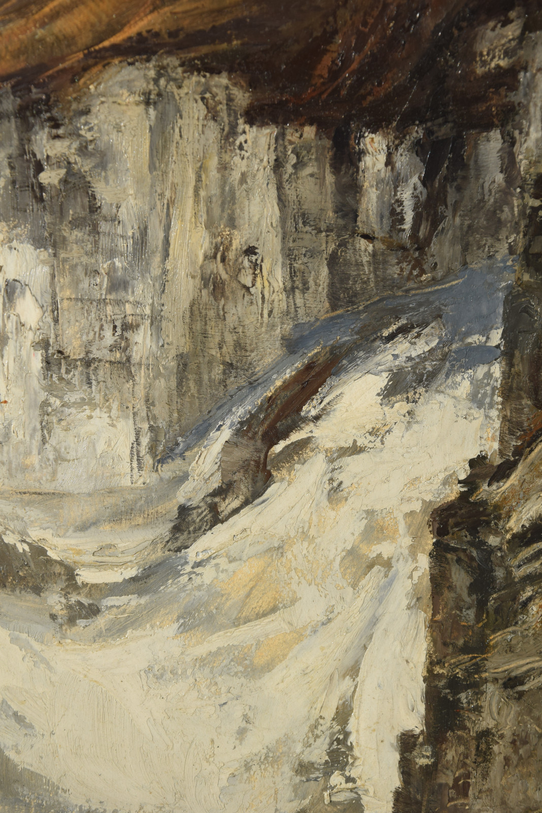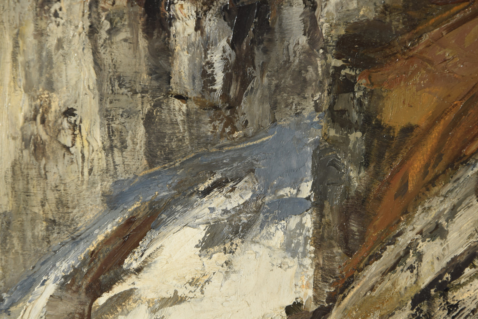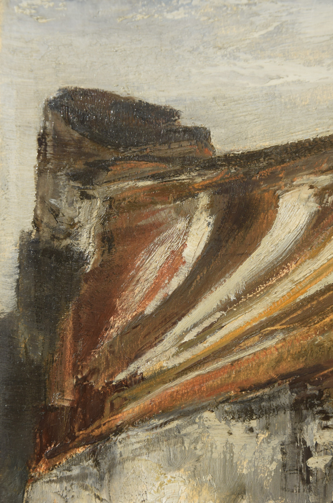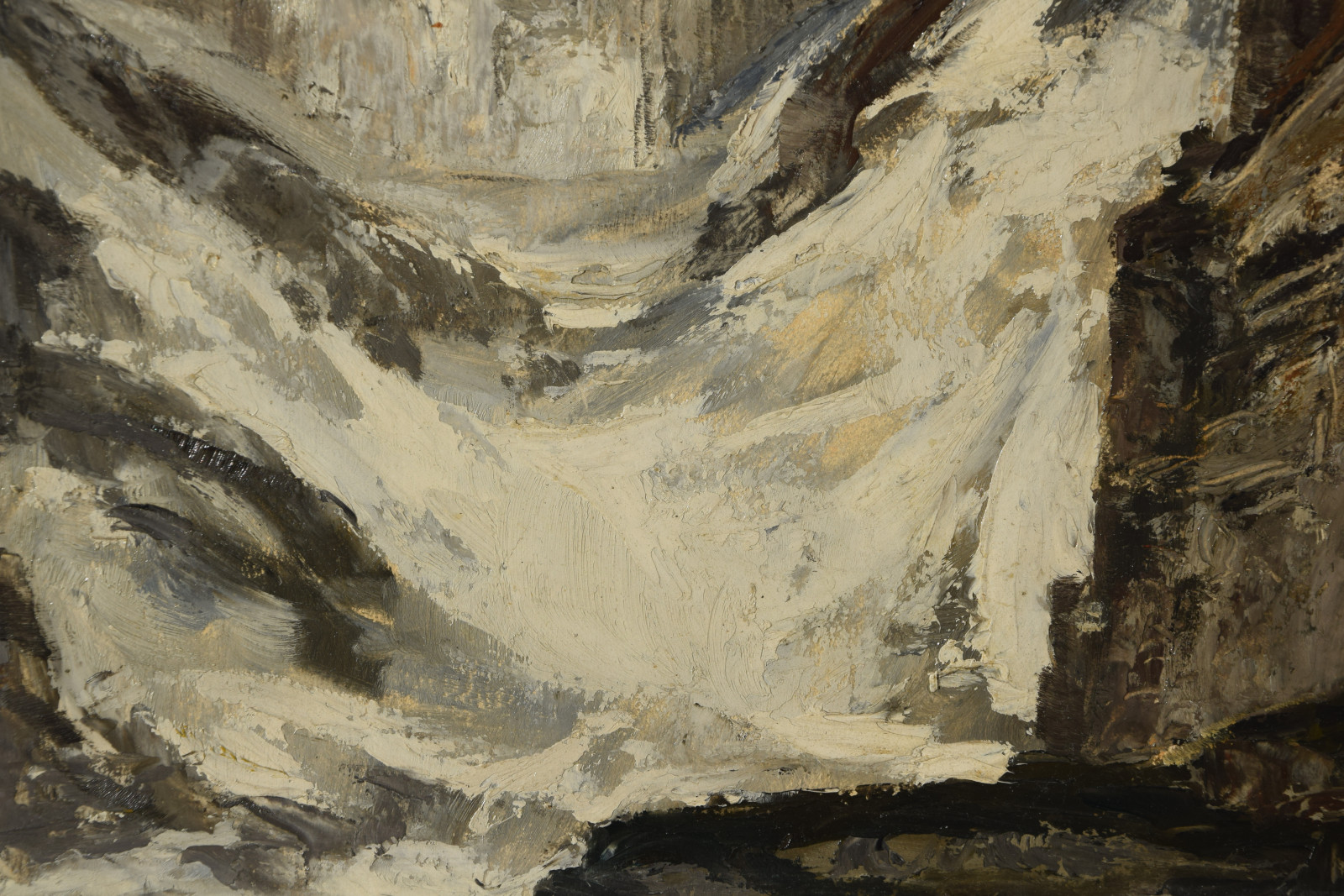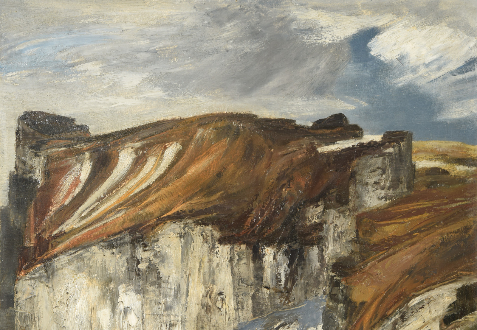 Ganz erstaunlich ist bei dieser Gebirgslandschaft der hohe Abstraktionsgrad mit der der Künstler das Motiv wiedergibt. Unter dem bläulichem Himmel zeigt sich eine Landschaft, die den Betrachter zu einer gewissen Ruhe und Konzentration zwingt. In breiten aufgetragenen Strichen formt sich so ein Bild mit Hügeln und aufragenden grauen Felsen. In der Bildmitte liegt eine Schlucht durch die ein in zartem Blau ausgeführtes Gewässer fließt.
