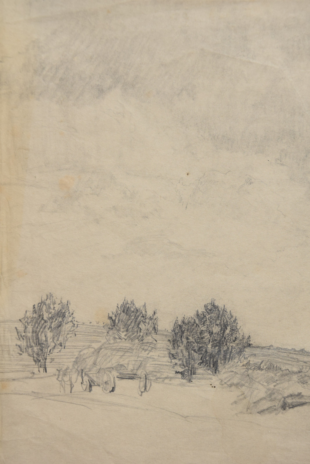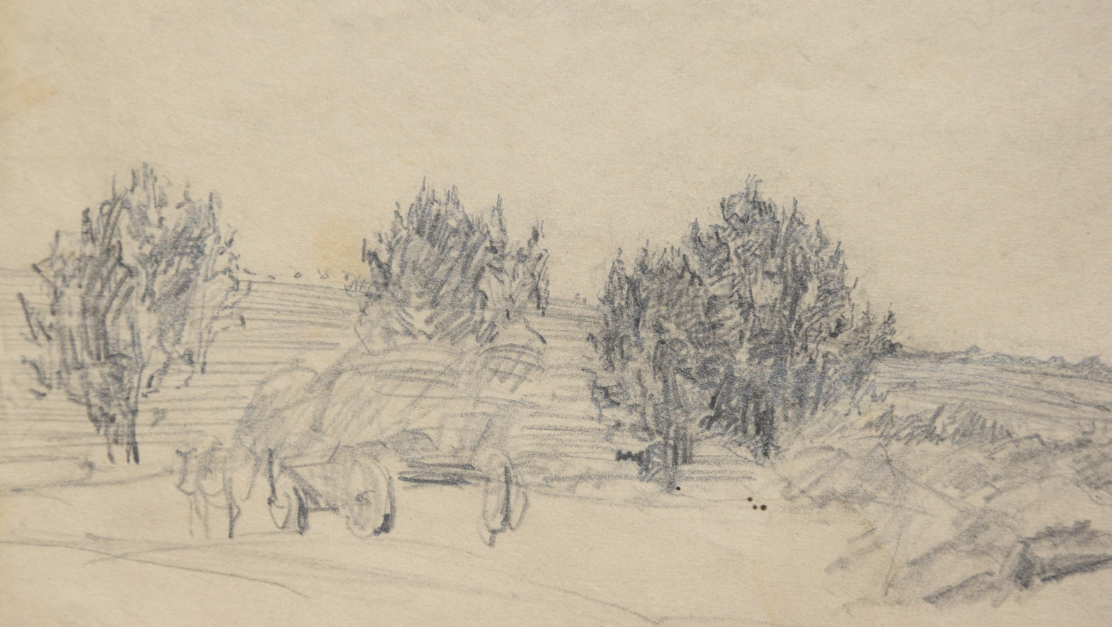 ohne Titel [weite Erntelandschaft, links im Bild ein wegfahrender, beladener Heuwagen, im Hintergrund einzelne (Obst-)Bäume]