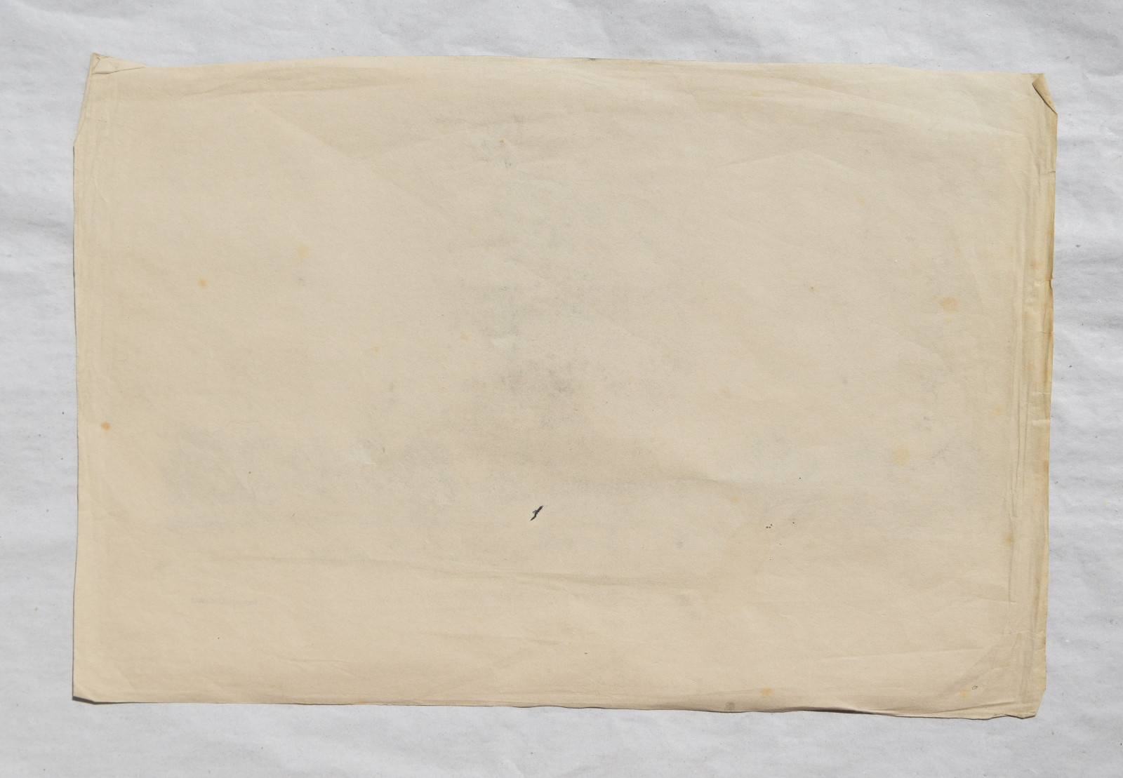 linker Rand etwas gebräunt, sowie knittrig und mit kleinen Einrissen; oberer Rand rechts knittrig und mit Faltspuren; Ecken etwas bestoßen und mit leichten Knickspuren; leicht (stock-)fleckig; rechter Rand mittig bräunlicher Fleck; rechter Rand etwas knittrig; verso leicht fleckig