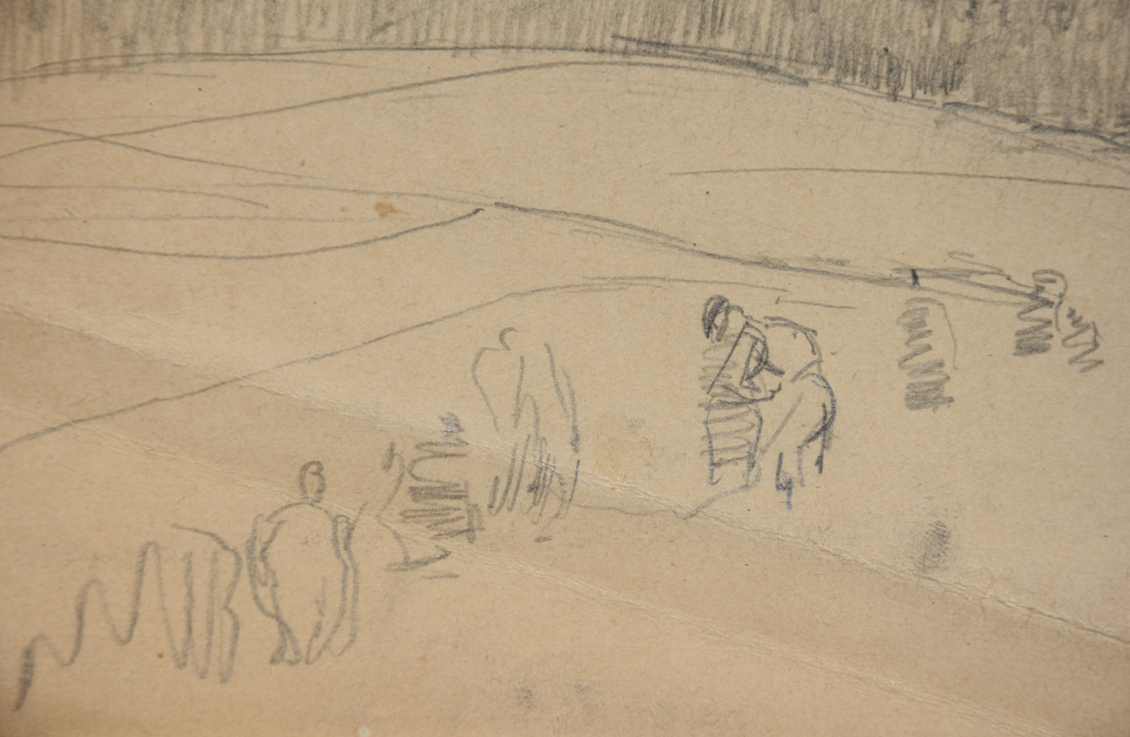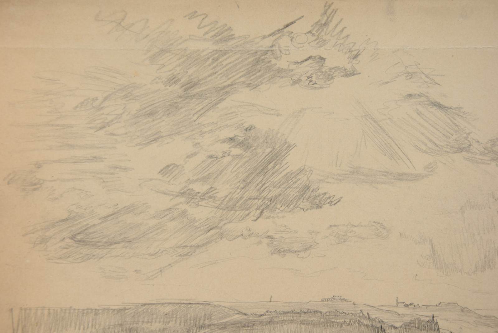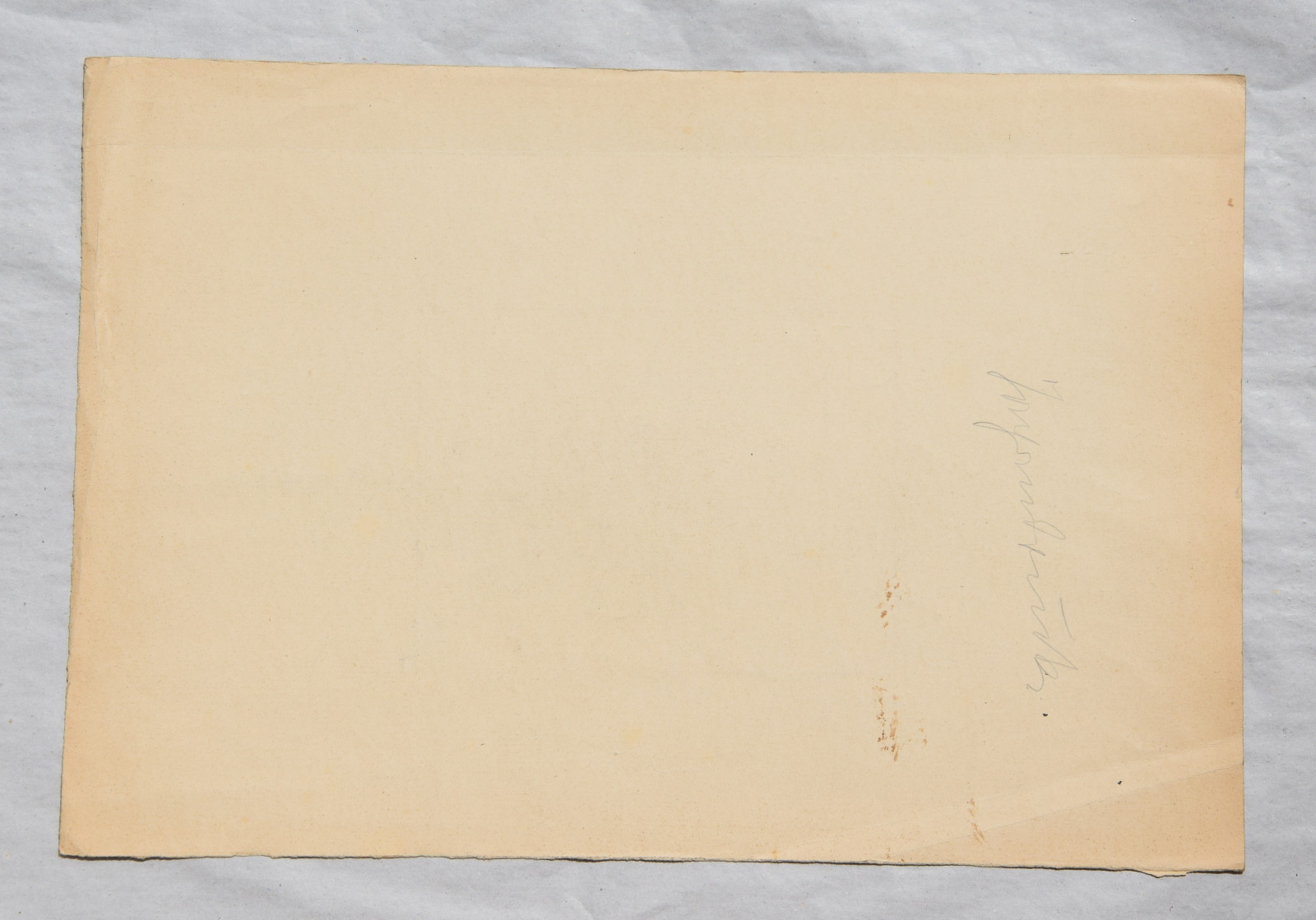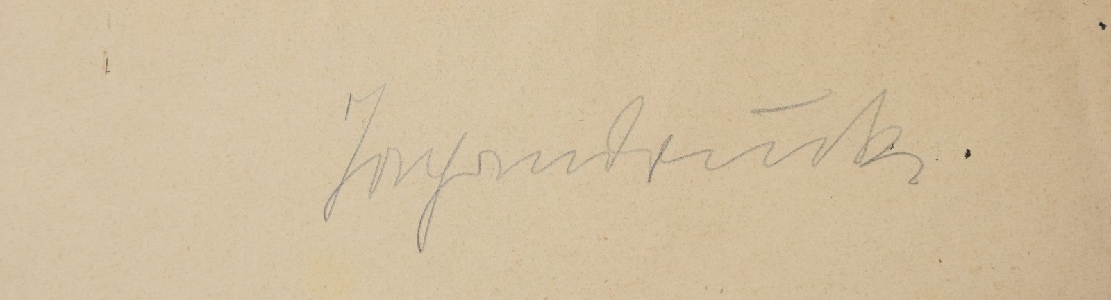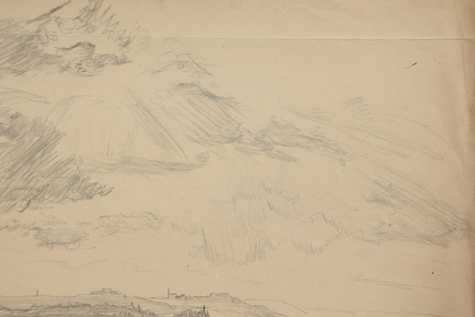 im oberen Bereich mit durchgehender horizontaler Knickspur; im Eckbereich unten links Knickspuren; die vier Ecken etwas bestoßen; am unteren Rand Abrissspuren; rechter Rand etwas bestoßen und mittig mit Quetschung; insgesamt leicht nachgedunkelt und etwas gebräunt; leichte Druckstellen im Blatt; verso etwas fleckig; verso rechts braunfleckig und in Blei bez.