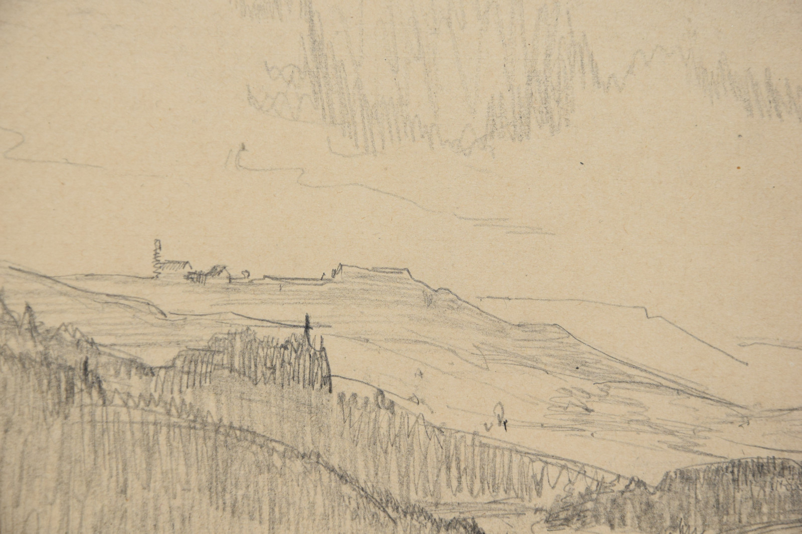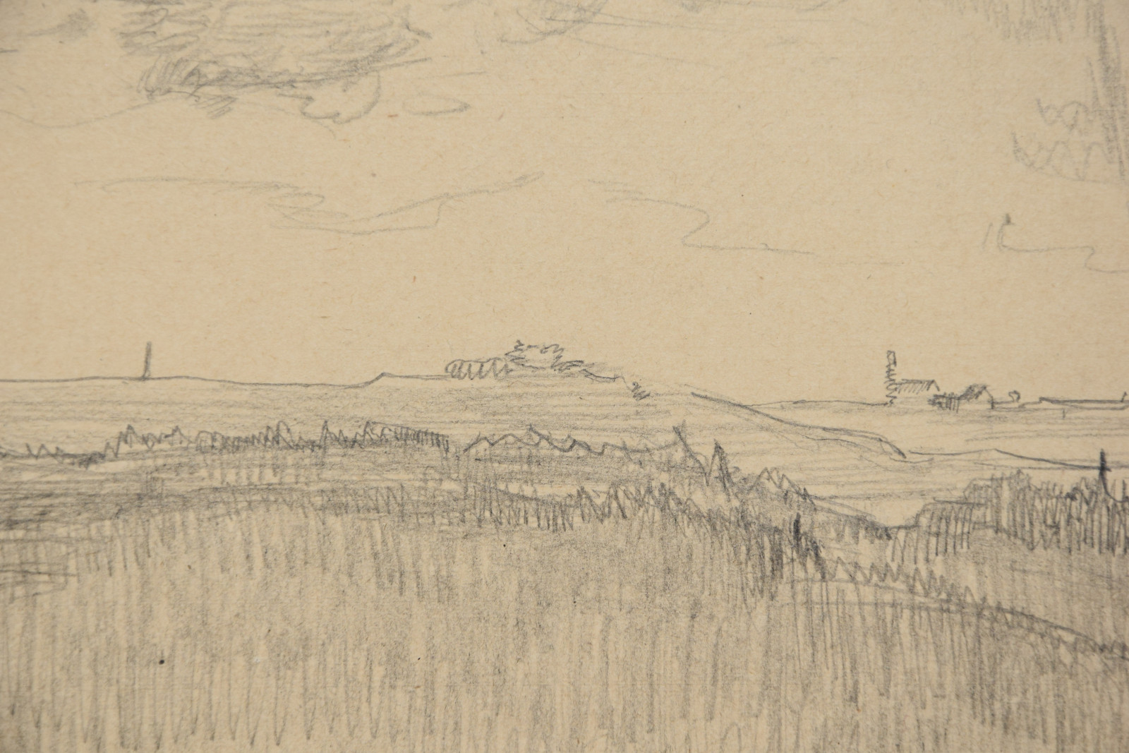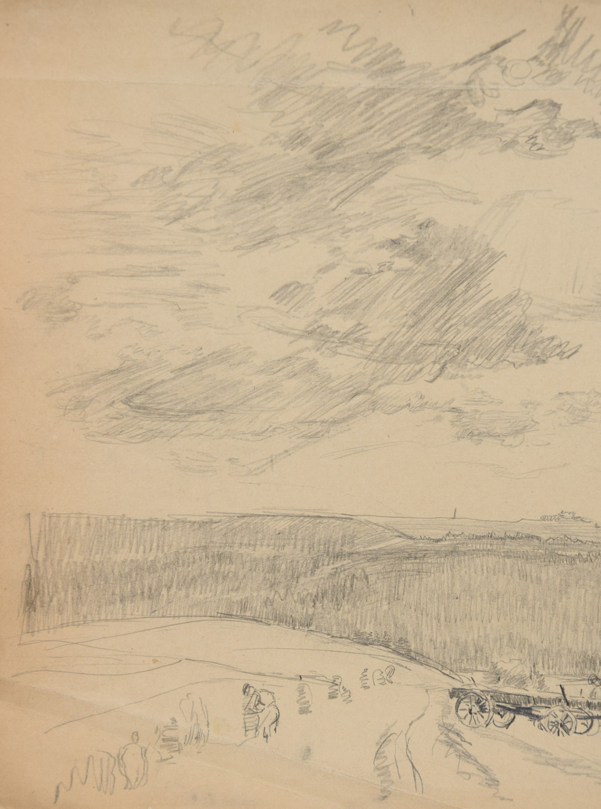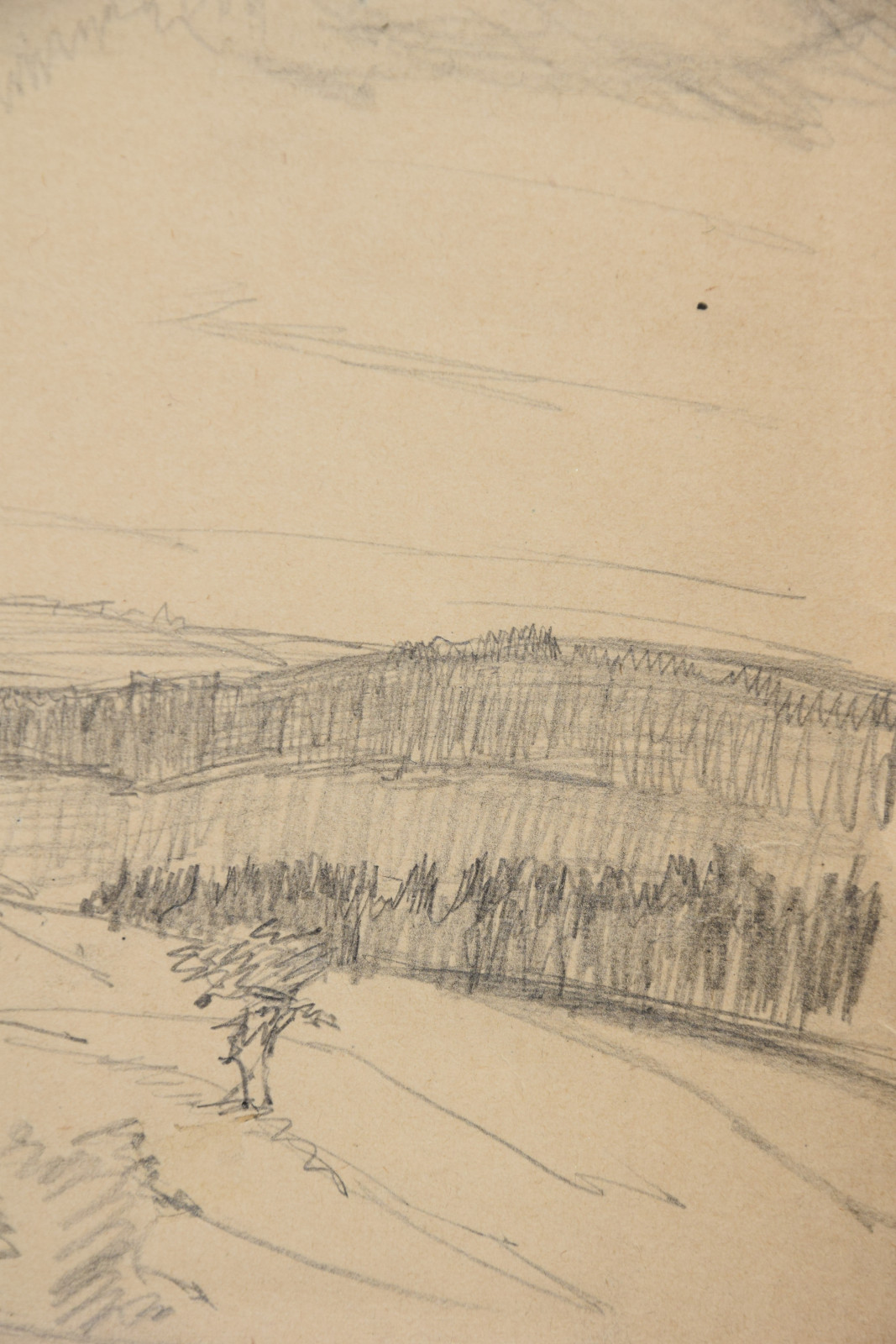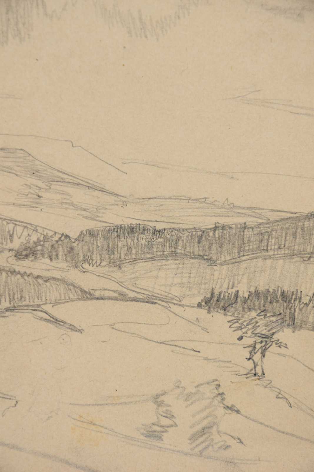 im oberen Bereich mit durchgehender horizontaler Knickspur; im Eckbereich unten links Knickspuren; die vier Ecken etwas bestoßen; am unteren Rand Abrissspuren; rechter Rand etwas bestoßen und mittig mit Quetschung; insgesamt leicht nachgedunkelt und etwas gebräunt; leichte Druckstellen im Blatt; verso etwas fleckig; verso rechts braunfleckig und in Blei bez.