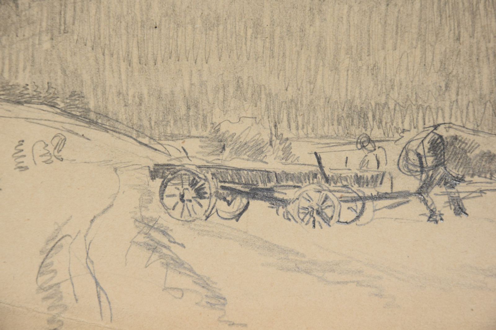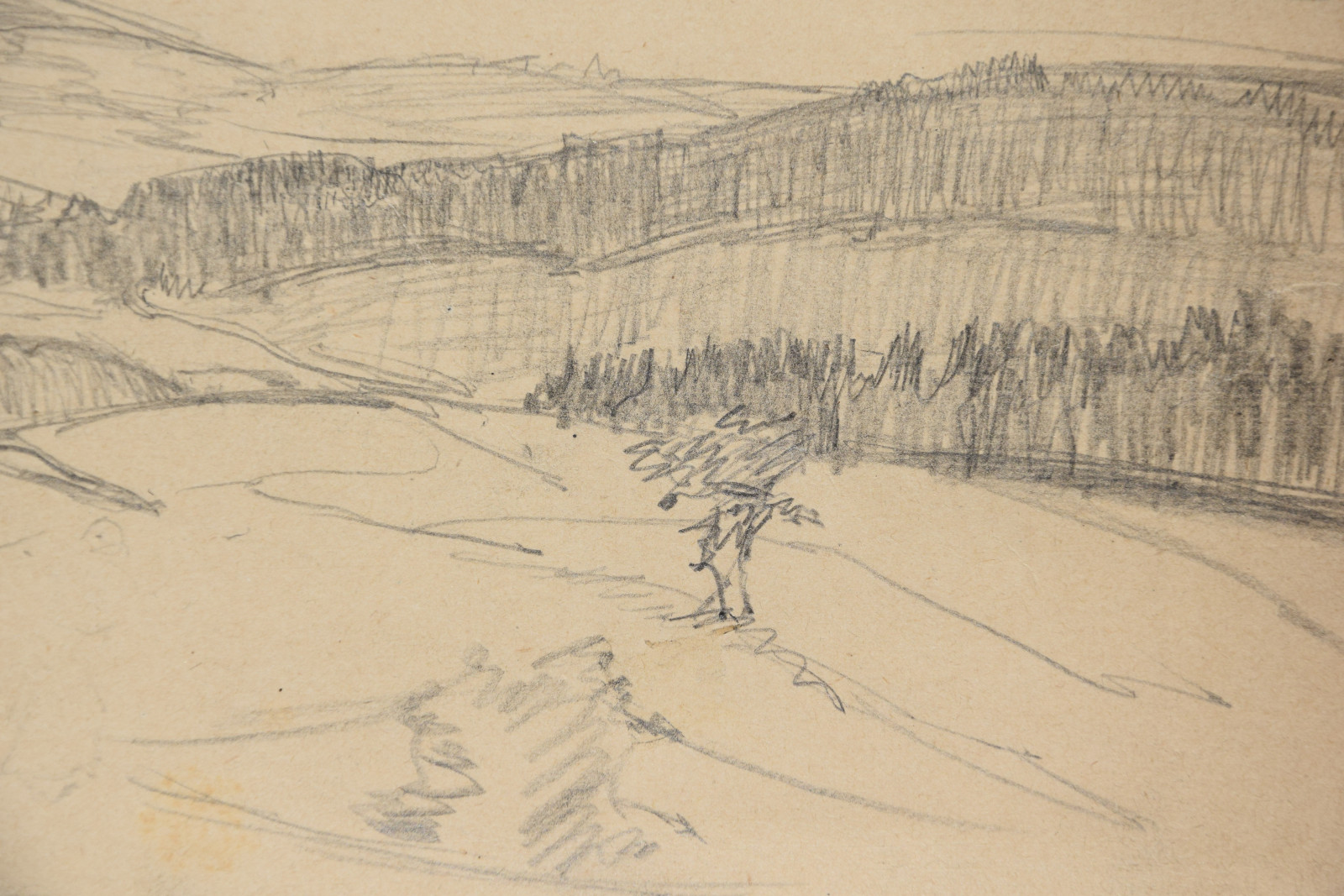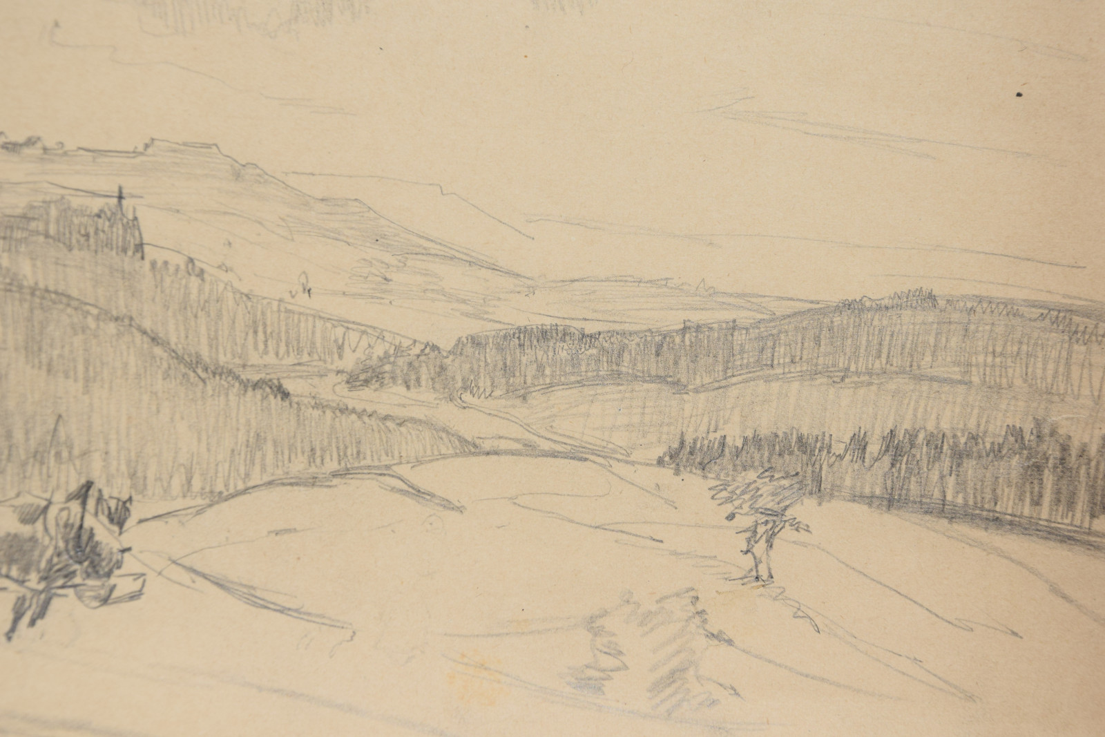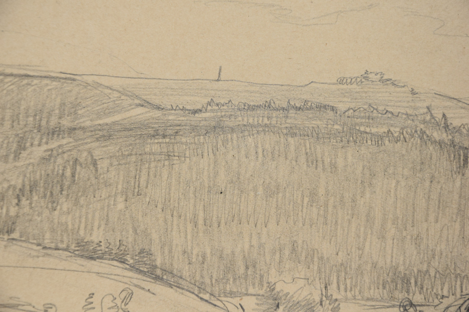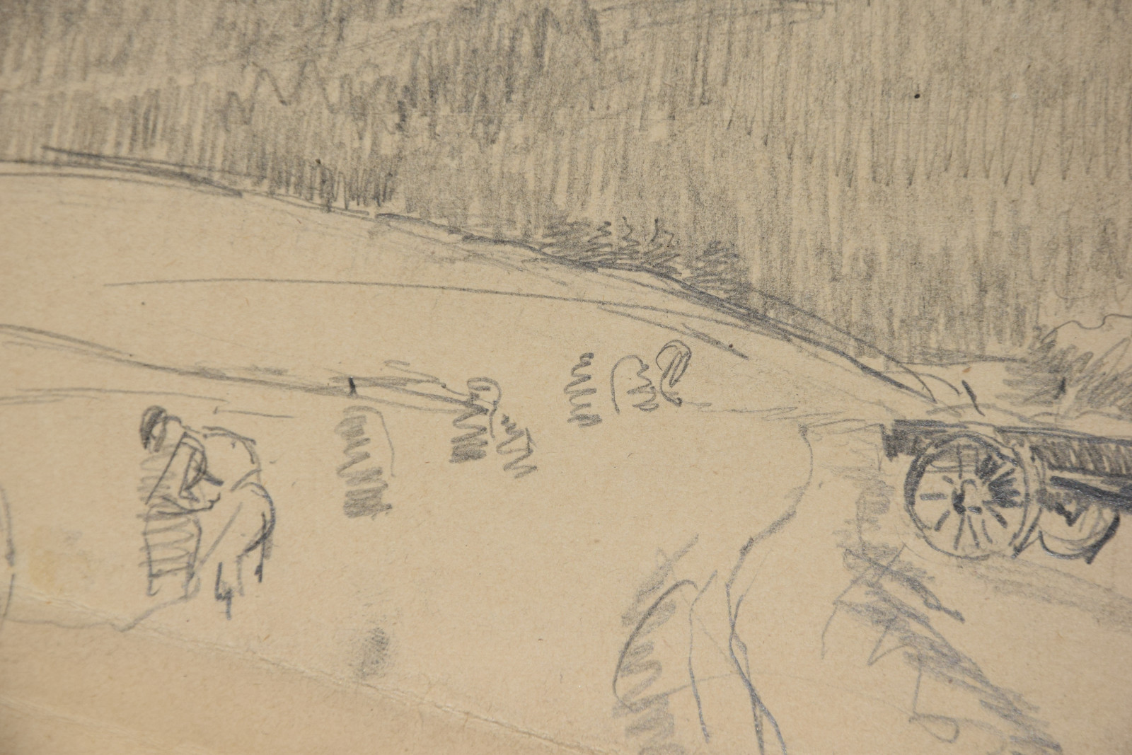 im oberen Bereich mit durchgehender horizontaler Knickspur; im Eckbereich unten links Knickspuren; die vier Ecken etwas bestoßen; am unteren Rand Abrissspuren; rechter Rand etwas bestoßen und mittig mit Quetschung; insgesamt leicht nachgedunkelt und etwas gebräunt; leichte Druckstellen im Blatt; verso etwas fleckig; verso rechts braunfleckig und in Blei bez.