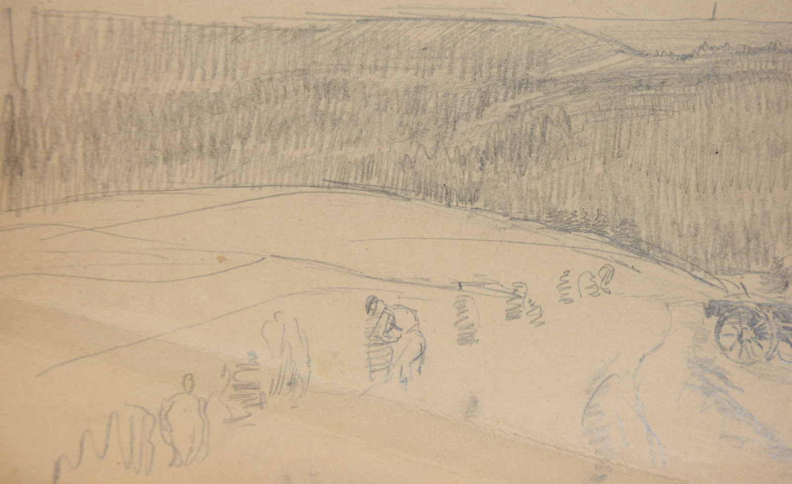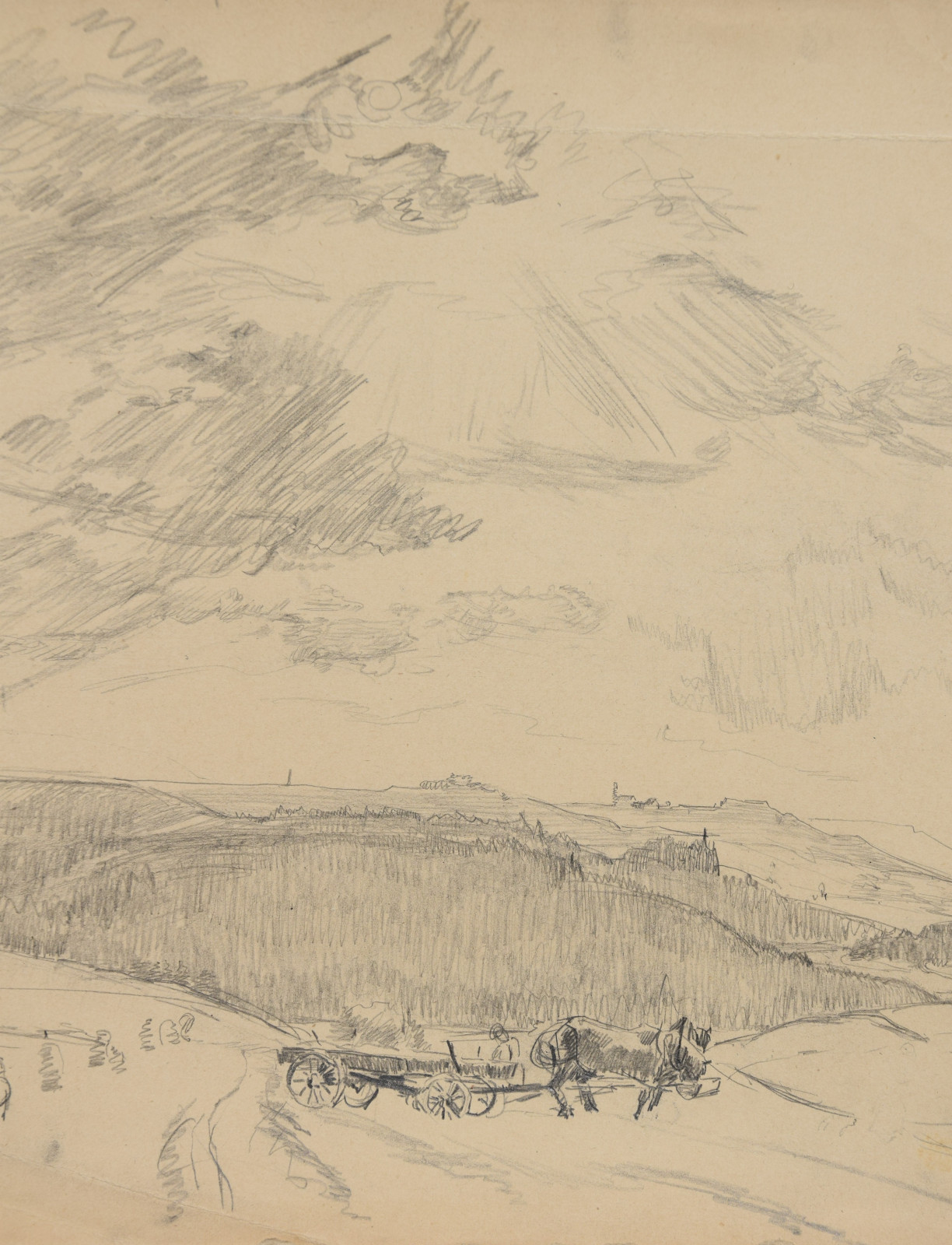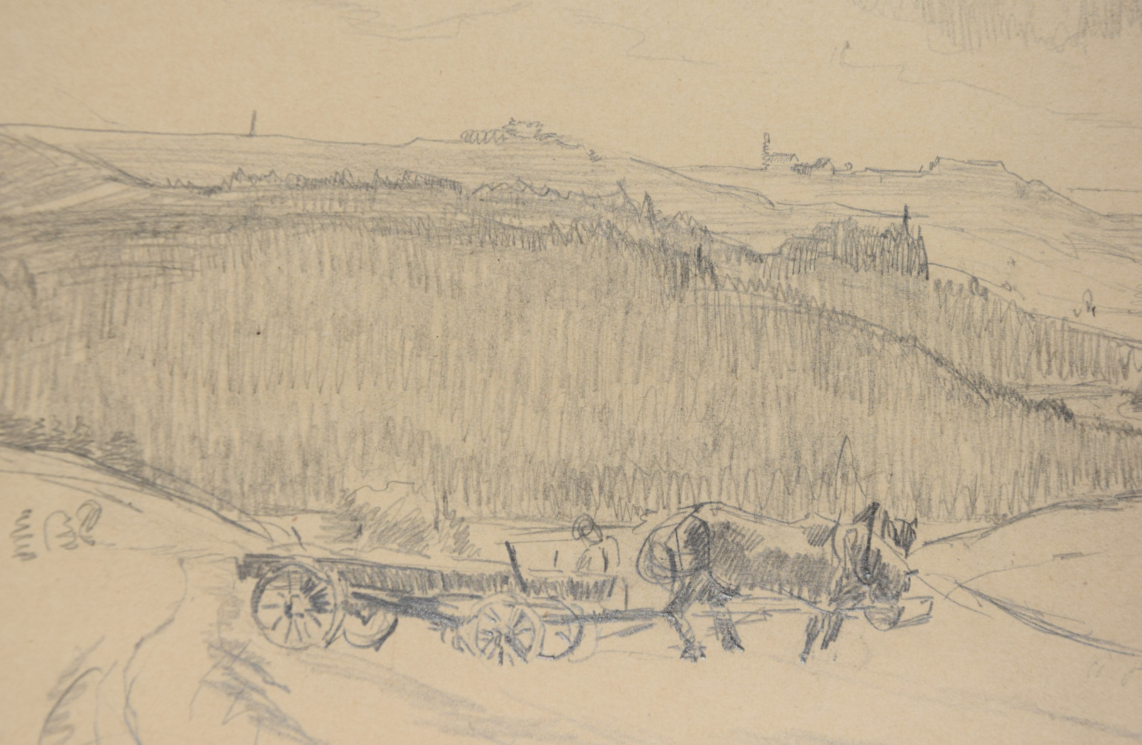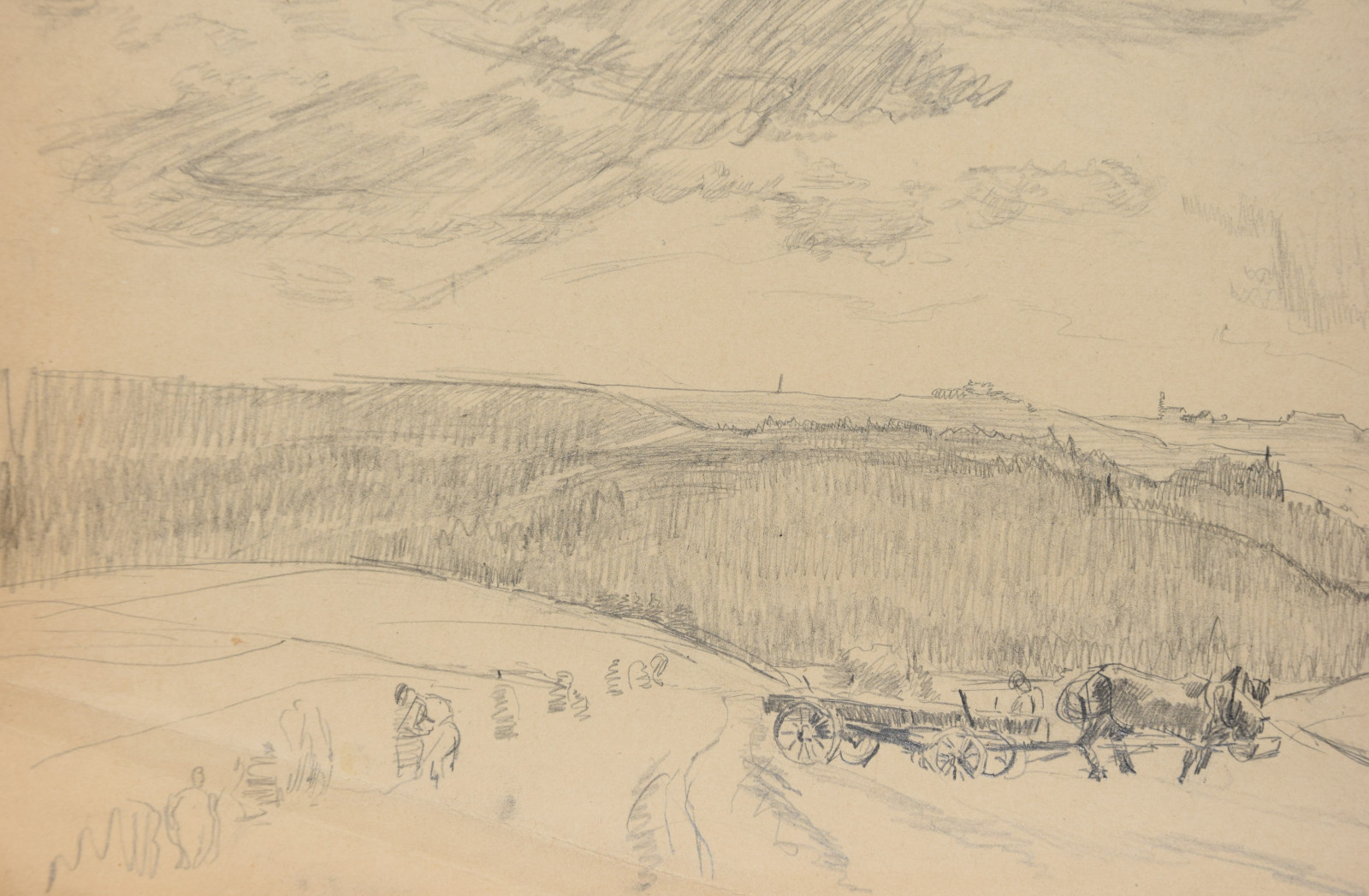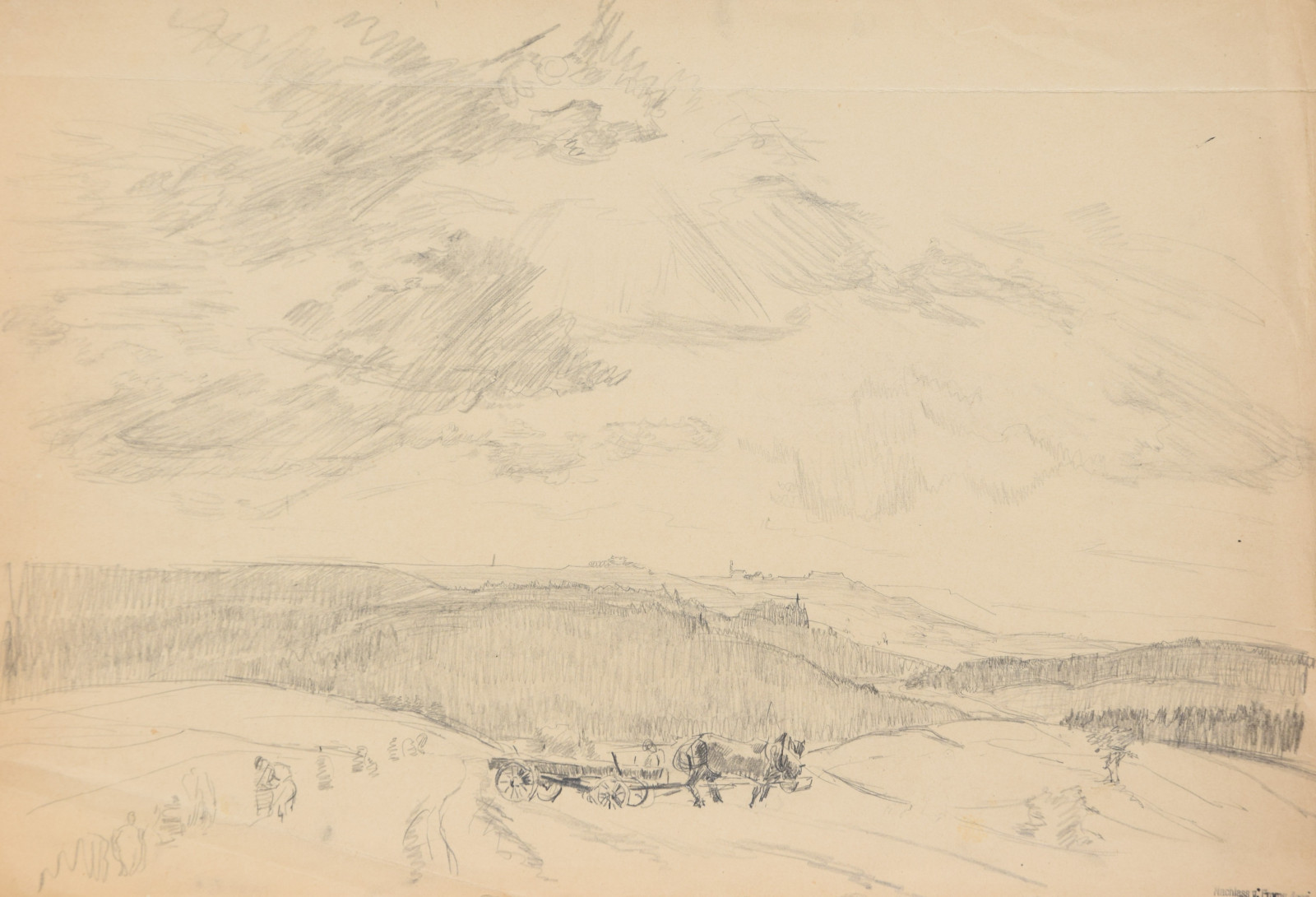 ohne Titel [weite sommerliche Landschaft mit Arbeitern und Heuwagen im Vordergrund, dahinter Wald und am Horizont die Silhouette von Hohenstadt]