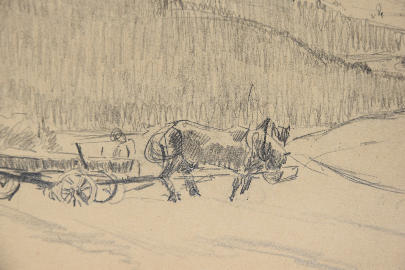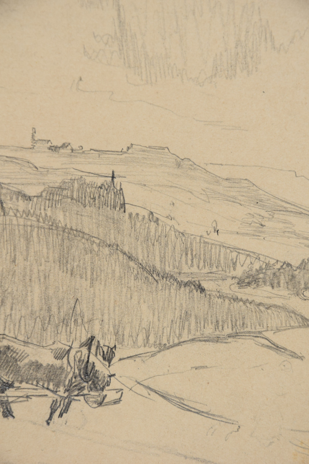 Diese vorliegende Zeichnung wird während eines solchen Sommeraufenthalts entstanden sein. Der Blick führt weit in das Bild hinein – hinweg über die Erntearbeit im Vordergrund, dichte Wälder und einzelne Felder, bis ganz im Hintergrund Hohenstadt mit dem markanten Schloss und der Mariä-Opferungs-kirche sich zeigt – alles gelegen unter einem bei Emma Joos oftmals stark bewegten, tiefen Wolkenhimmel.