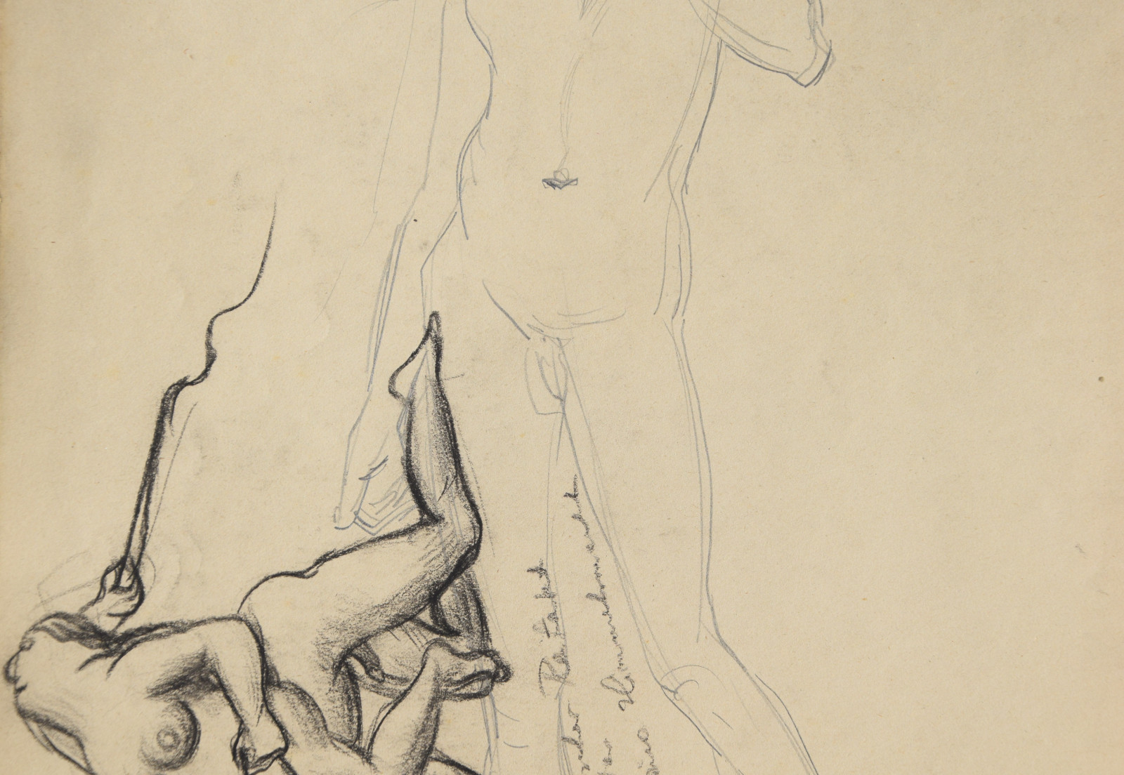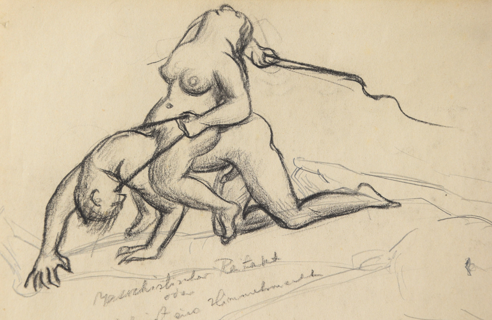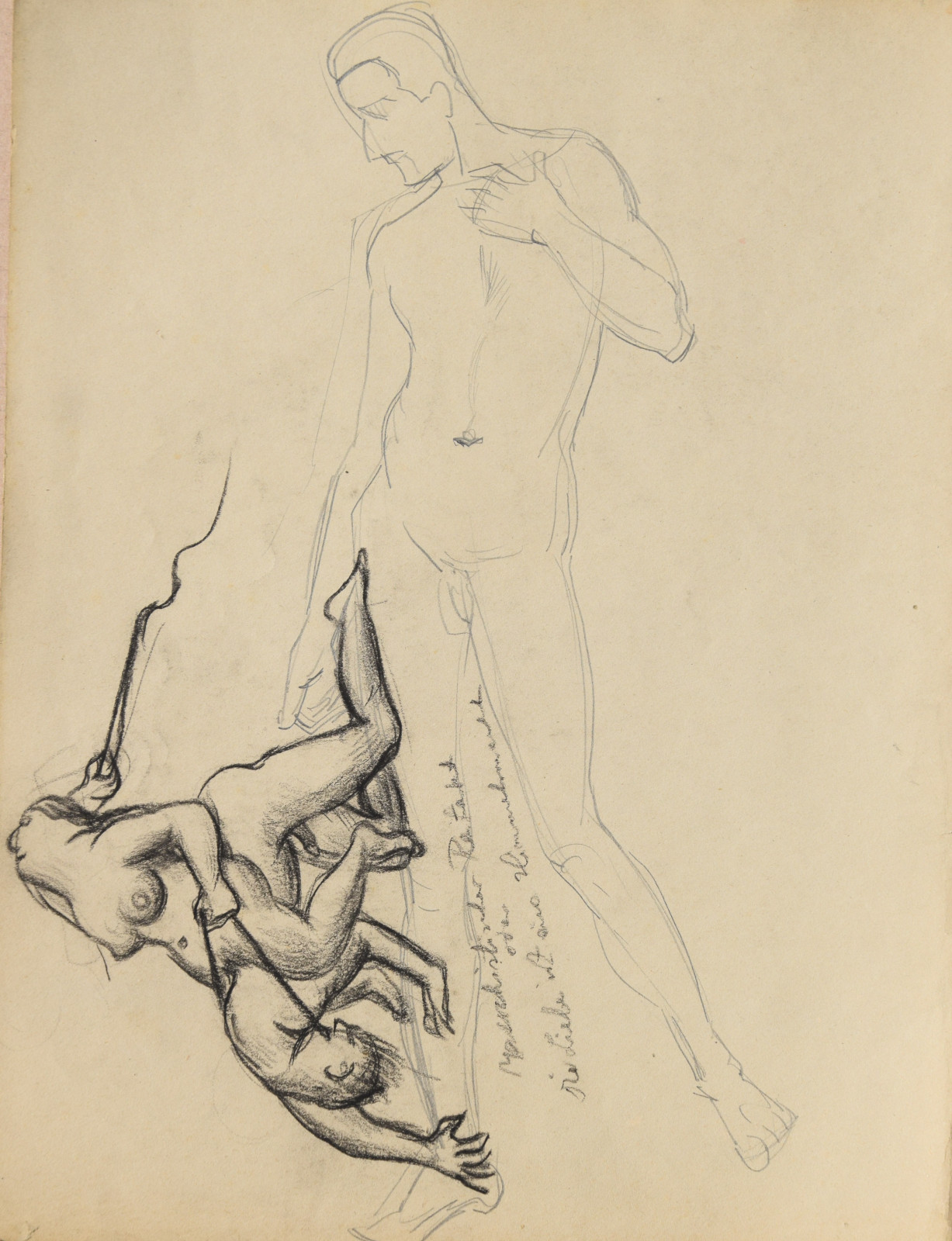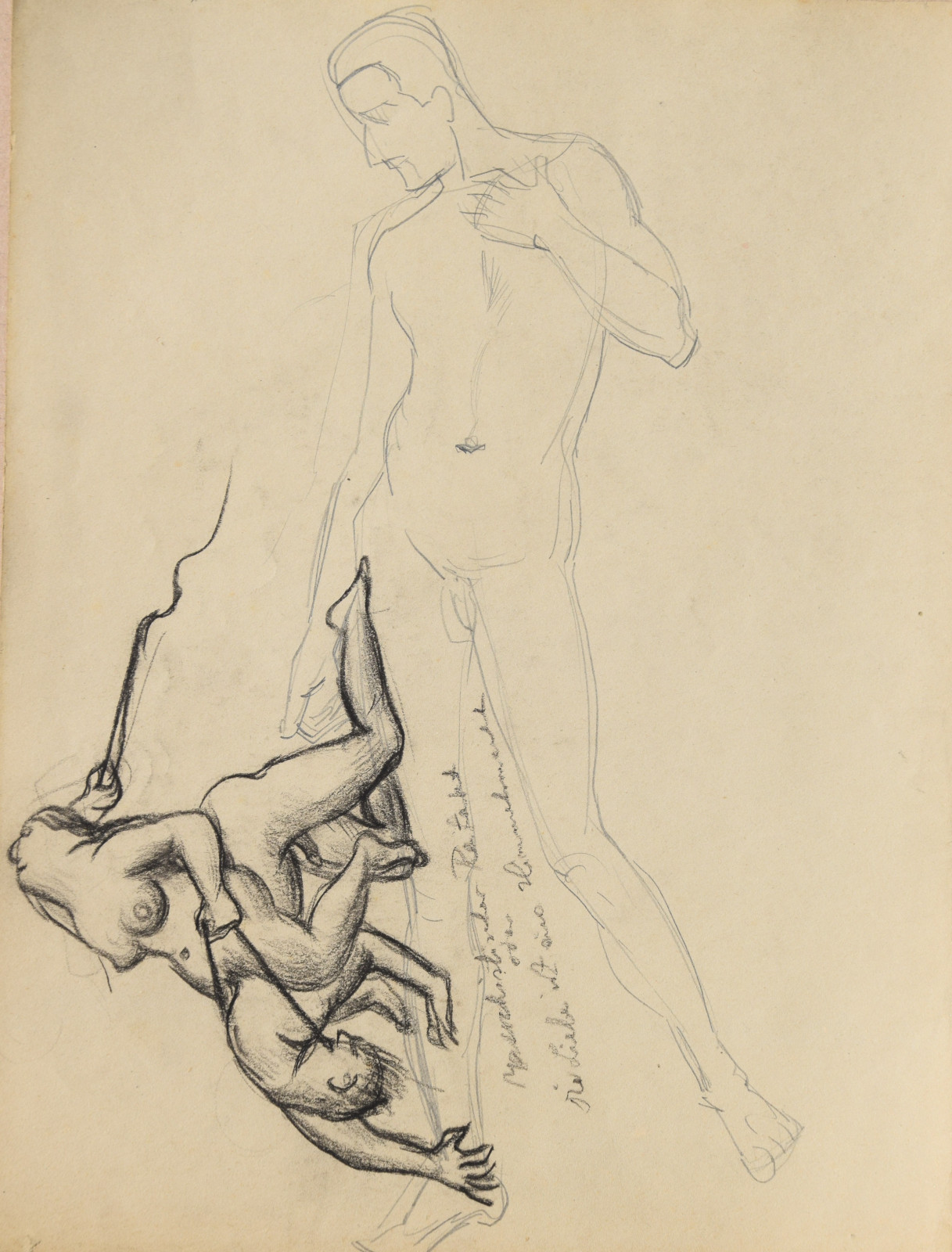 ohne Titel [recto – Studie mit zwei stehenden männlichen Akten / verso – weitere Studie eines stehenden männlichen Aktes, sowie detaillierter ausgeführte Zeichnung einer Flagellantismus-Szene, diese vom Künstler bezeichnet mit „Masochistischer Reitakt oder Die Liebe ist eine Himmelsmacht“]
