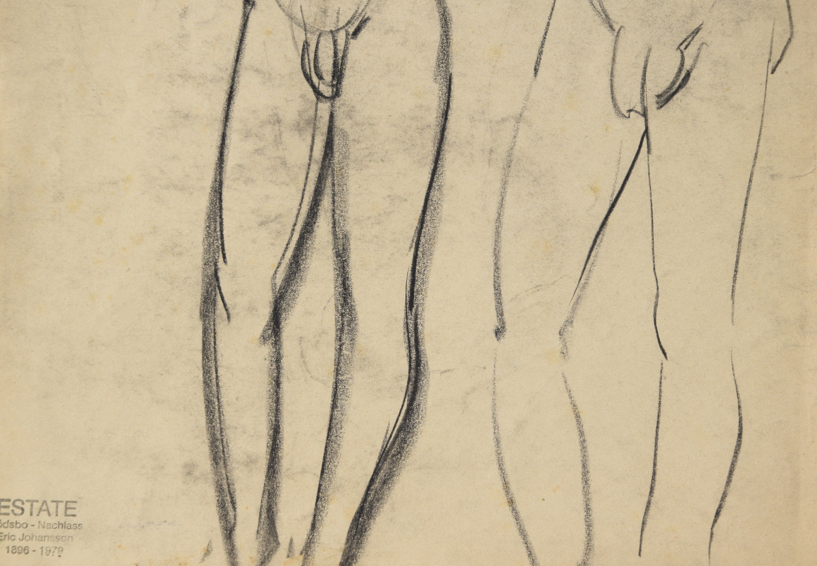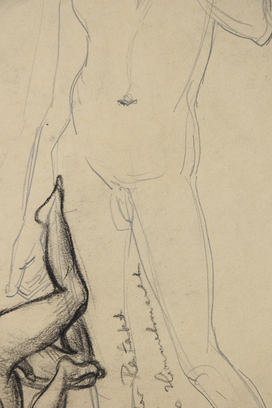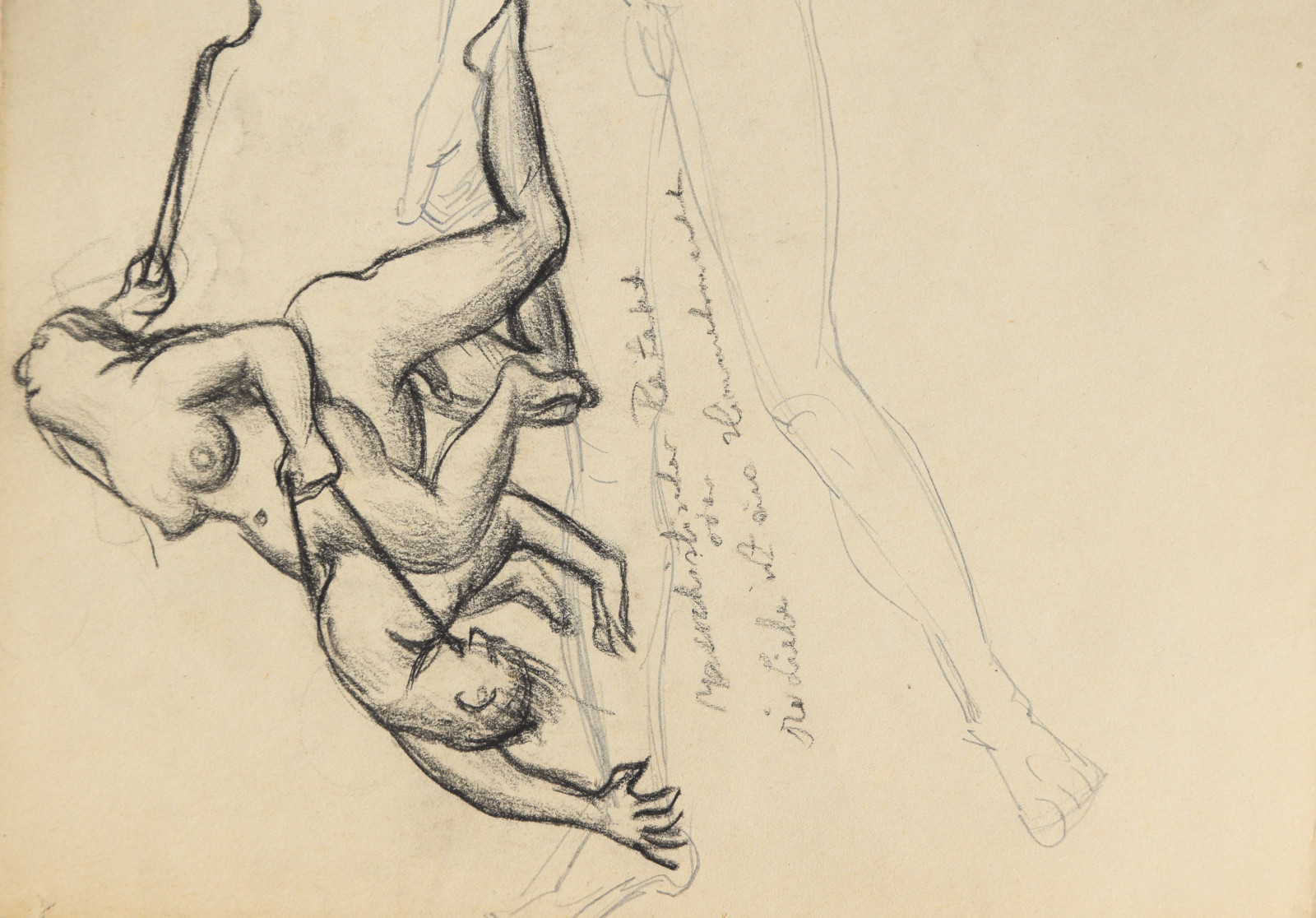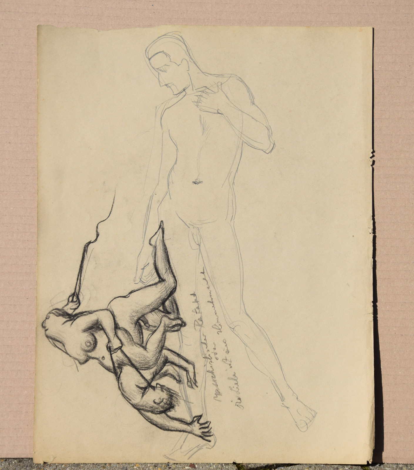 ohne Titel [recto – Studie mit zwei stehenden männlichen Akten / verso – weitere Studie eines stehenden männlichen Aktes, sowie detaillierter ausgeführte Zeichnung einer Flagellantismus-Szene, diese vom Künstler bezeichnet mit „Masochistischer Reitakt oder Die Liebe ist eine Himmelsmacht“]