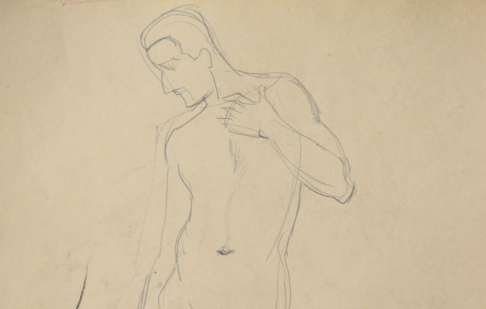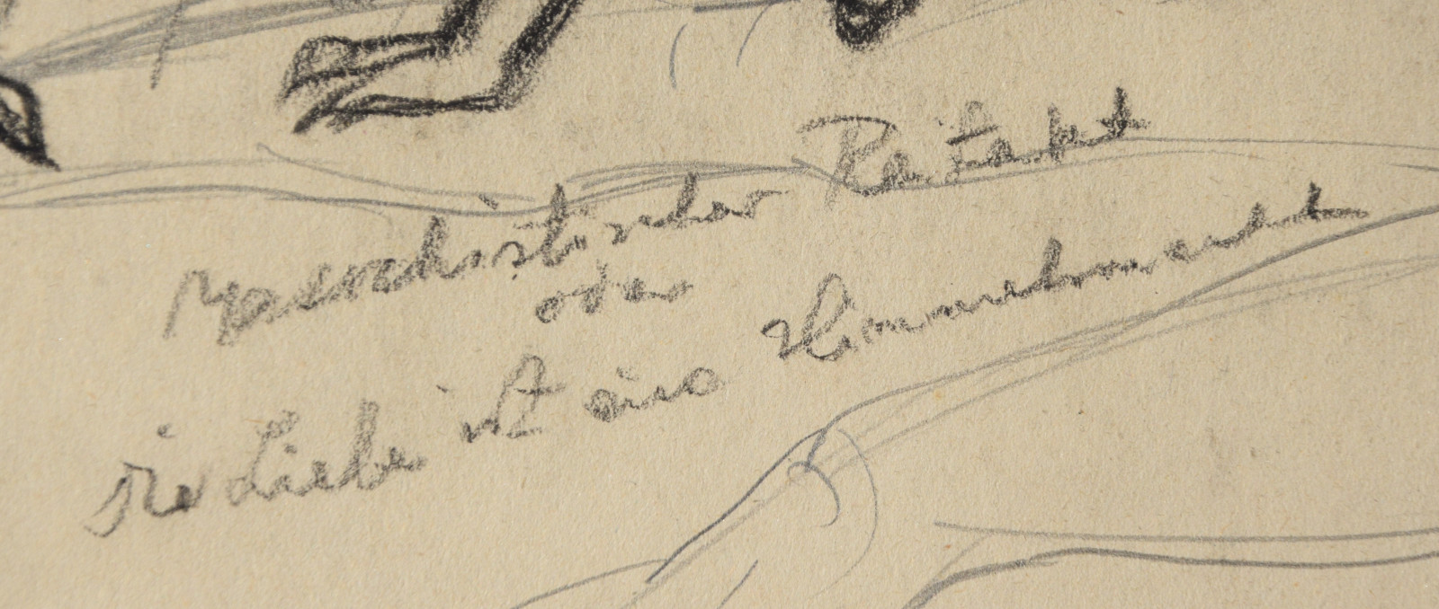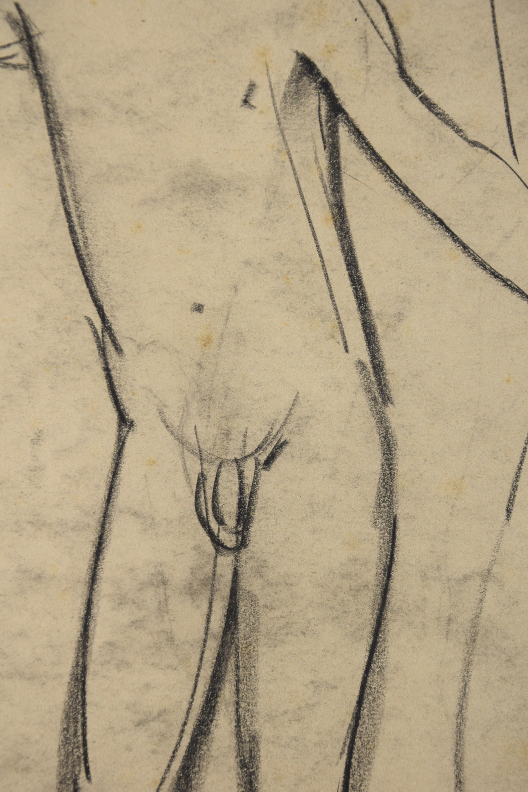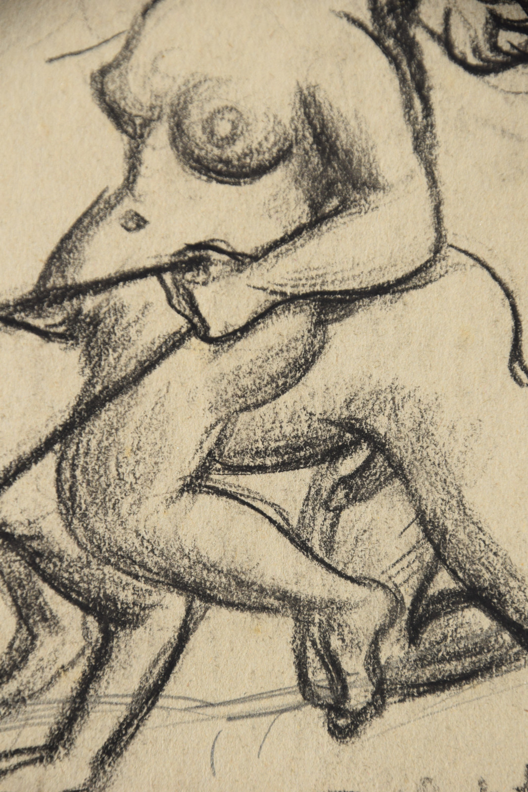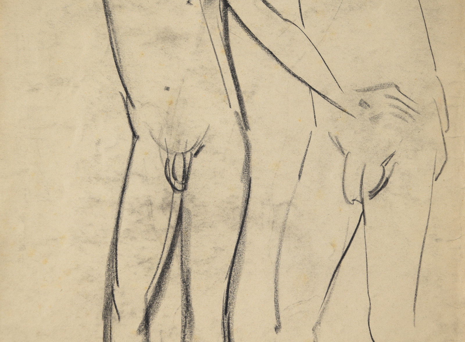 ohne Titel [recto – Studie mit zwei stehenden männlichen Akten / verso – weitere Studie eines stehenden männlichen Aktes, sowie detaillierter ausgeführte Zeichnung einer Flagellantismus-Szene, diese vom Künstler bezeichnet mit „Masochistischer Reitakt oder Die Liebe ist eine Himmelsmacht“]