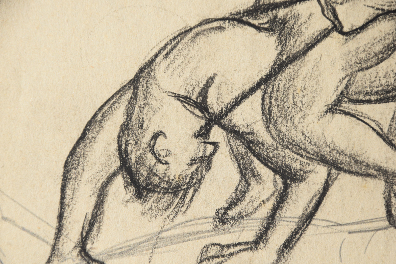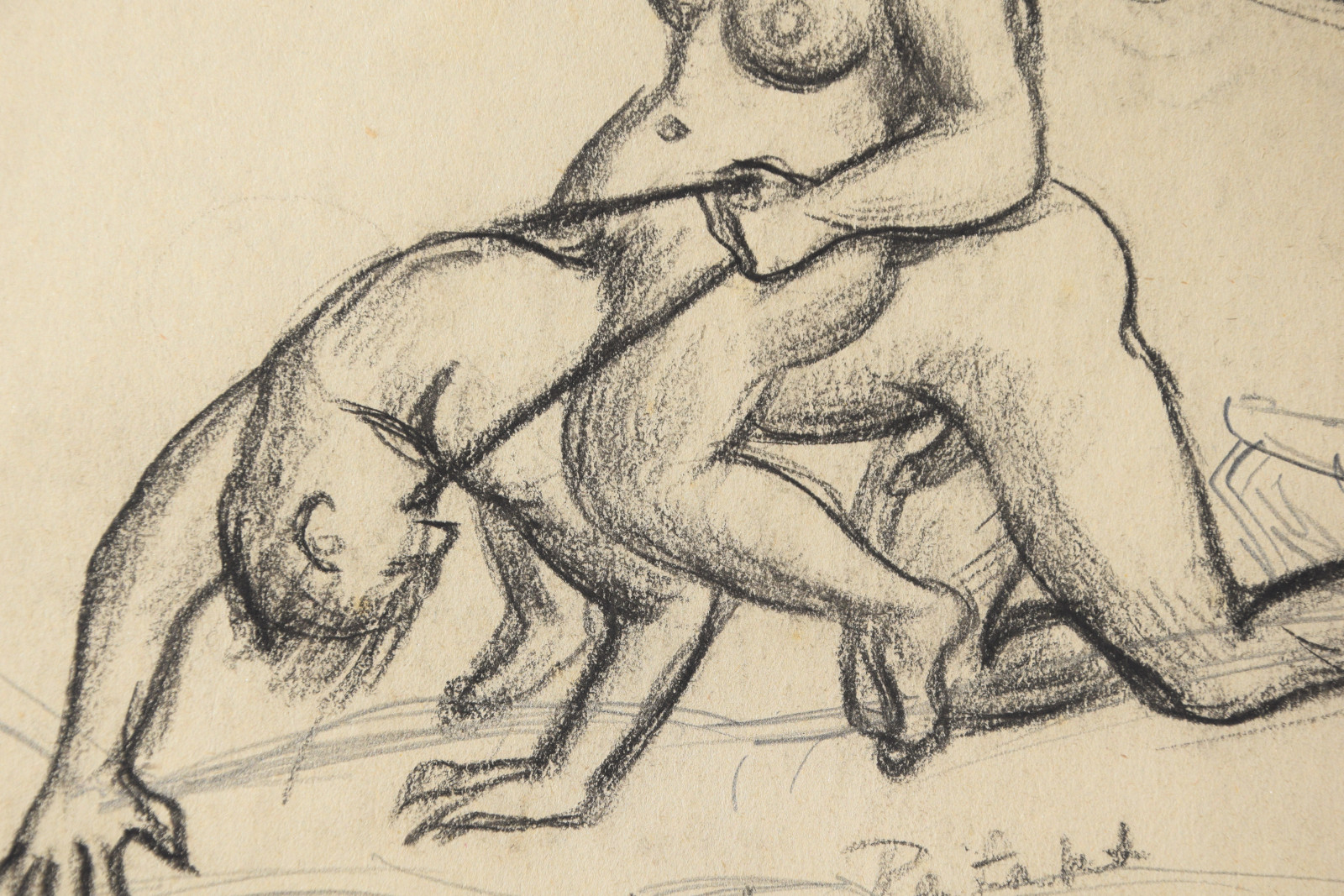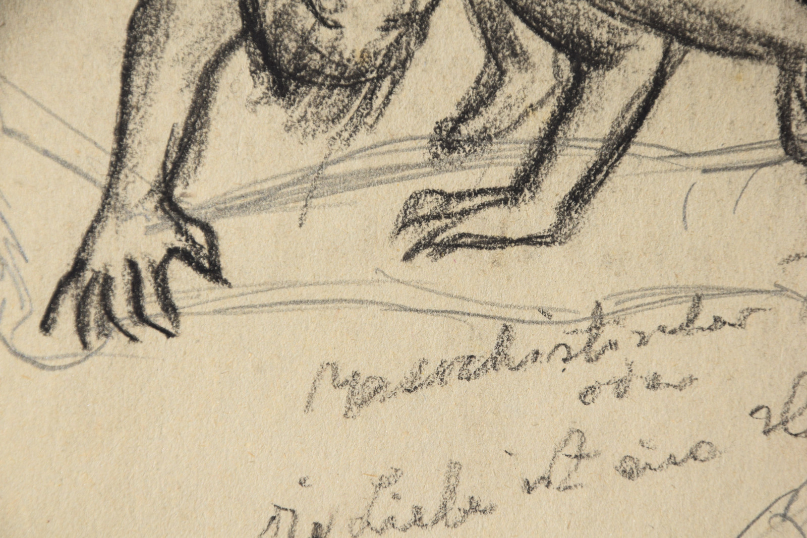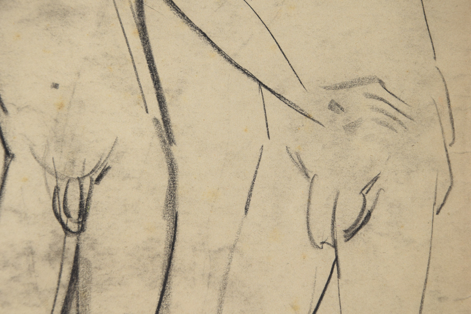 ohne Titel [recto – Studie mit zwei stehenden männlichen Akten / verso – weitere Studie eines stehenden männlichen Aktes, sowie detaillierter ausgeführte Zeichnung einer Flagellantismus-Szene, diese vom Künstler bezeichnet mit „Masochistischer Reitakt oder Die Liebe ist eine Himmelsmacht“]