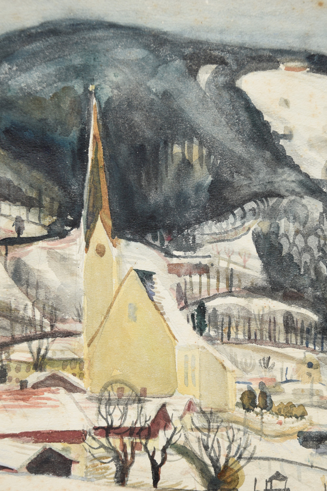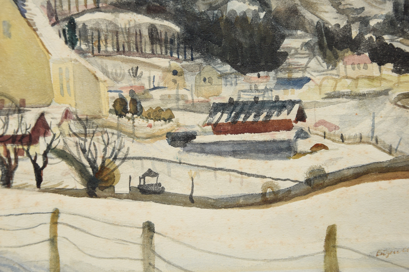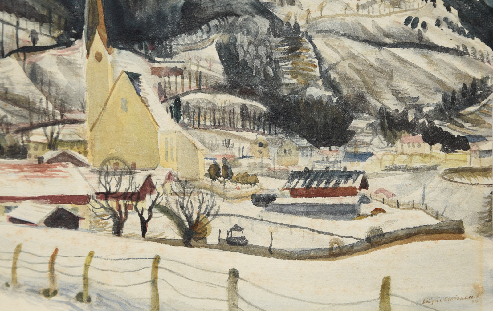 Das vorliegende Werk ist eine der ganz typischen, sehr schönen Winterlandschaften des Künstlers und kann womöglich in die heimatliche Pfalz lokalisiert werden. Im Gegensatz zu den meisten anderen Werken, hat der Künstler dieses Blatt zudem datiert (1934).