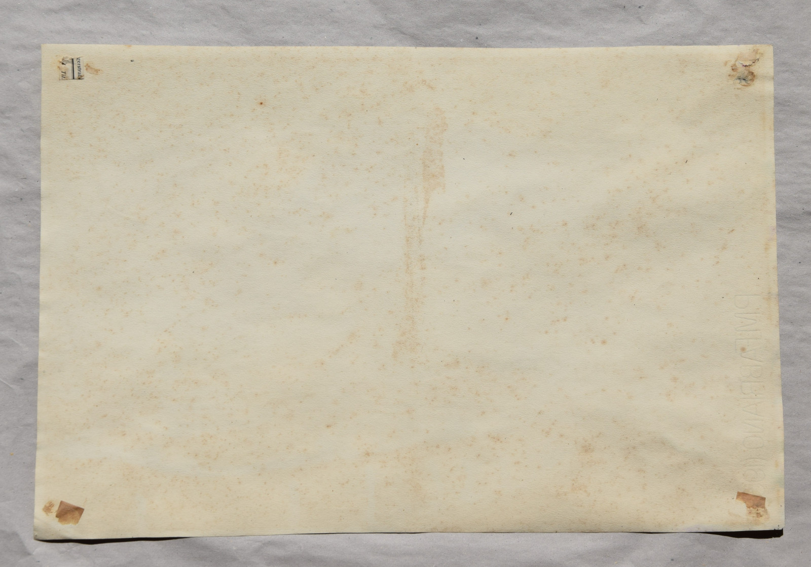 recto & verso durchgehend leicht stockfleckig; insgesamt etwas nachgedunkelt; Ecken schwach bestoßen; Ecke oben links mit kleinem Einriss; verso fleckig; verso in den vier Ecken Reste von früherer Befestigung (Klebestreifen)