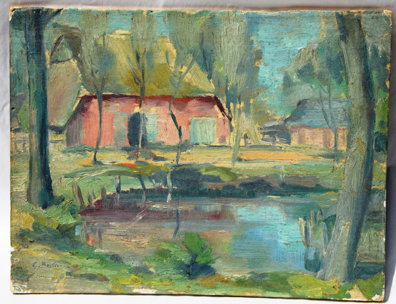 ohne Titel [Blick auf ein norddeutsches Gehöft an einem See, verso: Teile (oberer Kopf) eines (zugeschnittenen) Porträts]