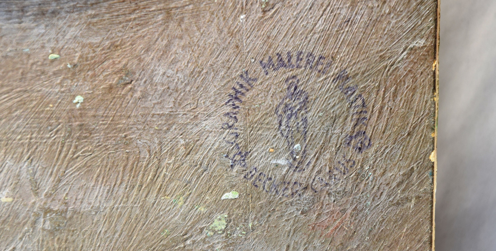 durchgehend fleckig und nachgedunkelt; Ecken und Kanten bestoßen, sowie mit leicten Verlusten der Farbschicht; Ränder leicht berieben; verso fleckig und beschmutzt; verso links in Blei bezeichnet „Auswahl 25.5.88“