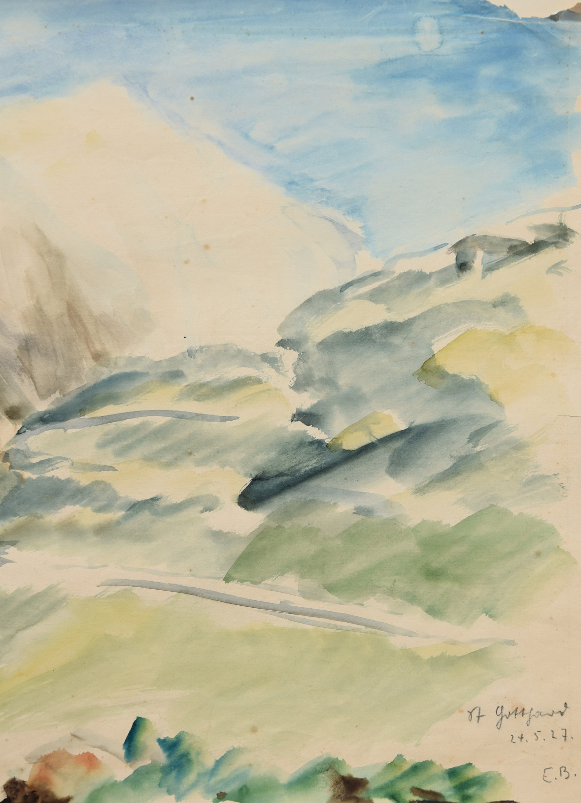 Becker-Carus zeigt hier in schnellen, breiten, expressiven Pinselstrichen einen Blick auf das Gotthardmassiv.