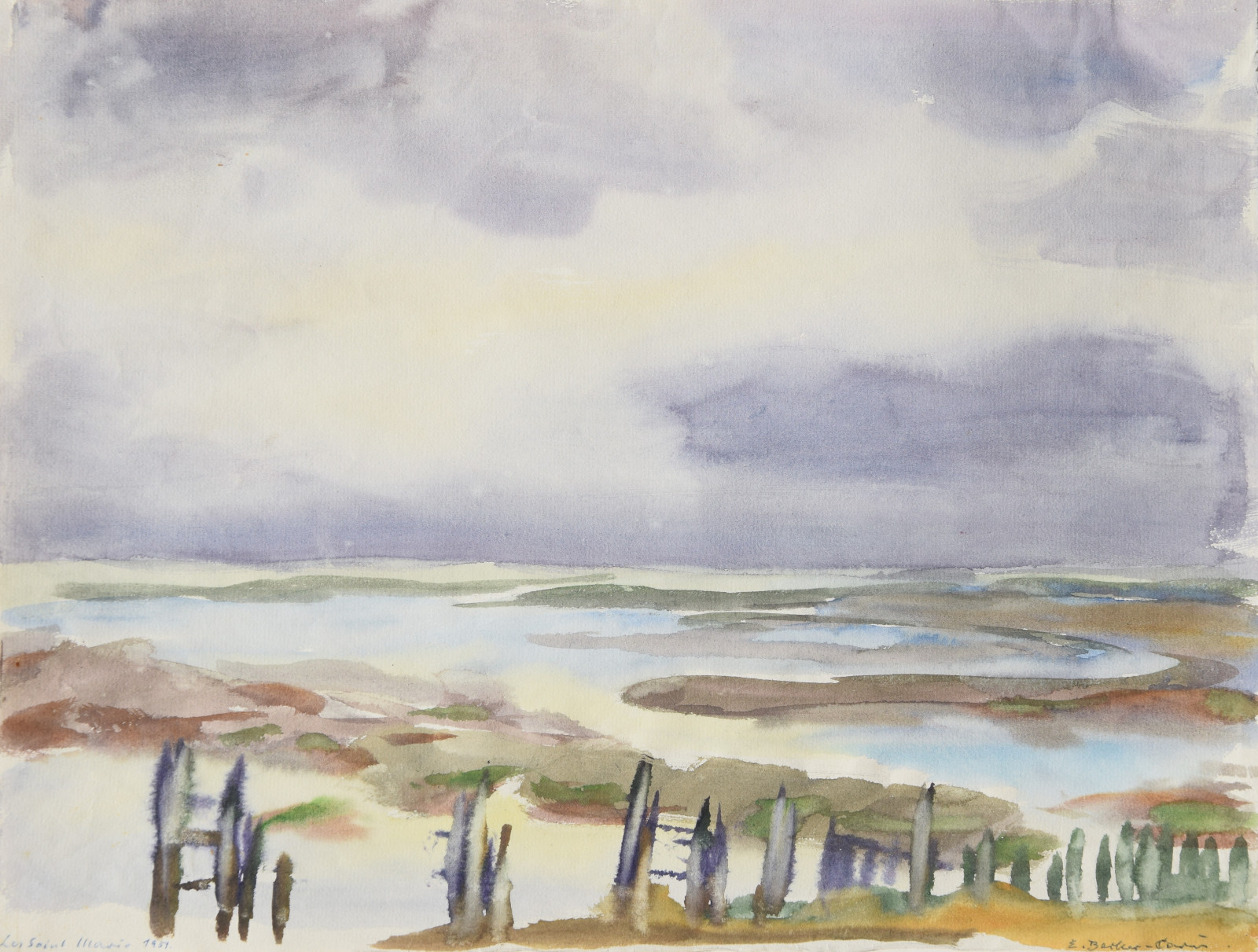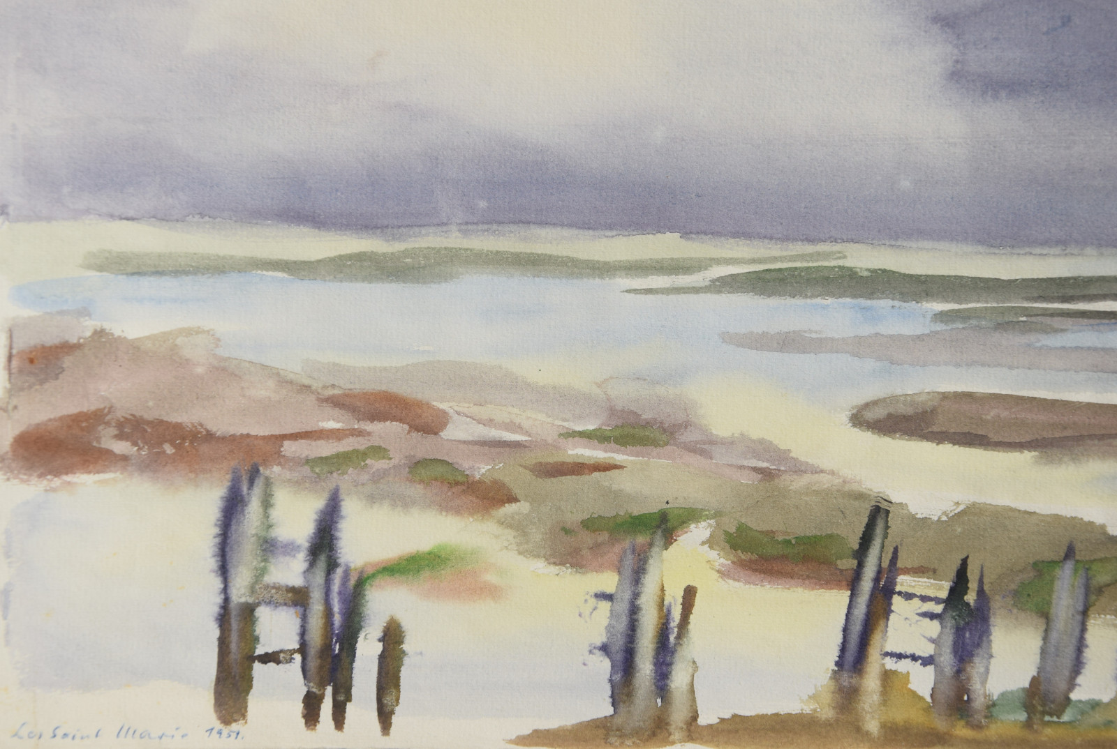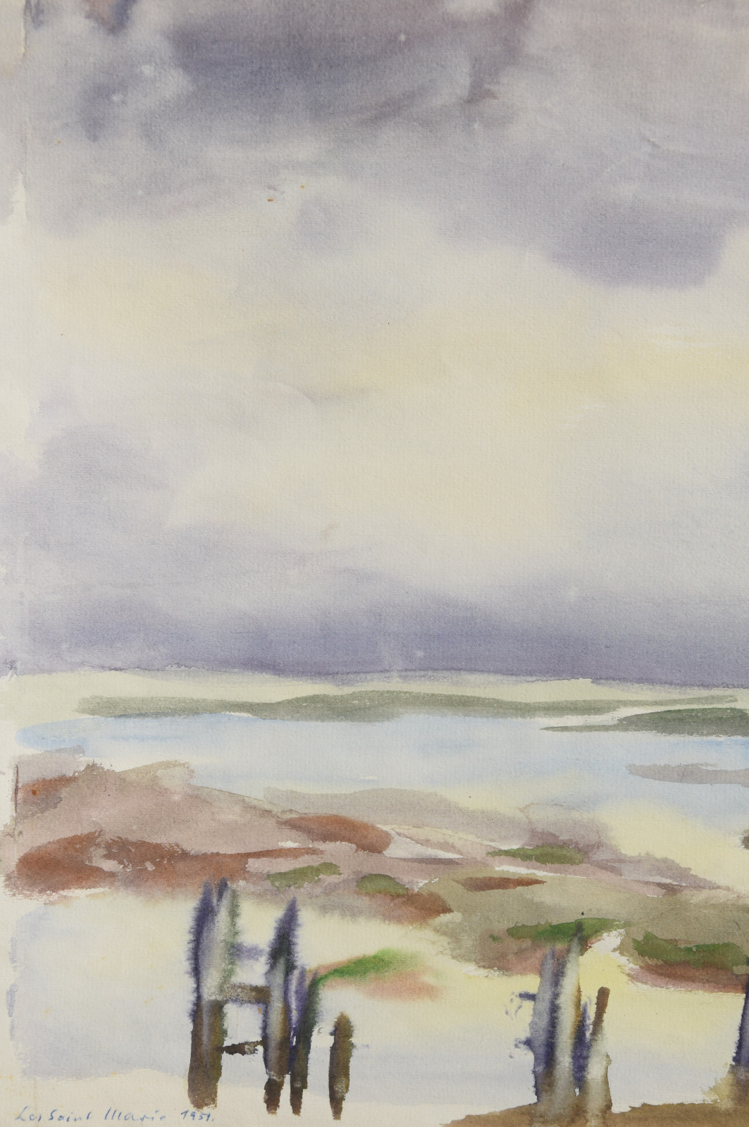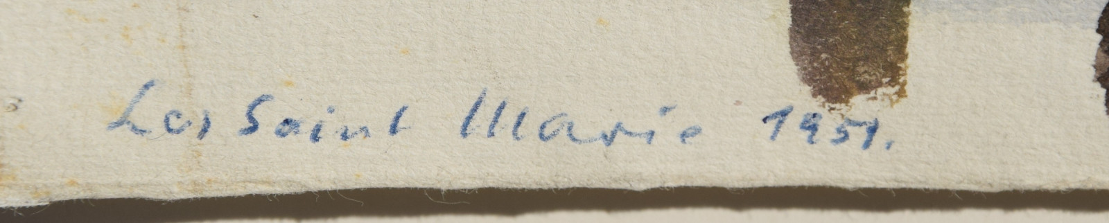 „Les Saint[sic] Marie“ [so unten links und unten rechts betitelt, Ansicht des Meeres bei (Les) Saintes-Maries-de-la-Mer in der Region Provence-Alpes-Côte d’Azur]