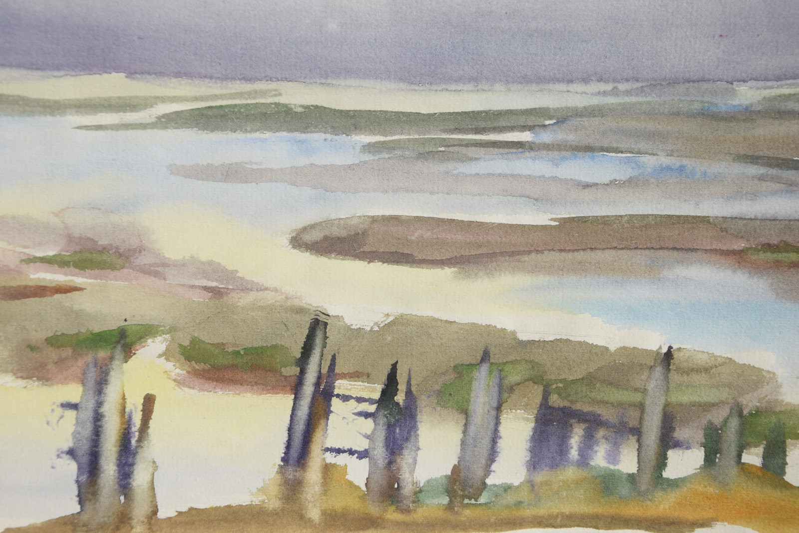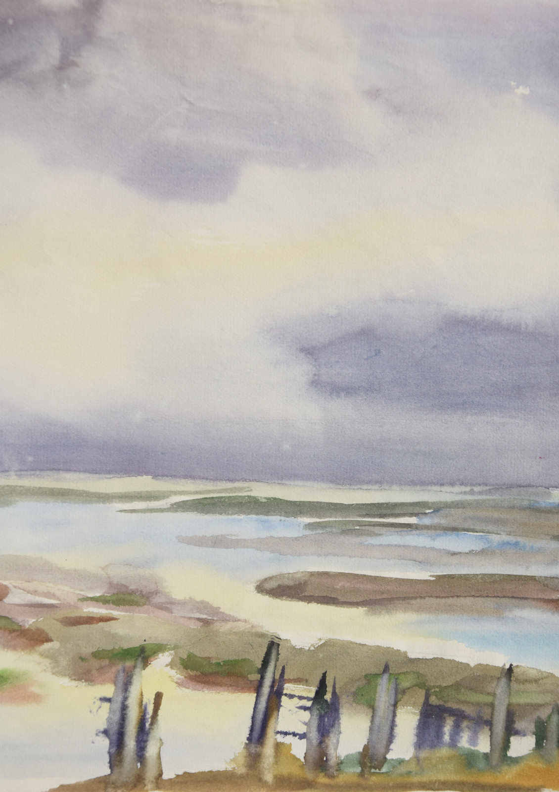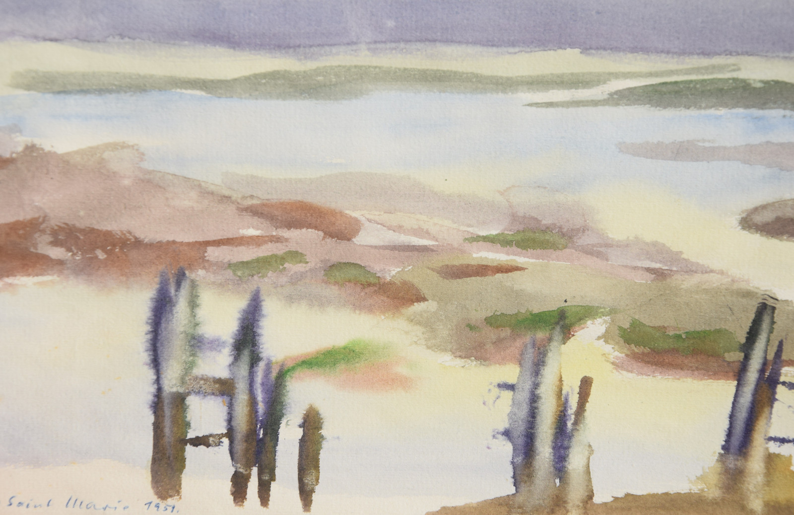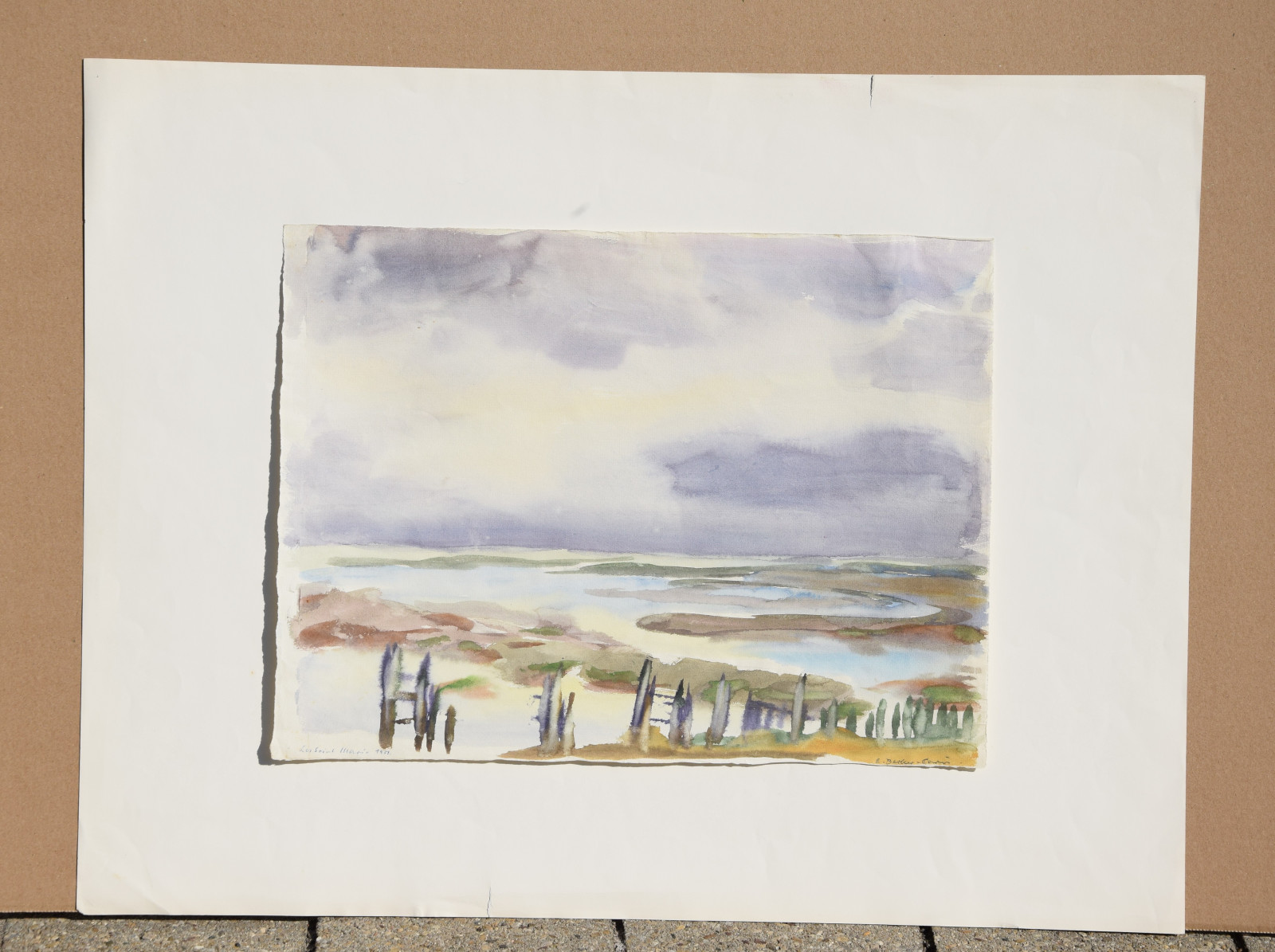 „Les Saint[sic] Marie“ [so unten links und unten rechts betitelt, Ansicht des Meeres bei (Les) Saintes-Maries-de-la-Mer in der Region Provence-Alpes-Côte d’Azur]