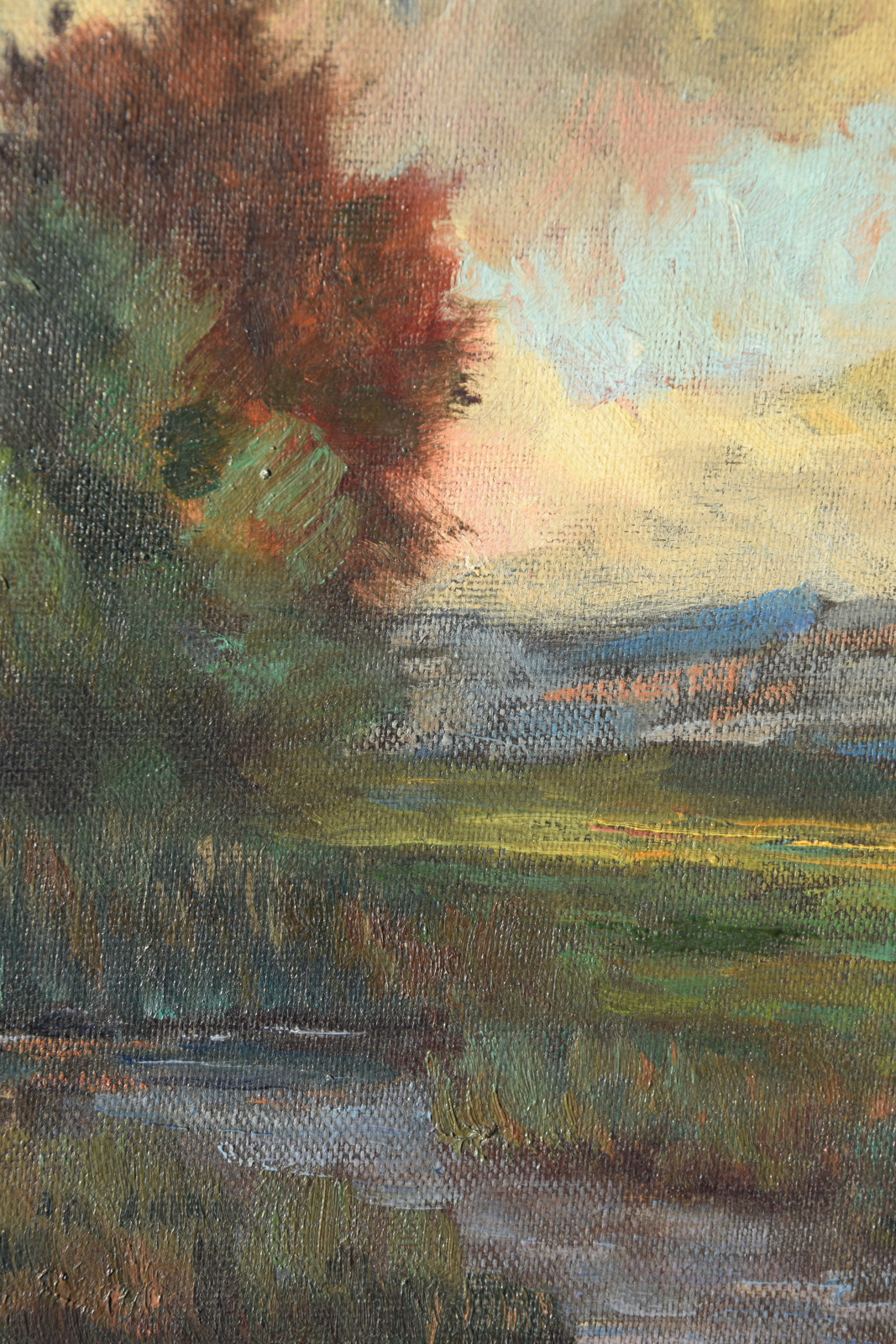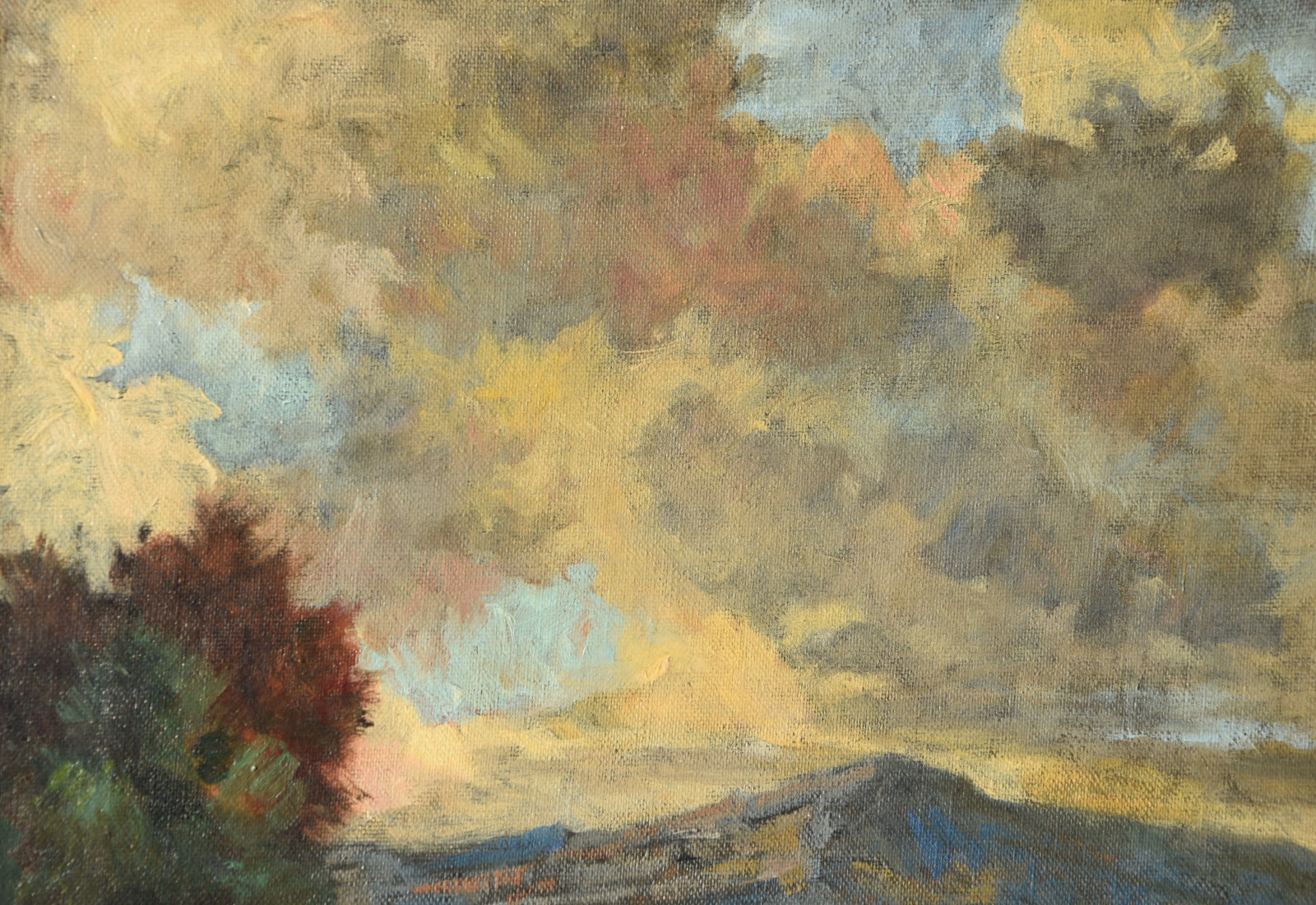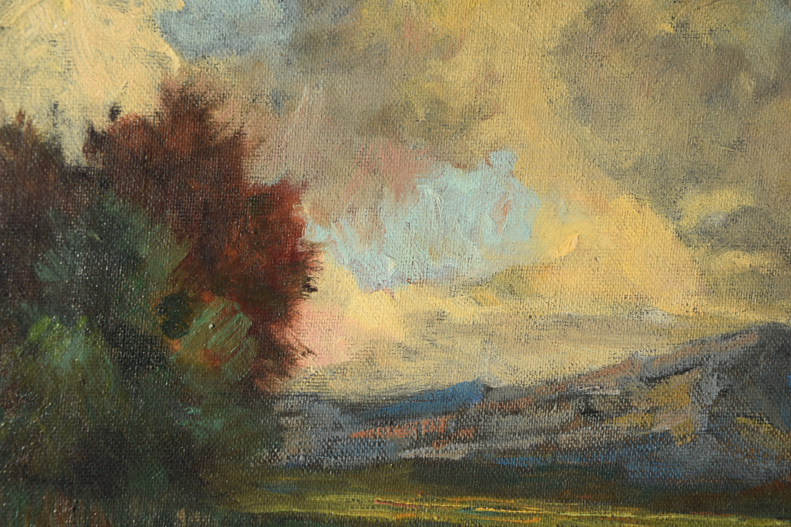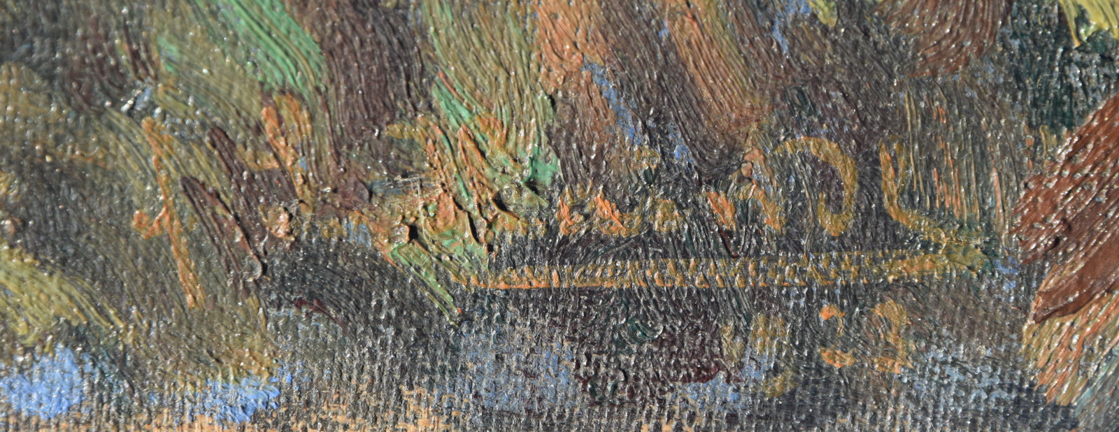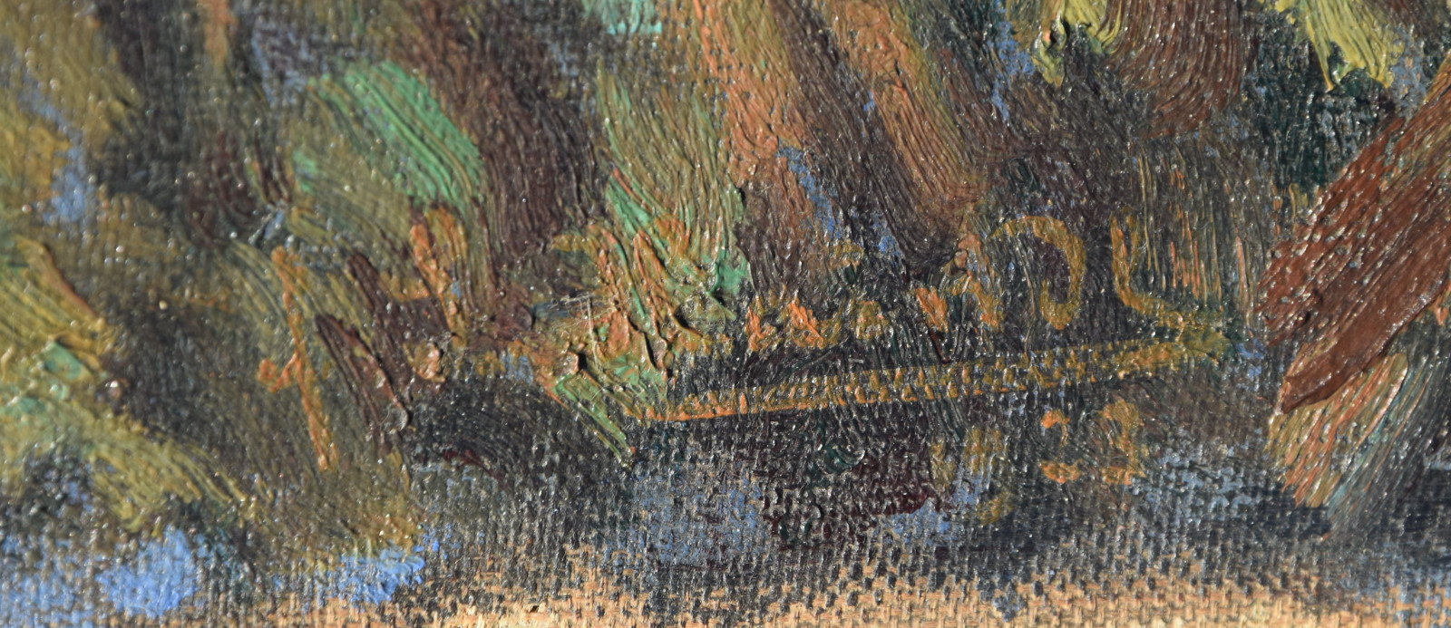 insgesamt etwas nachgedunkelt; in den Randbereichen leichte Druckstellen durch dahinter liegenden Keilrahmen; Leinwandränder sehr leicht berieben; Leinwand am unteren Rand links (außerhalb des Bildbereichs) mit Einriss