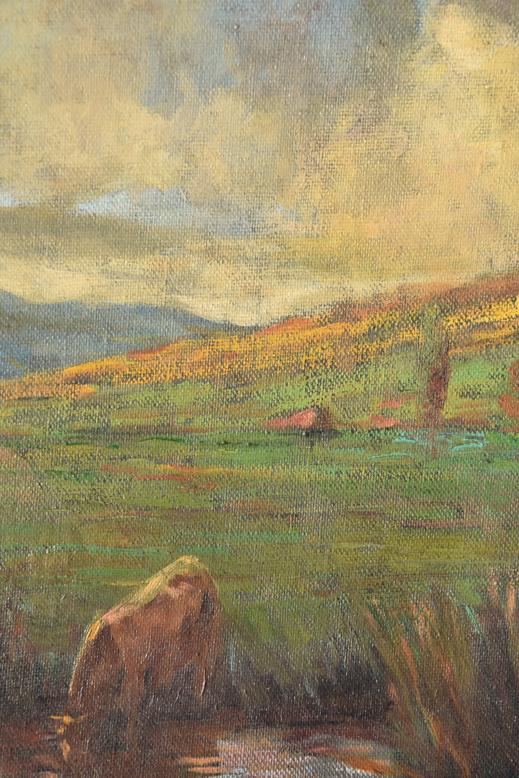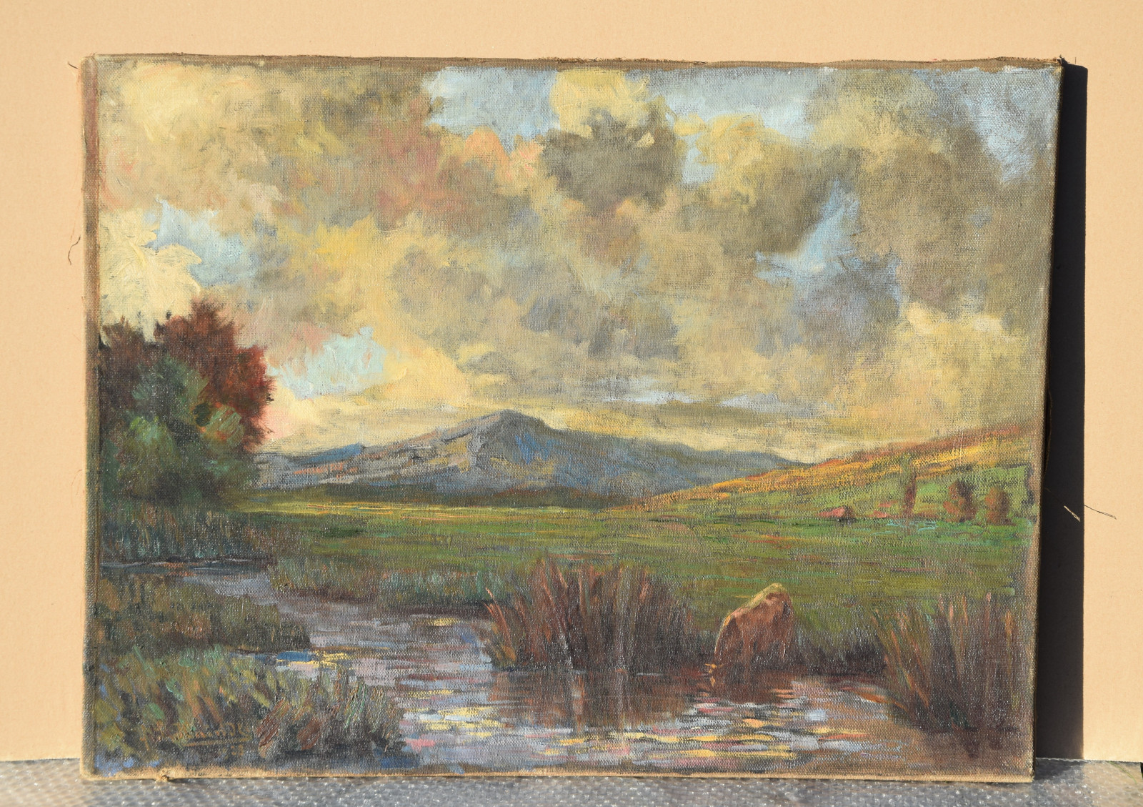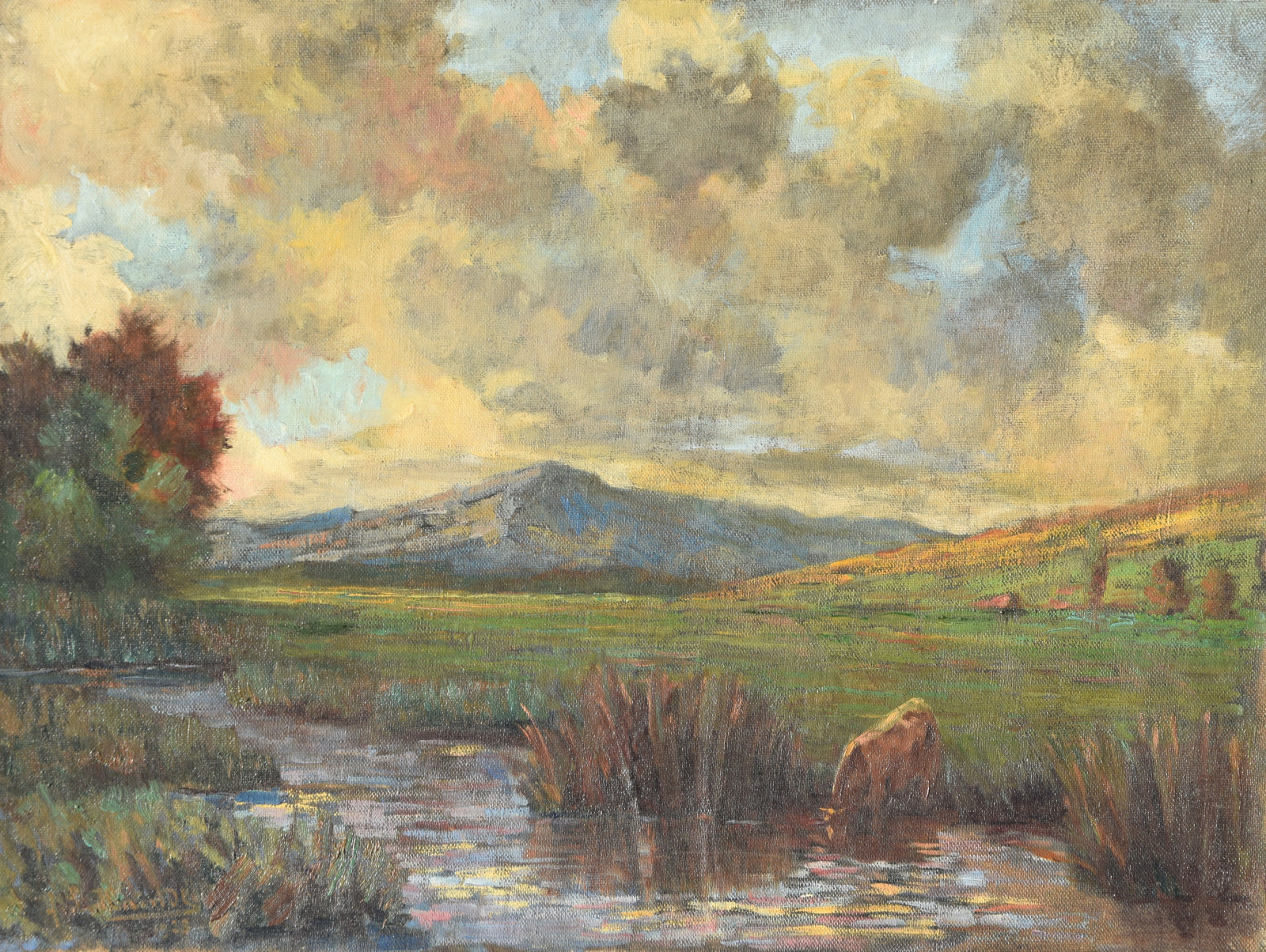 voralpine Flusslandschaft mit trinkender Kuh unter stark bewölktem Himmel (1923)