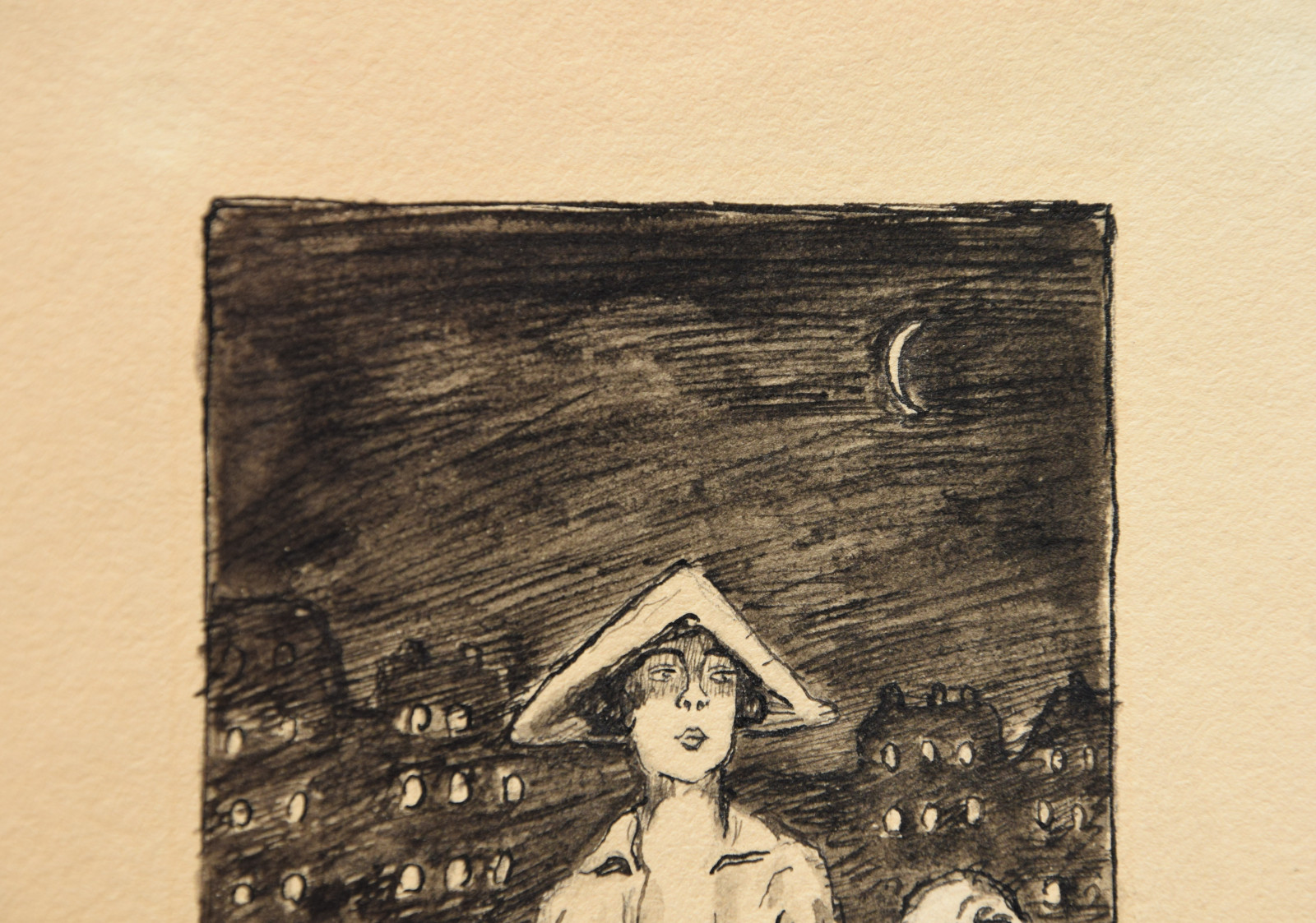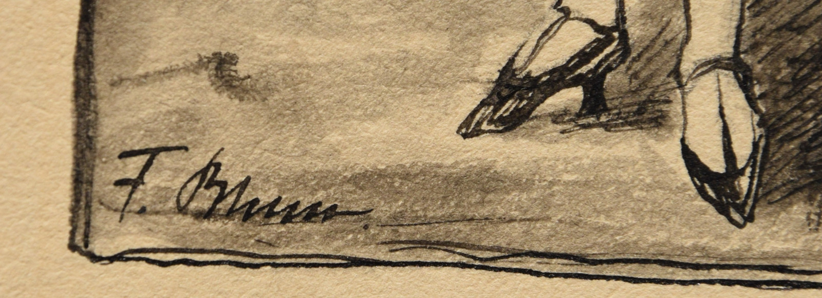 Tuschfeder (teilweise grau laviert) auf leichtem Karton, am oberen Rand befestigt auf Karton