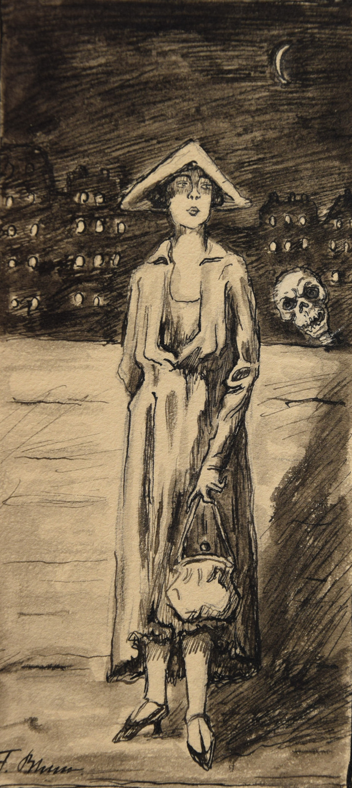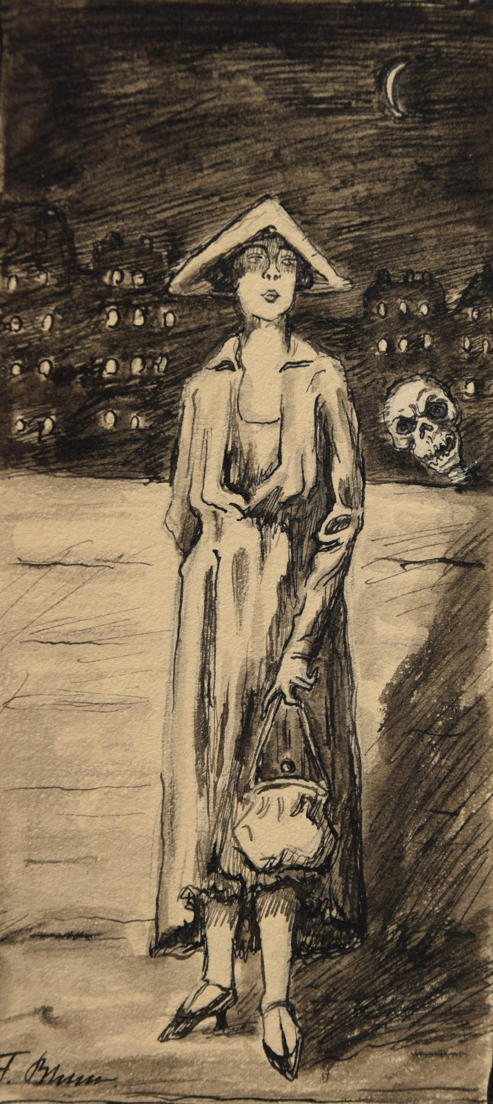 Blum zeigt eine nächtliche Großstadtszene. Im Hintergrund hell erleuchtete hohe Stadthäuser, der dunkle Nachthimmel und ein schmaler Sichelmond. Im Vordergrund eine junge Dame in Abendgarderobe und Handtasche, die vor einer Mauer (vielleicht eine Brücke?) steht. Sie wird von einem fahlen Licht bestrahlt und blickt mit einem ernsten, vielleicht sogar eher: hochmütigen, Gesichtsausdruck nach rechts aus dem Bild. Was sie nun nicht bemerkt, geschieht hinter ihr und wirkt wie ein surreal gruseliges Einsprengsel. – Denn hinter der Mauer rechts reckt sich ein lachender Totenkopf mit großen hohlen Augen und offenem Mund empor. Vielleicht ein Vorzeichen, ein Menetekel für das bevorstehende infauste Schicksal der Dame.