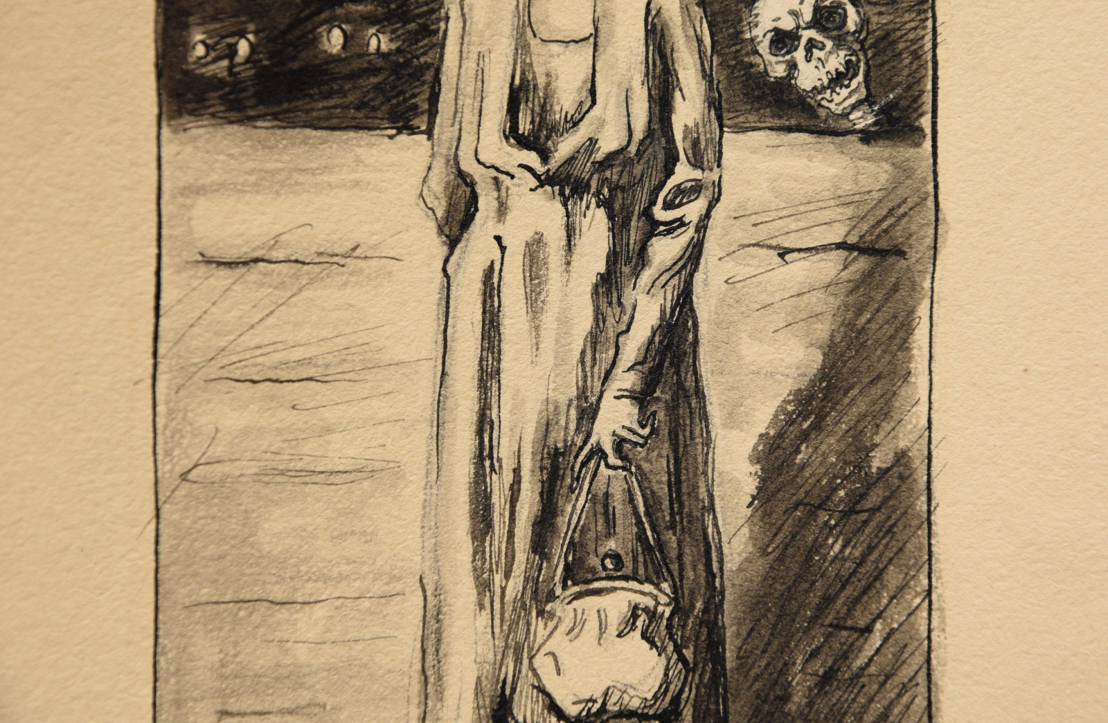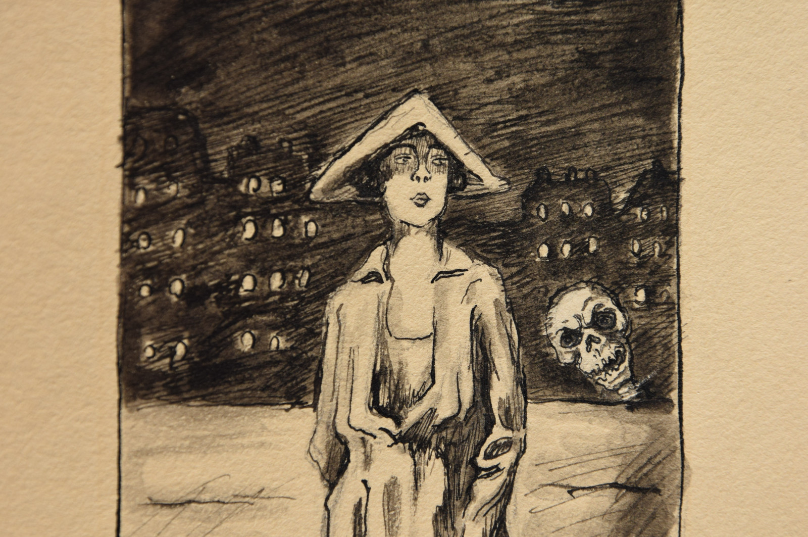 ohne Titel [nächtliche Szenerie mit junger Frau und lachendem Tod]
