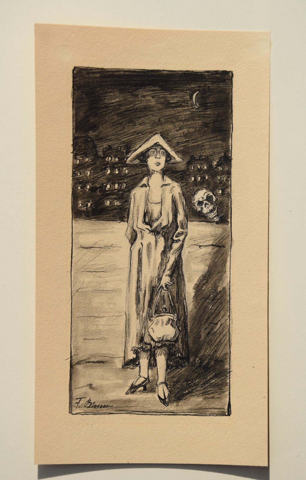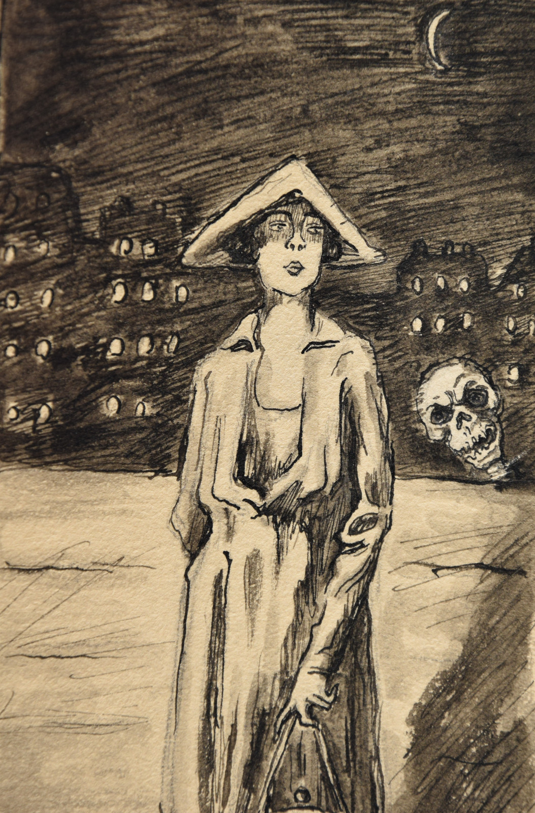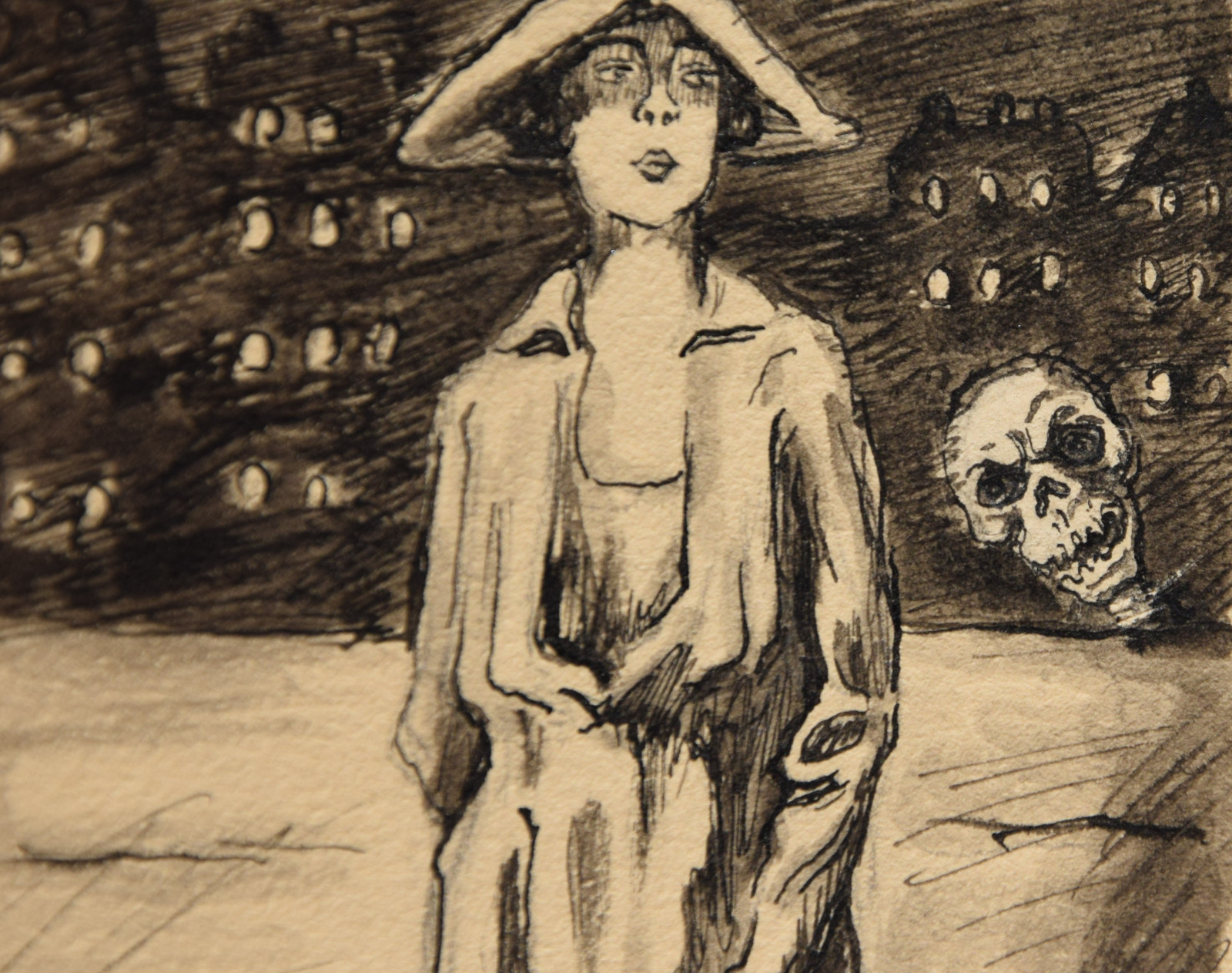 nächtliche Szenerie mit junger Frau und lachendem Tod (wohl um 1930-40)