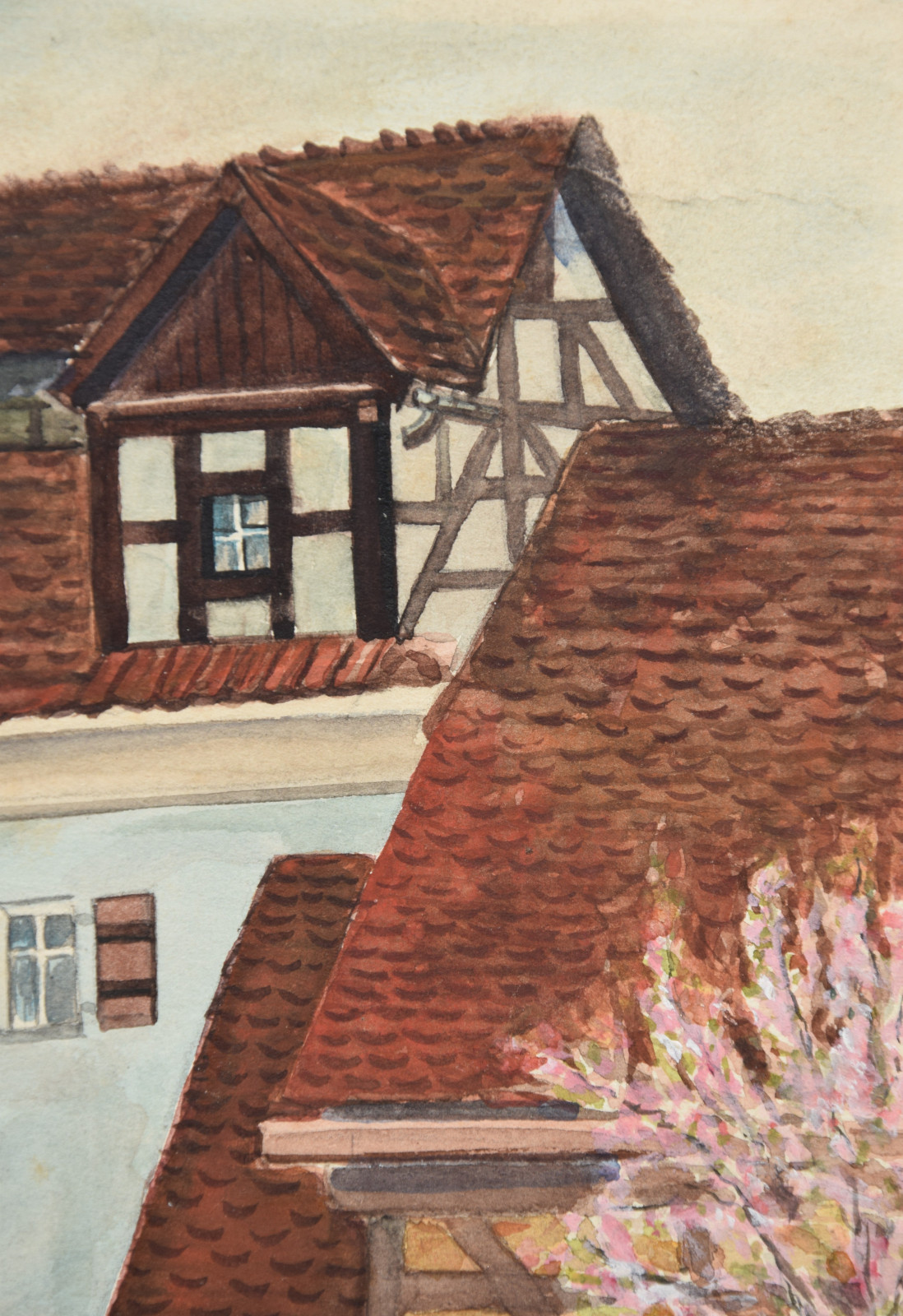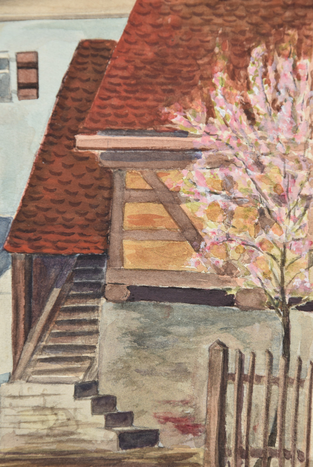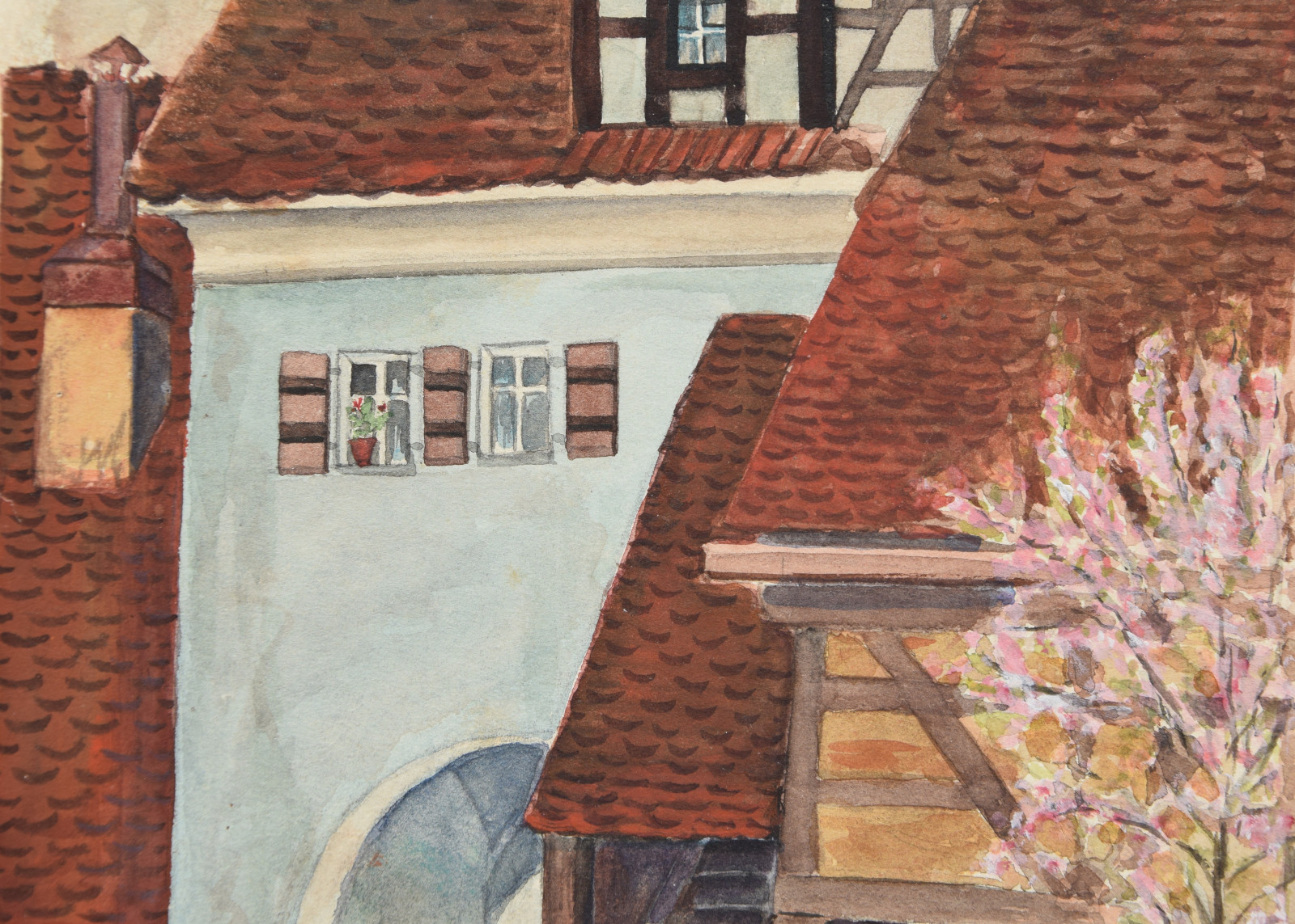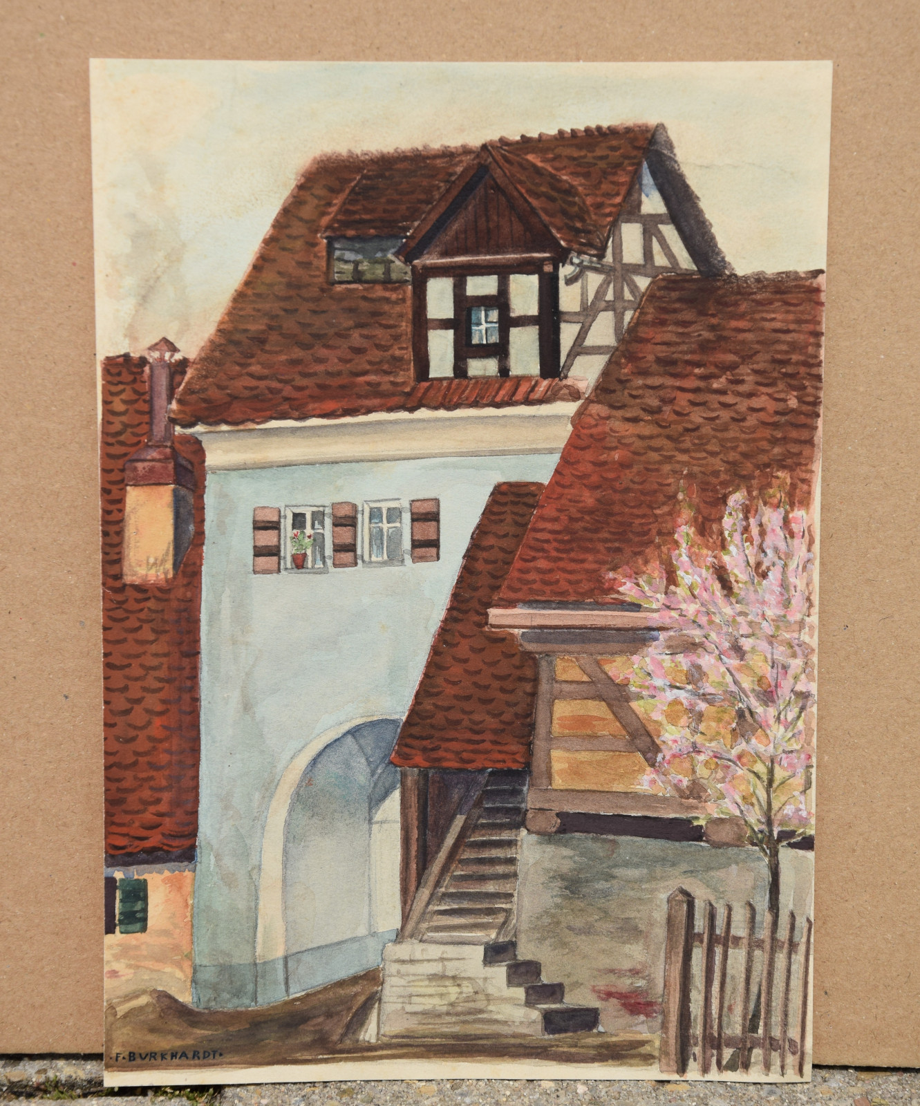 Fritz Burkhardt wuchs in Hersbruck auf und besuchte dort das Gymnasium. Bereits in dieser Jugendzeit entstanden Zeichnungen und Aquarelle mit zumeist dörflichen Motiven aus Hersbruck und der dortigen Umgebung. Dieses vorliegende Aquarell ist in diese frühe Schaffensphase einzuordnen. Burkhardt zeigt hier einen Blick auf das Osttor der Ortsbefestigung von Engelthal. Engelthal liegt etwa 10km südlich von Hersbruck im Nürnberger Land und der jugendliche Künstler wird diese Ansicht wohl während eines dortigen Besuchs als Motiv ausgewählt haben.