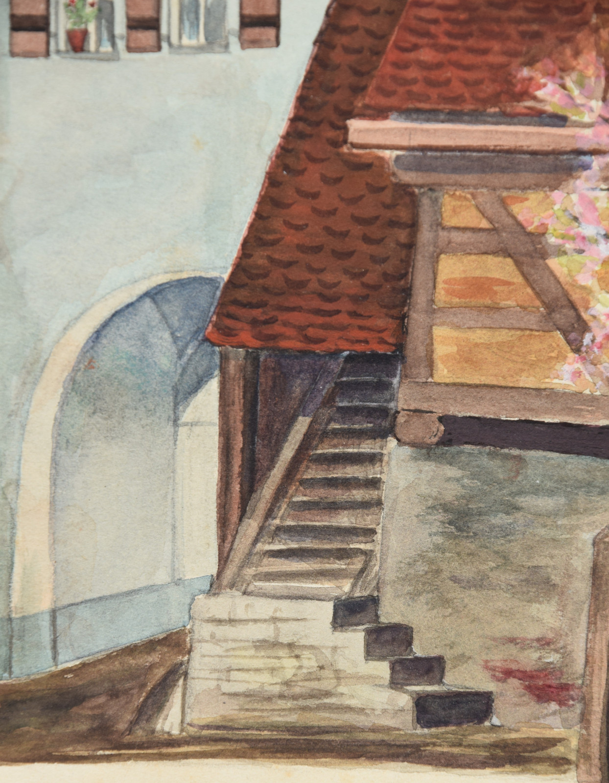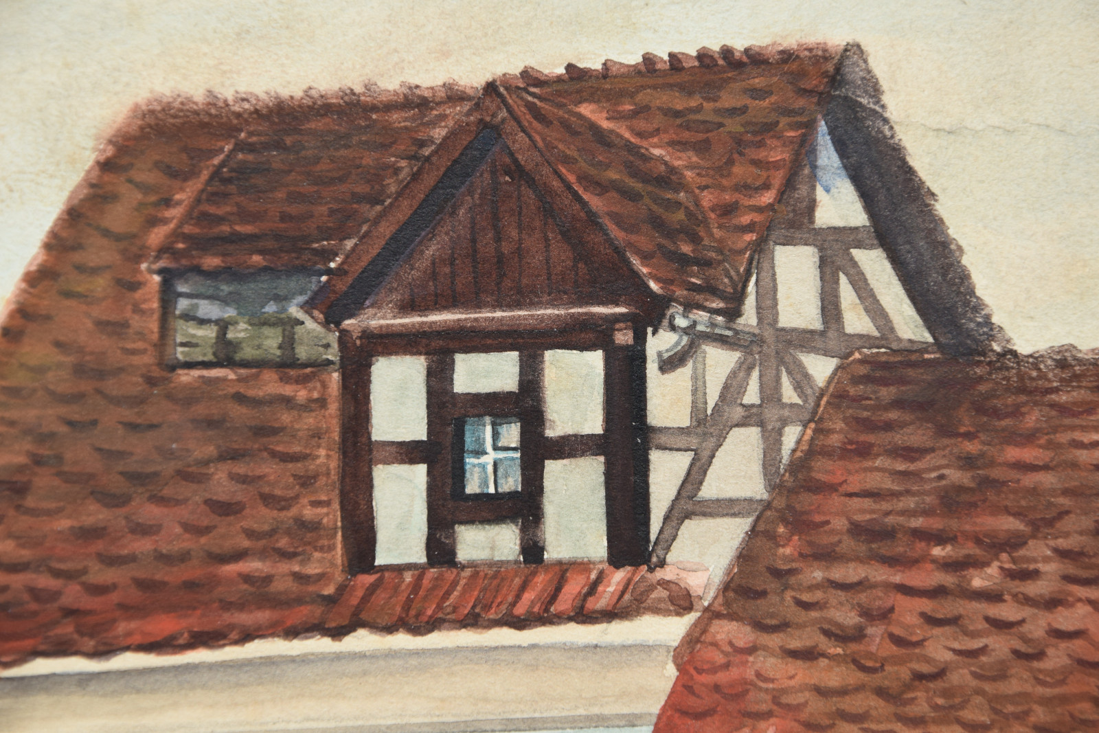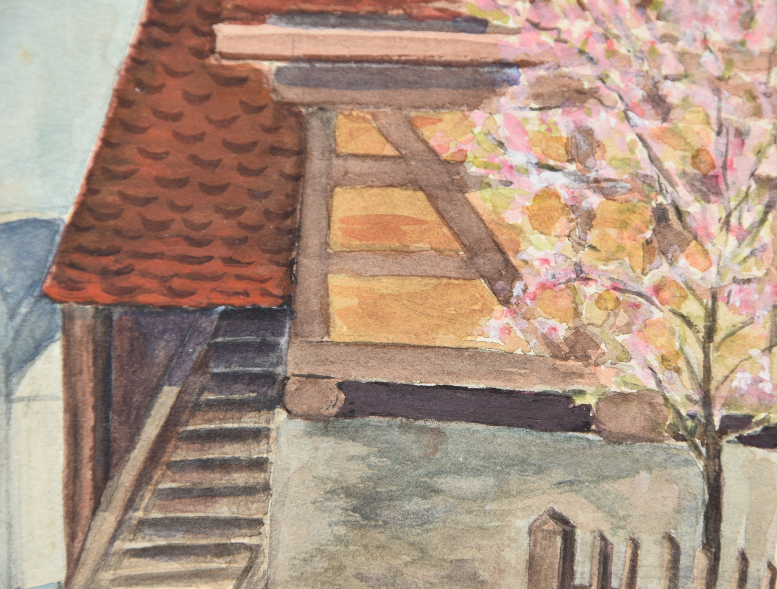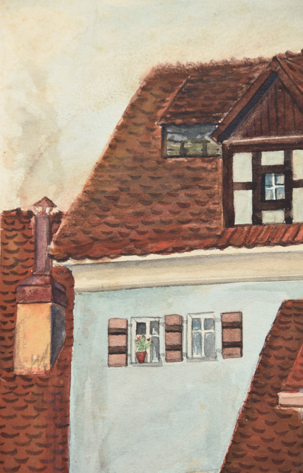 Fritz Burkhardt wuchs in Hersbruck auf und besuchte dort das Gymnasium. Bereits in dieser Jugendzeit entstanden Zeichnungen und Aquarelle mit zumeist dörflichen Motiven aus Hersbruck und der dortigen Umgebung. Dieses vorliegende Aquarell ist in diese frühe Schaffensphase einzuordnen. Burkhardt zeigt hier einen Blick auf das Osttor der Ortsbefestigung von Engelthal. Engelthal liegt etwa 10km südlich von Hersbruck im Nürnberger Land und der jugendliche Künstler wird diese Ansicht wohl während eines dortigen Besuchs als Motiv ausgewählt haben.