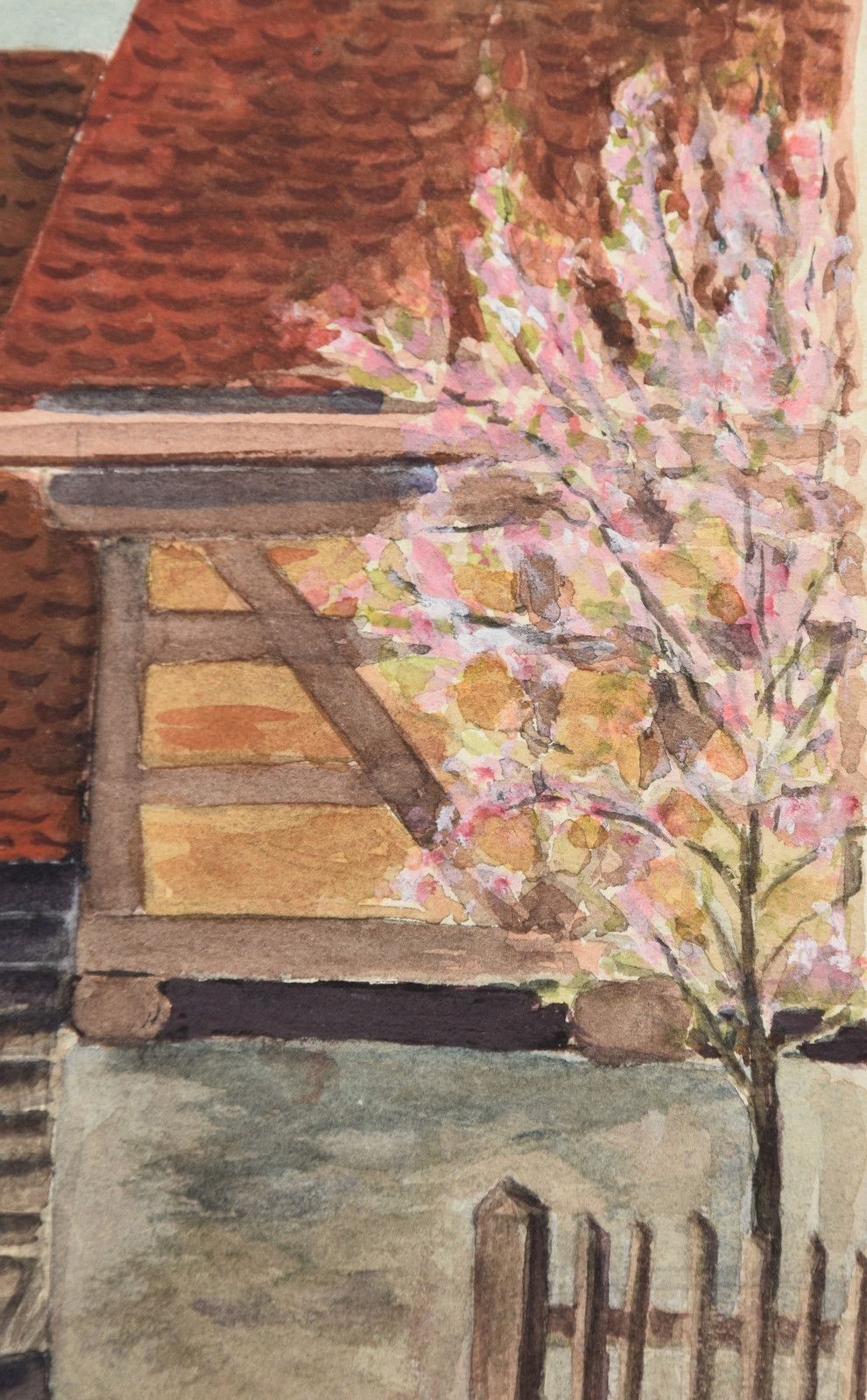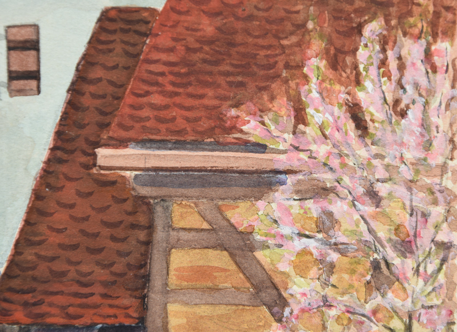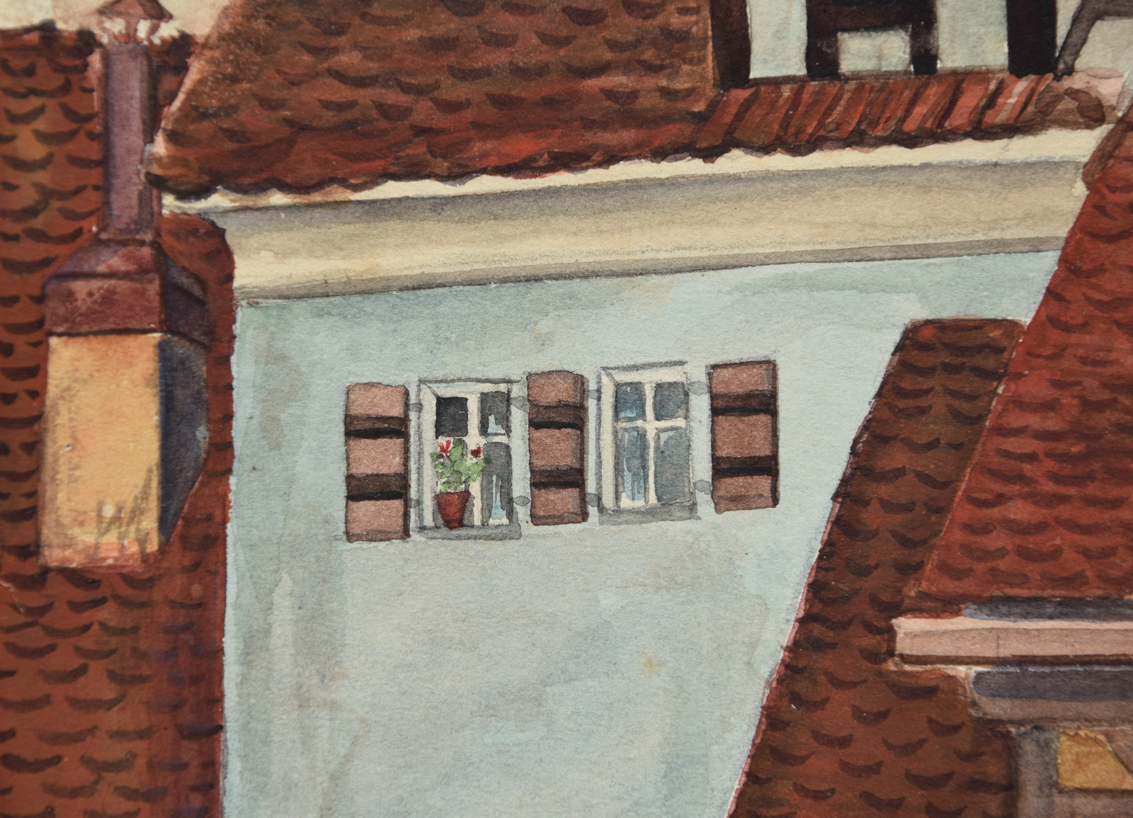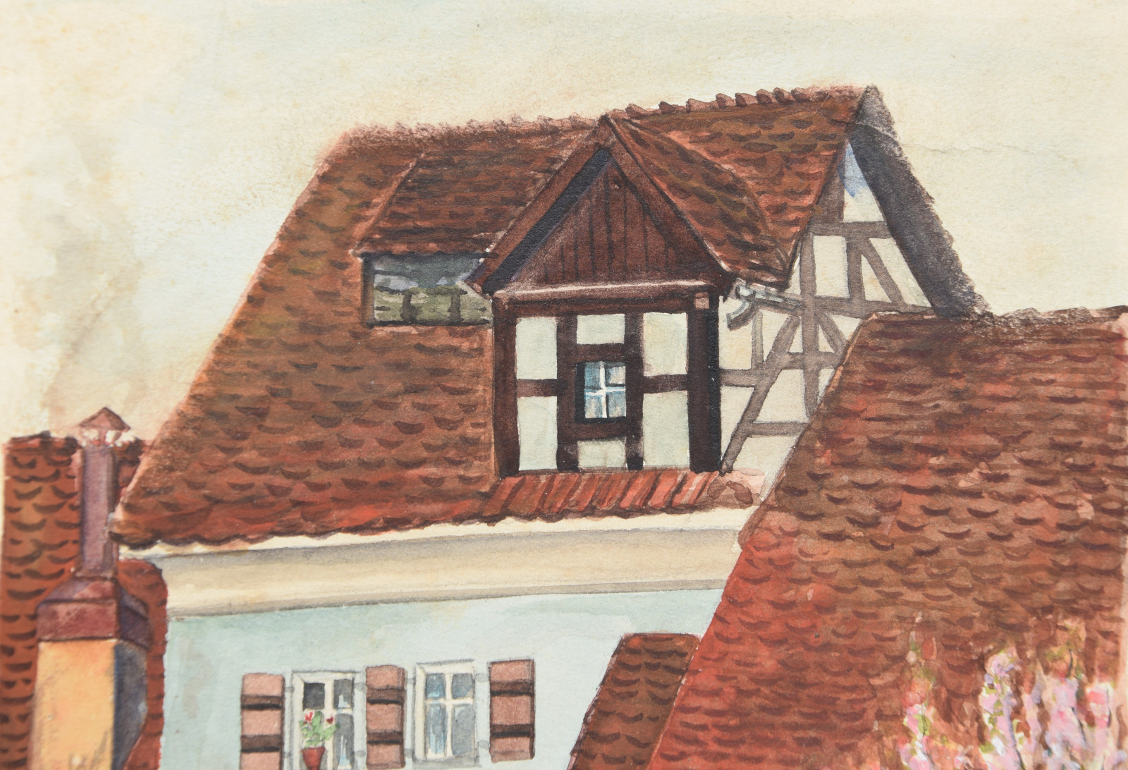 Fritz Burkhardt wuchs in Hersbruck auf und besuchte dort das Gymnasium. Bereits in dieser Jugendzeit entstanden Zeichnungen und Aquarelle mit zumeist dörflichen Motiven aus Hersbruck und der dortigen Umgebung. Dieses vorliegende Aquarell ist in diese frühe Schaffensphase einzuordnen. Burkhardt zeigt hier einen Blick auf das Osttor der Ortsbefestigung von Engelthal. Engelthal liegt etwa 10km südlich von Hersbruck im Nürnberger Land und der jugendliche Künstler wird diese Ansicht wohl während eines dortigen Besuchs als Motiv ausgewählt haben.