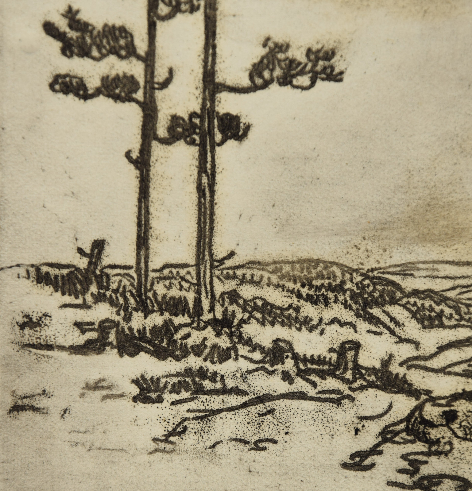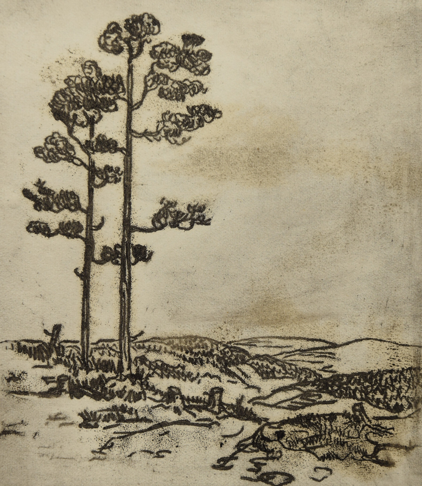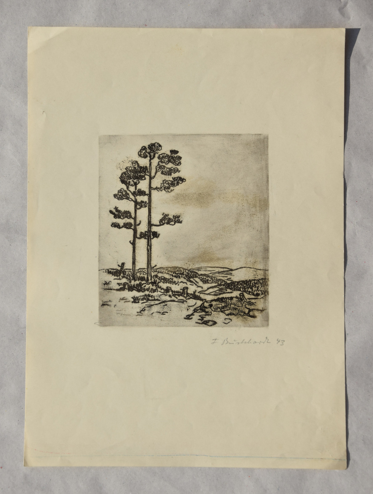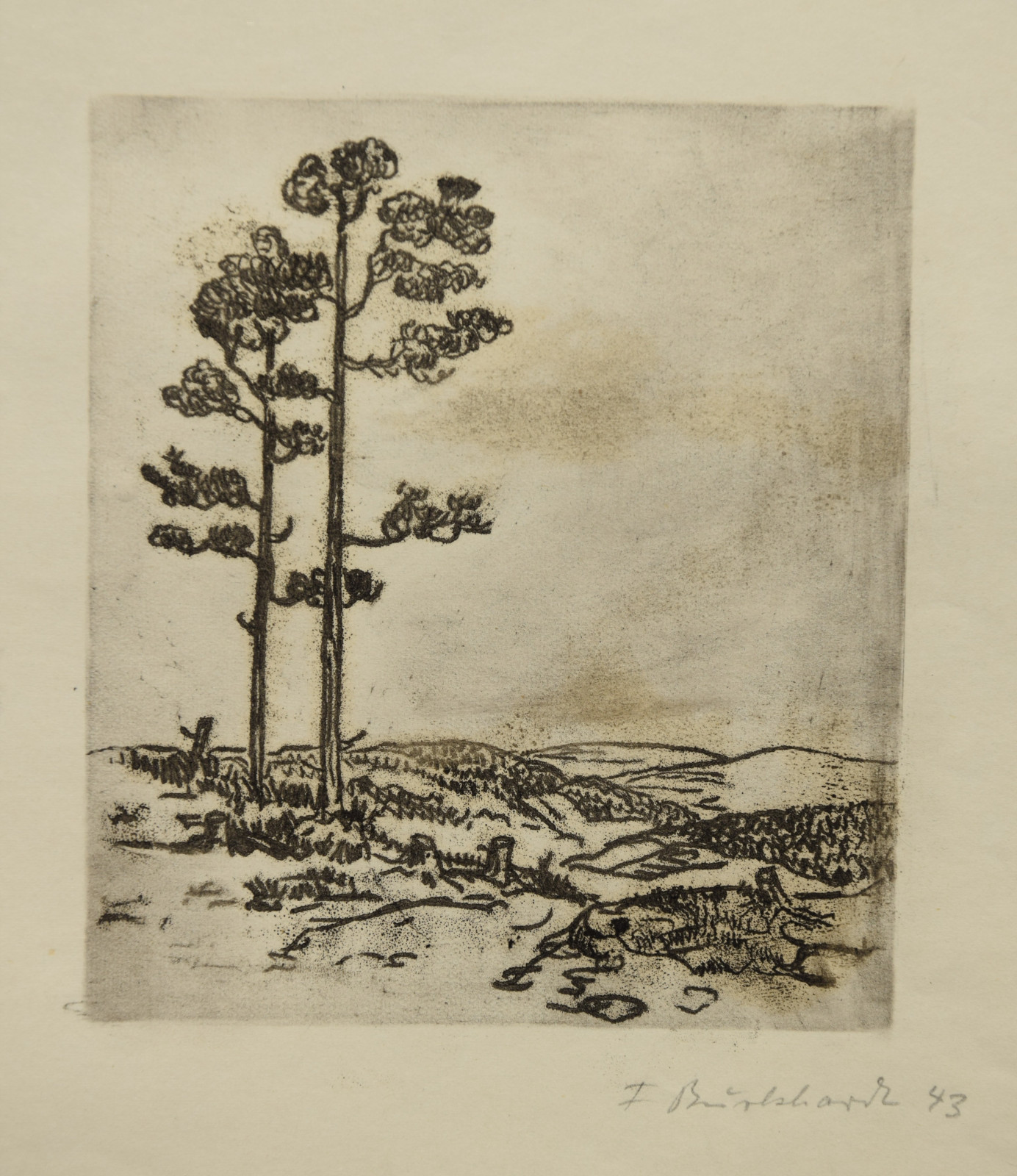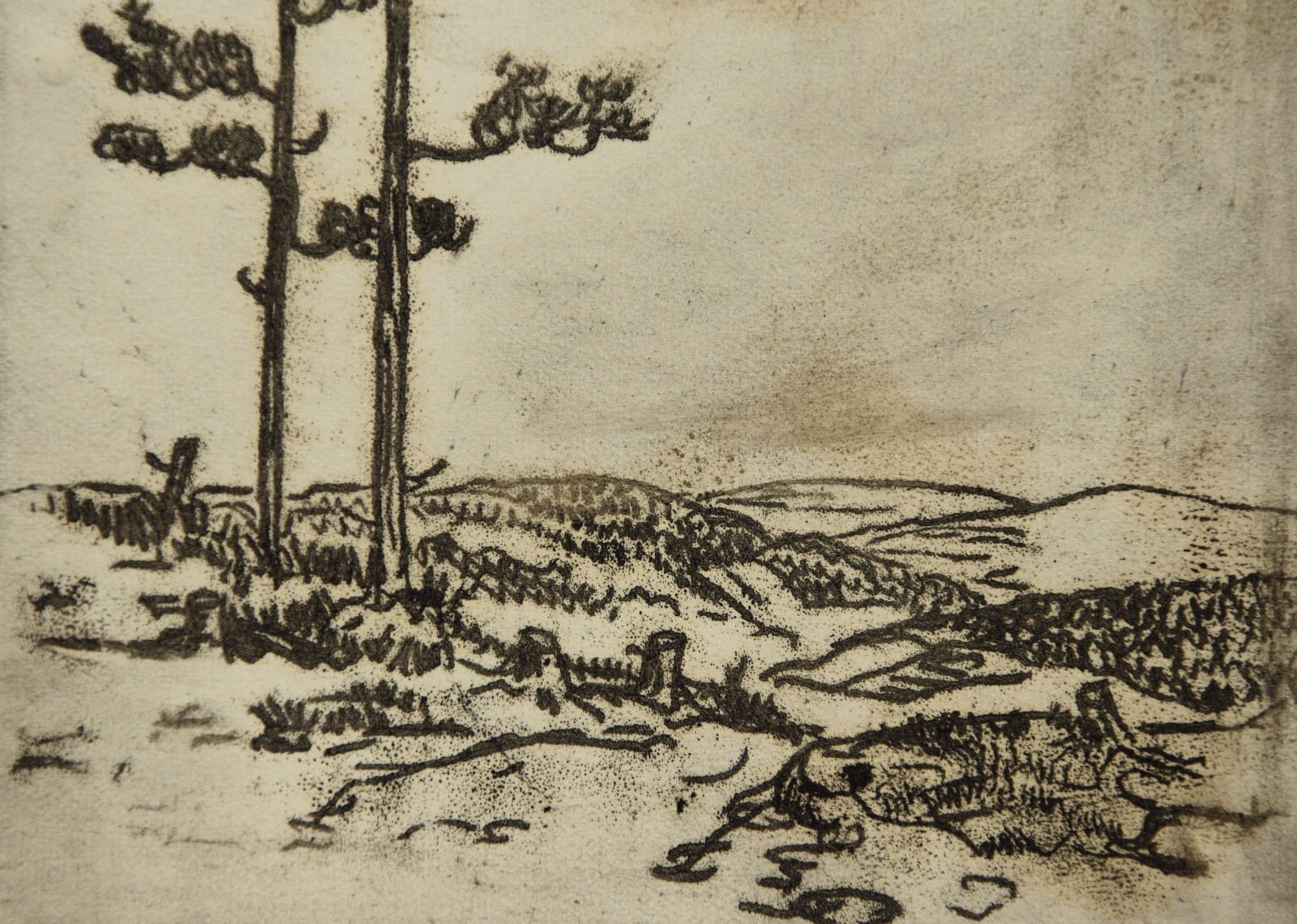 weite, hügelige (Wald-)Landschaft, im Vordergrund zwei Kiefern (1943)